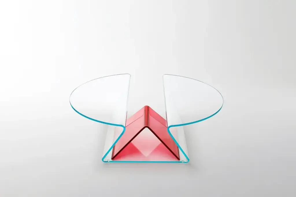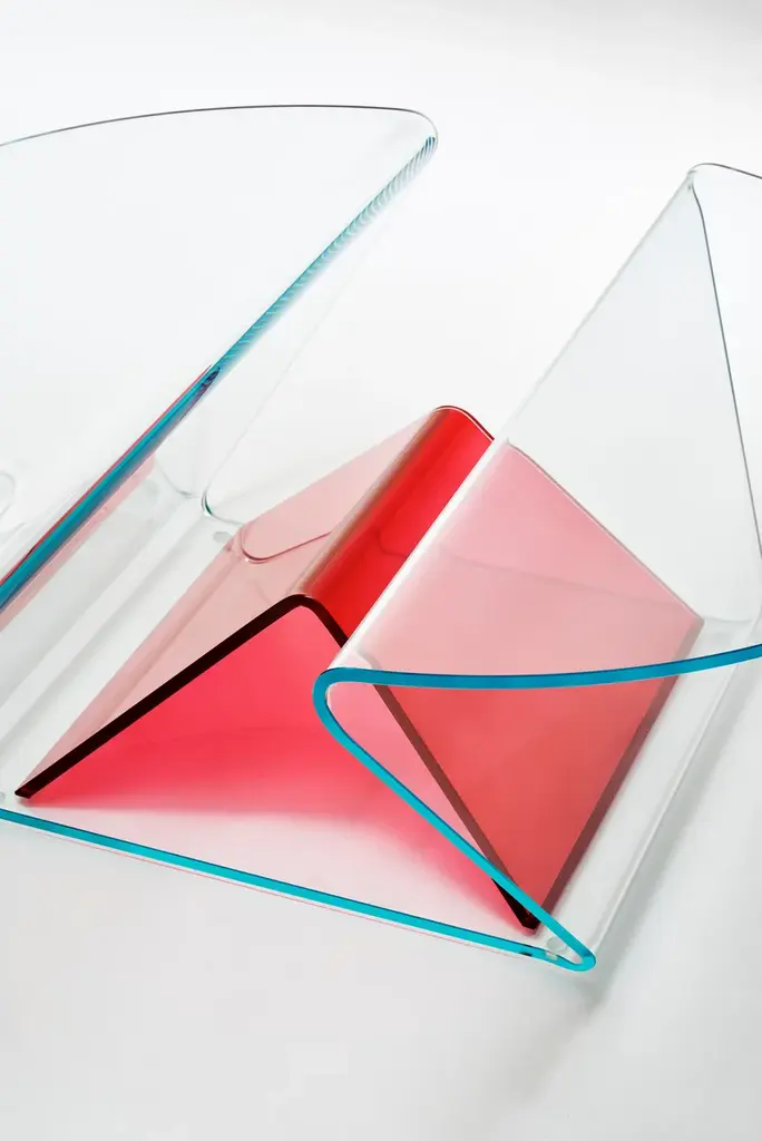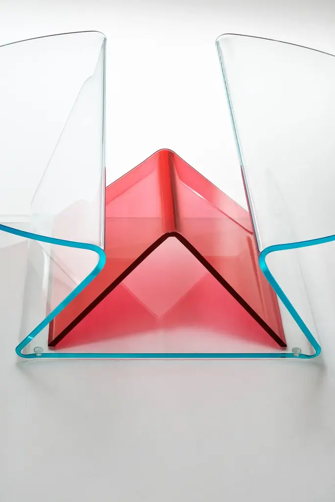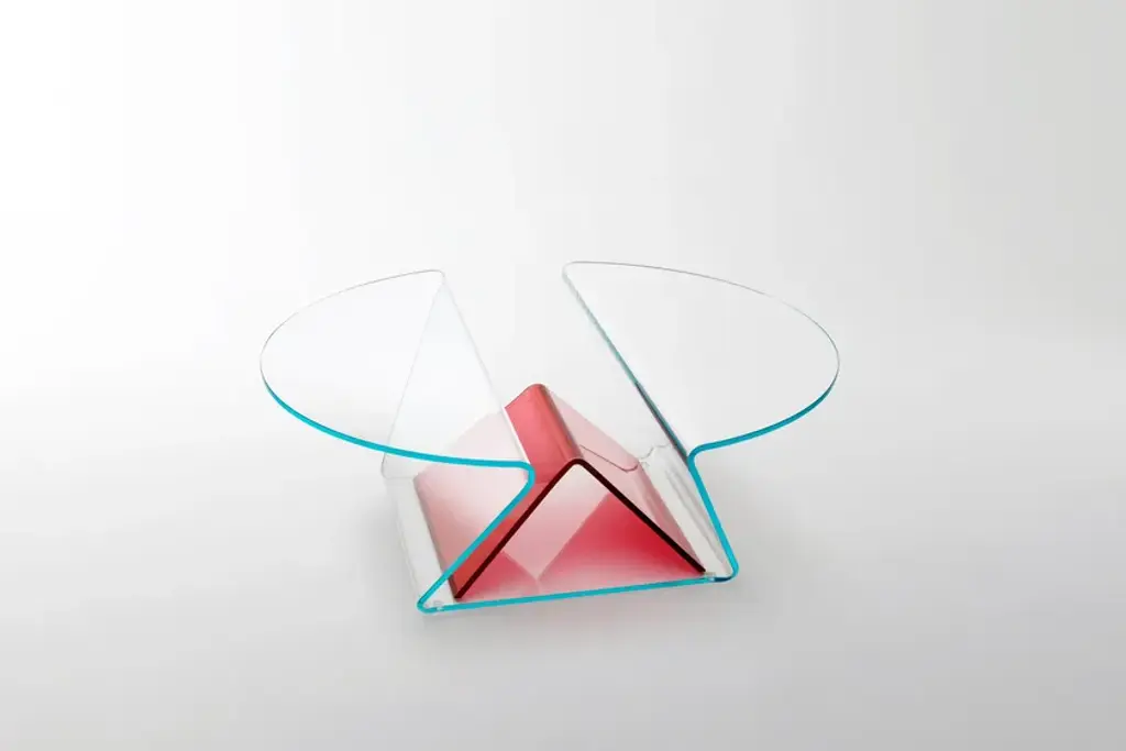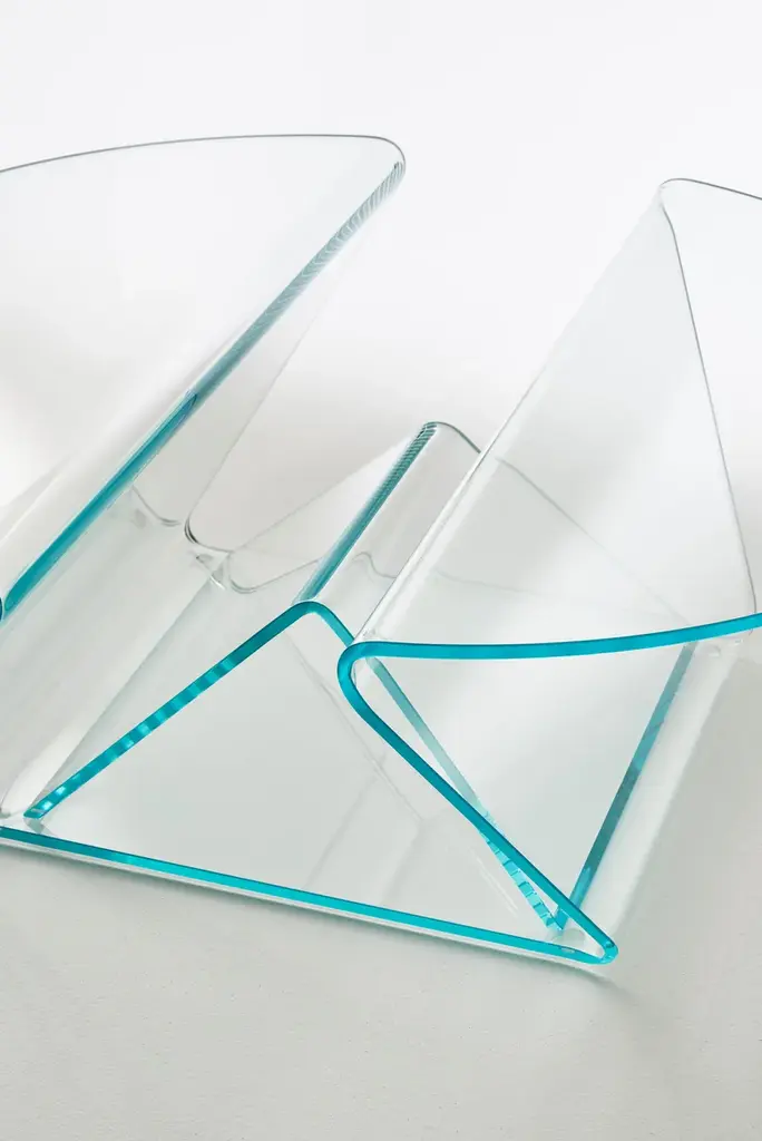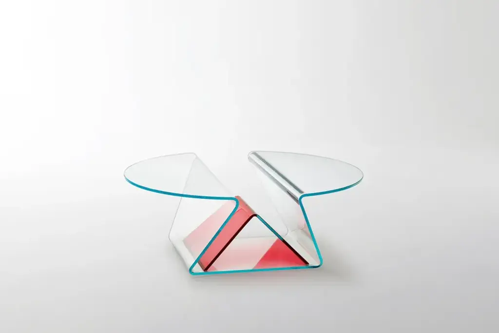 Plissé is a extremely functional low table with a light aspect and soft and gentle shapes in 12 mm extralight glass, shaped and curved thanks to a complex process of glass bending, obtaining two cantilevered tops separated by a practical compartment where objects can be stored.Positioned in the centre is a functional magazine rack element made of curved glass with a reversed-V shape in transparent transparent colours ruby red, blue, emerald green or transparent extralight.