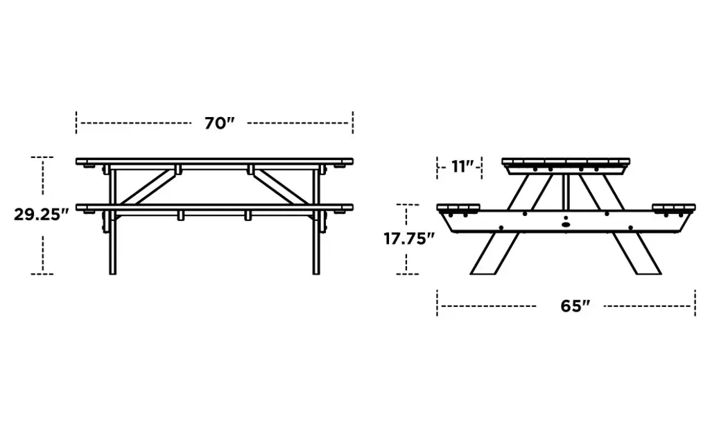 This classic picnic table will stand up to high traffic year after year, and look good doing it. POLYWOOD furniture is constructed of solid POLYWOOD lumber that's available in a variety of attractive, fade-resistant colors. It won't splinter, crack, chip, peel or rot and it never needs to be painted, stained or waterproofed. It's also designed to withstand nature's elements as well as to resist stains, corrosive substances, salt spray and other environmental stresses. Best of all, POLYWOOD furniture is made in the USA and backed by a 20-year warranty.Constructed of genuine POLYWOOD lumber, a proprietary blend of plastics which includes recycled milk jugs and detergent bottlesPOLYWOOD lumber requires no painting, staining, waterproofing, or similar maintenanceSolid, heavy-duty construction withstands nature's elementsPOLYWOOD lumber does not splinter, crack, chip, peel or rot and it is resistant to corrosive substances such as oil, salt spray and other environmental stressesMarine-grade quality hardwareEasy to clean with soap and waterResistant to stains associated with wine and condimentsAvailable in a variety of attractive, fade-resistant colors20-year residential warranty; 3-year commercial warrantyMade in the USATable outfittedwith 1.625" center hole for standard umbrella (sold separately); hole cover included