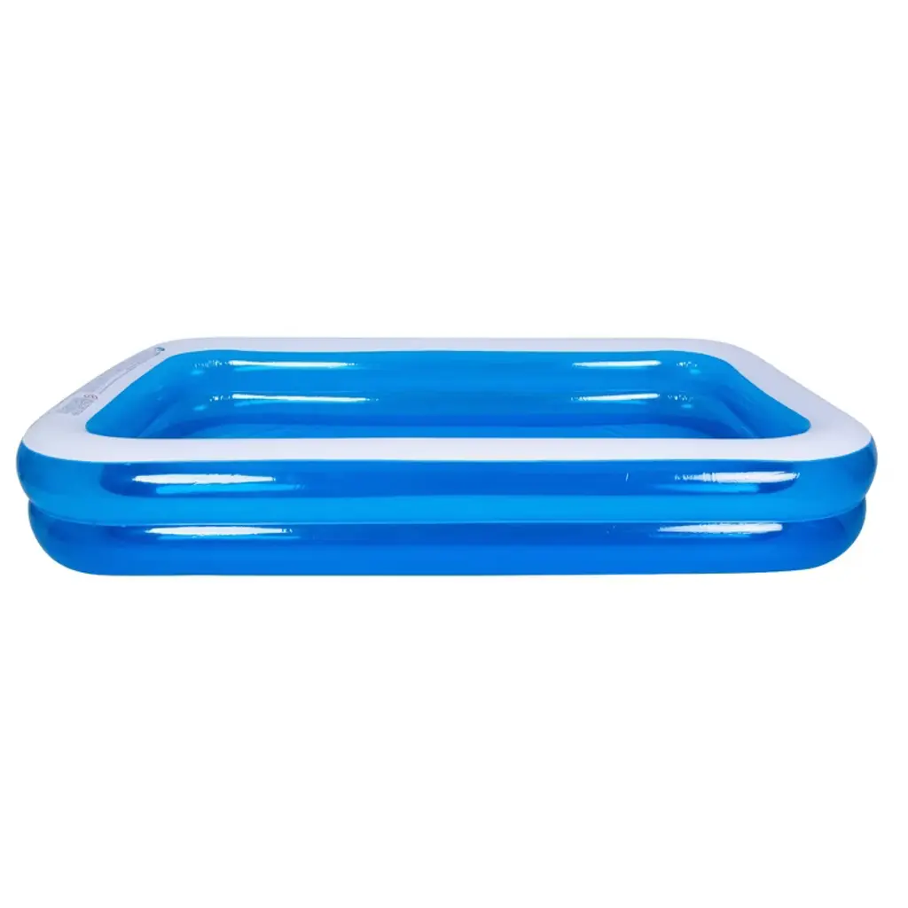 Good times are here with this spacious, fun, inflatable pool that is big enough for the whole family to enjoy. The comfortable, wide sidewalls allow for ultimate lounging to make your summer experience unforgettable. This will become a quick, backyard favorite all summer long. Product Features: Royal blue and white inflatable swimming pool This pool has a sturdy 2-ring construction Made with heavy-duty vinyl The pool is rectangle in shape Suitable for ages 6 and up Dimensions: 10 feet long x 6 feet wide Depth: 20 inches Material(s): vinyl