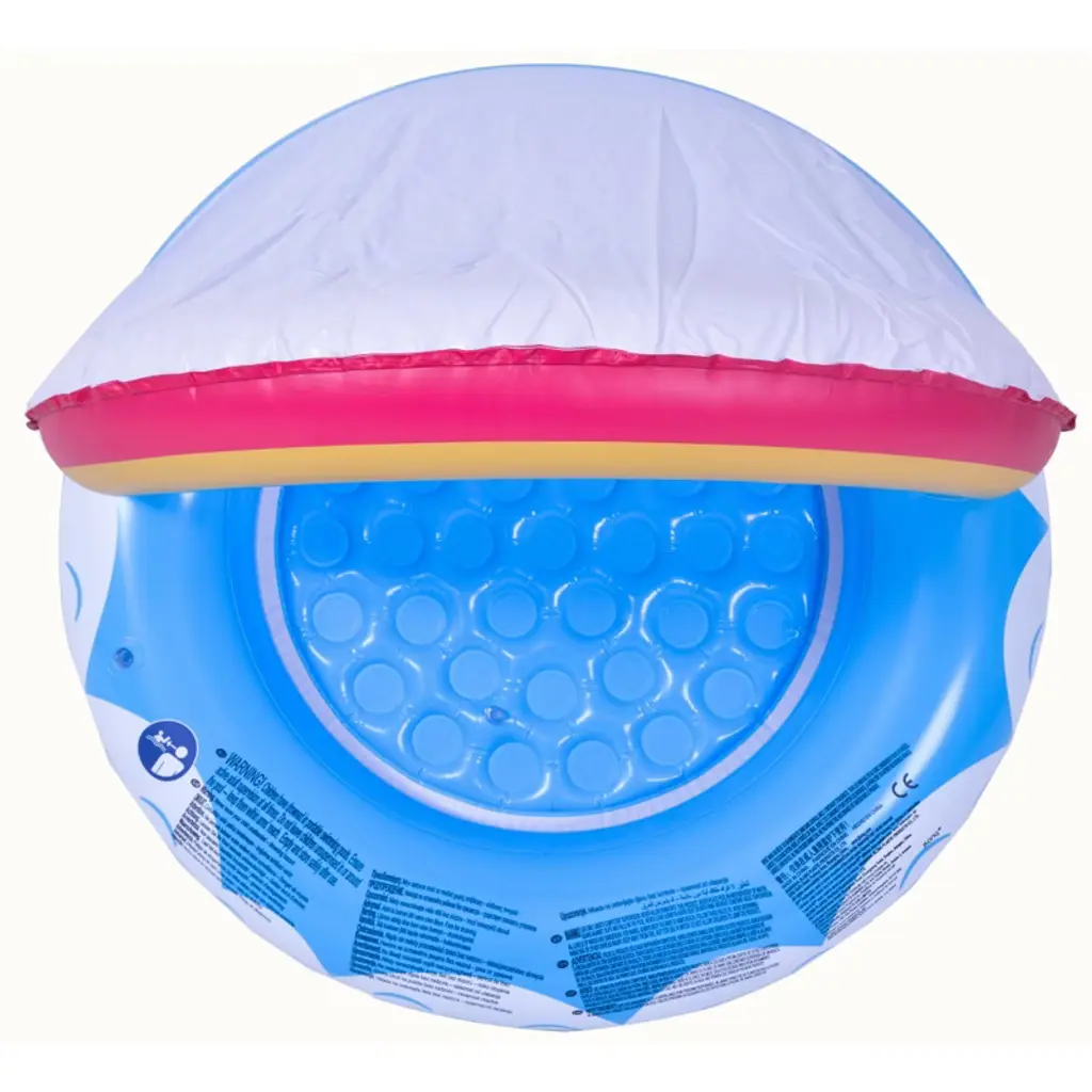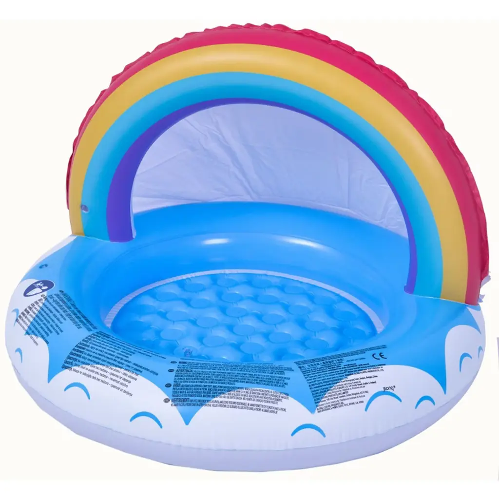 Introduce your little one to the water with this fun swimming pool. This adorable pool has a padded bottom for maximum comfort. The pool has a canopy that looks like a rainbow to protect your little one's delicate skin. Just simply inflate and fill with water for hours and hours of endless fun. Product Features: Inflatable rainbow canopy baby swimming pool Water capacity: 10 gallons Recommended weight: 24-39lbs Comes with 1 repair patch Does not come inflated Recommended for kids ages 1-3 years old Dimensions: 37" high by 26" diameter Material(s): vinyl