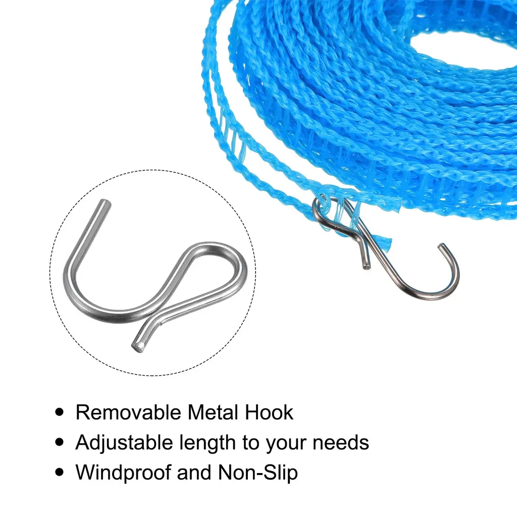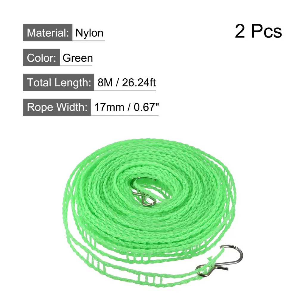 Description:Material - This type of clothesline is woven from nylon rope, which is sturdy, wear-resistant, not easy to age and has a strong load-bearing capacity and long service time.Portable and Lightweight - Easy to store and not occupy space, convenient to carry for travel, camping, etc outdoor activities.Easy to Fasten - Wrap the rope around any place which can withstand the weight of the things you dry and fix it with both side hooks.Windproof and Non-Slip - With fixed position hanging holes design that has convenience for drying clothes by using hangers and to achieve windproof and non-slip. The clothes will not pile up due to strong wind, in case affect the drying speed.Wide Application - Our portable clothesline can be attached anywhere: such as balcony, courtyard, hotel, RV, boat, trees, etc. Great for travel, camping, outdoor and indoor to dry clothes, bed sheets, blankets, towels, scarves and more.Warm Tip - Please wrap the rope a few more times to fasten the clothesline straightly and tightly. So that it will not easy to bend when hanging heavy clothes.Specification:Material: NylonTotal Length: 8M/26.24ftRope Width: 17mm/0.67inchPackage Content:2 x Clothesline