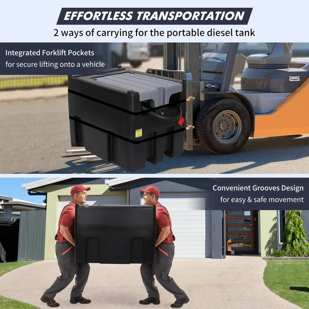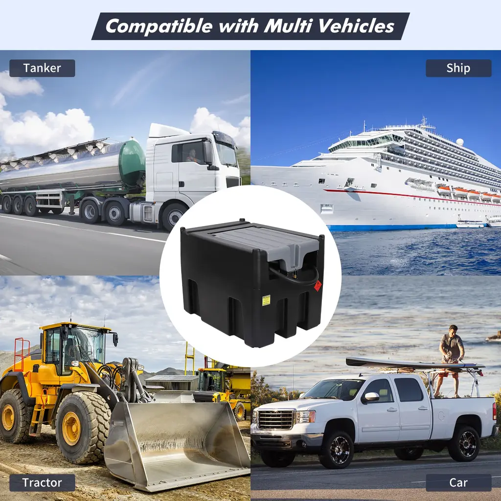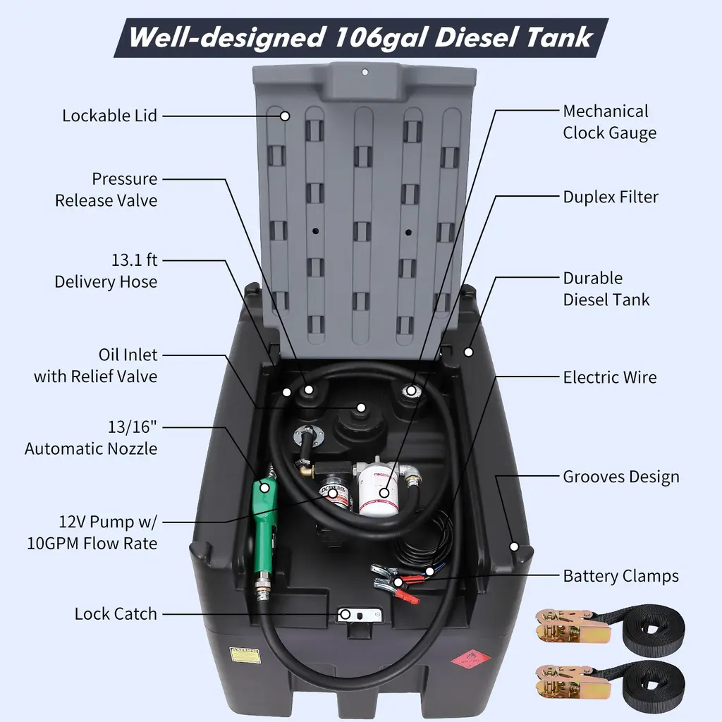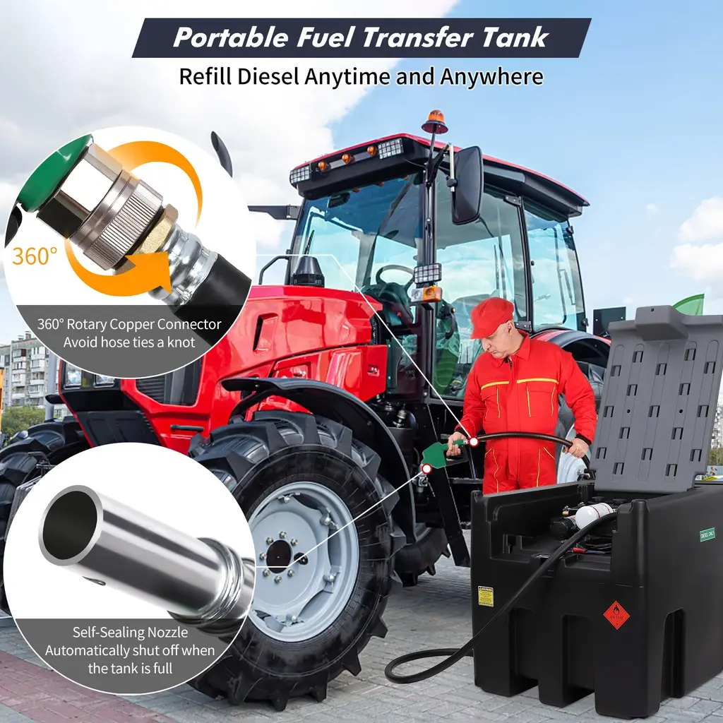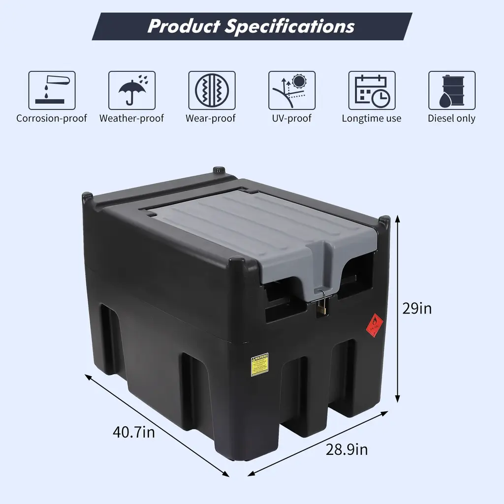 【Effortless Fuel Transfer】Experience seamless fuel transfer with this 116-gallon diesel tank. Its PE material and weather-resistant design ensure long-lasting performance. The secure lid and brass lock provide peace of mind against external elements. 【Powerful Pump Performance】Equipped with a 140W 12V DC pump, this fuel caddy offers a swift 10 GPM flow rate for efficient fuel transfer. Enjoy reliable power output for quick refueling. 【Smart Fuel Management】Say goodbye to waste with the automatic dispensing nozzle that stops when the tank is full. The 360-degree adapter saves time and prevents hose tangling for hassle-free operations. 【Convenient Daily Usage】Connects effortlessly to your truck's battery for easy operation. The mechanical gauge accurately displays fuel levels, while the 13.1ft hose and cable provide remote power access. 【Secure and Portable Design】Featuring bottom grooves for easy lifting and two complimentary straps for stability, this diesel tank ensures secure transport without tilting or shaking.