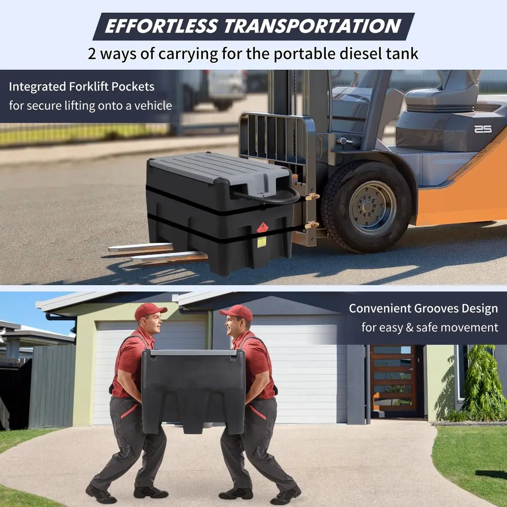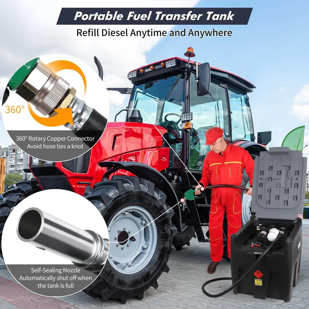 【High-Capacity, High-Quality】This 58 Gallon capacity diesel fuel tank can stores enough fuel for multiple vehicles. The fuel pump tank is made of polyethylene(PE), which is strong and stable and can prevent the diesel fuel can from leaking and deformation. The strong lid on the top also protects the fuel caddy well from rainwater intrusion, which can cause rust and corrosion inside. 【12V DC Pump】Flow Rate: 10 GPM; Output Power: 140W. The 12V electric fuel transfer pump delivers up to 10 gallons per minute. The diesel gauge show clearly how much fuel is in the tank. Plus, you don't need a separate battery; the clamp connects directly to your truck's battery. Note: For Diesel Only. 【13/16" Automatic Dispensing Nozzle】The nozzle is made of high-quality aluminum alloy, and it has good characteristics of electrical conductivity to avoid static electricity for safety. The fueling nozzle will shut off automatically when the diesel transfer tank with pump is full, which efficiently prevents leaking and wasting. The 360-degree adapter can effectively avoid the hose from knotting. 【13.1 FT Delivery Hose & Wire】The fuel hose for this diesel fuel storage and transfer tank is made of rubber, which has better aging resistance and mechanical properties than the average hose on the market. The length of both the cable and the fuel hose is 13.1 feet, which is perfectly suited for everyday use. 【Secure & Easy Transportation】Our the portable fuel can is designed for fuel transportation and supply. The two grooves make this diesel caddy easy and secure to transport. And the integrated forklift pocket design ensures stable lifting onto a vehicle. Two additional complimentary straps ensure safer transportation.