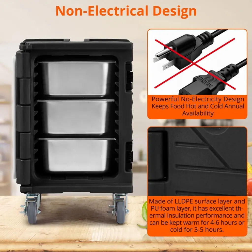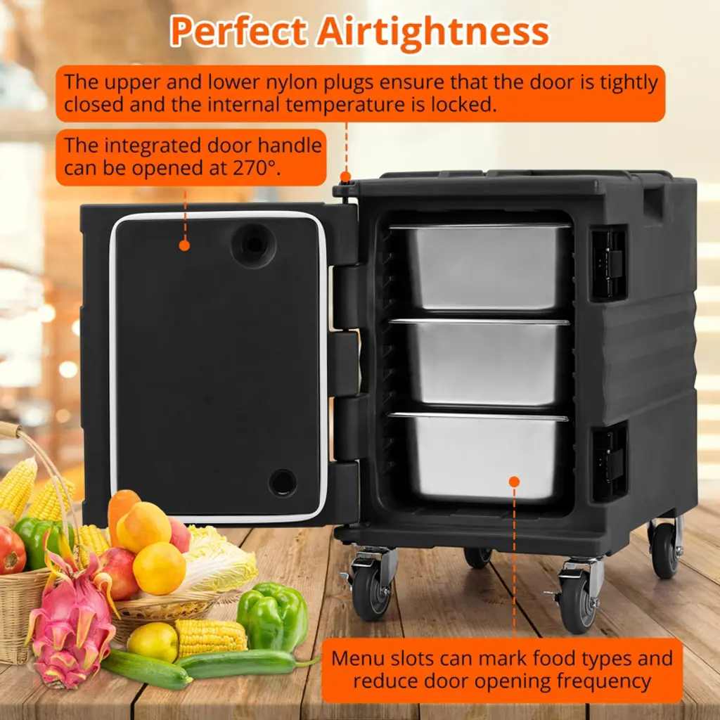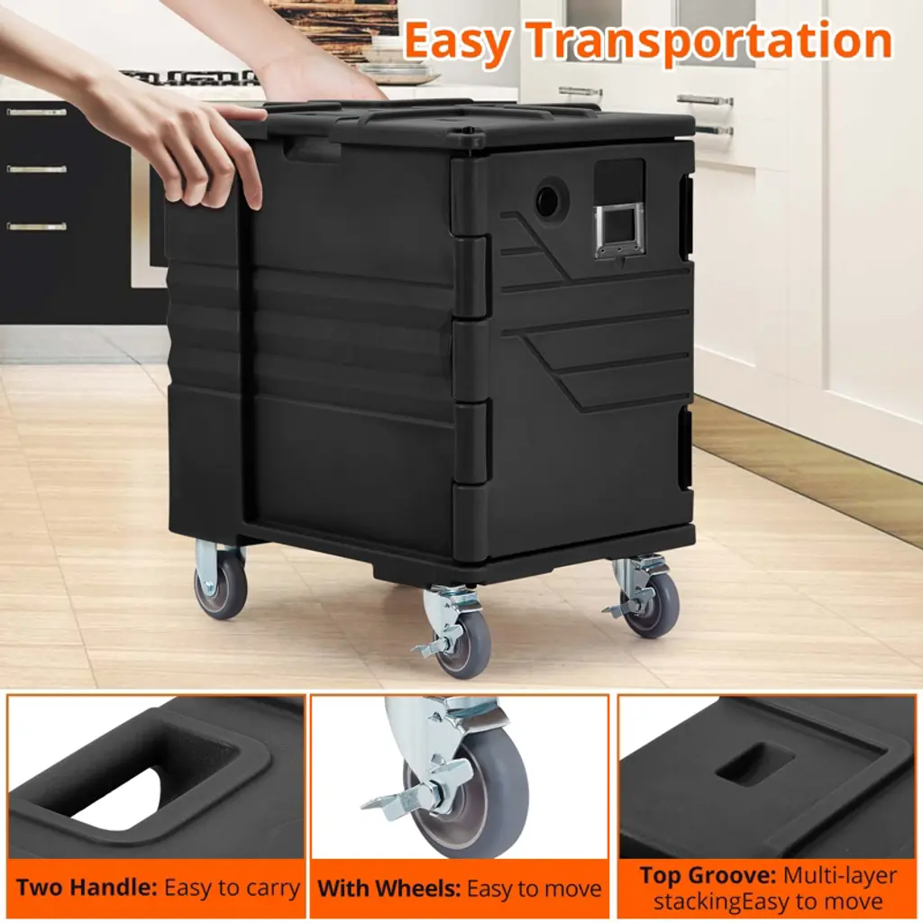 Introducing the 1Pcs LLDPE+PU Vertical Food Tray Insulated Box 90L, designed to meet the highest standards of durability, portability, and convenience. Crafted from premium LLDPE and PU materials, this insulated box offers exceptional strength and long-lasting performance, making it ideal for both commercial and personal use.The vertical design maximizes storage capacity while minimizing footprint, allowing you to efficiently organize and transport food trays without compromising space. Equipped with universal casters, this box ensures smooth and effortless mobility across various surfaces, making it perfect for busy kitchens, catering events, and food delivery services.Built to the US Standard, this insulated box guarantees reliable temperature retention, keeping your food fresh and safe for extended periods. Its easy-to-clean surface simplifies maintenance, saving you valuable time and effort.Key Features:- Vertical design optimizes storage space and accessibility- Durable LLDPE and PU construction for enhanced strength and longevity- 90L capacity accommodates multiple food trays- Universal casters provide smooth and versatile mobility- Meets US Standard for insulation and quality- Portable and lightweight for easy handling- Easy to clean, ensuring hygienic useWhether you're a professional caterer or someone who values quality food storage solutions, this insulated box is your perfect companion. Invest in the 1Pcs LLDPE+PU Vertical Food Tray Insulated Box 90L today and experience superior durability, convenience, and performance in one compact package.