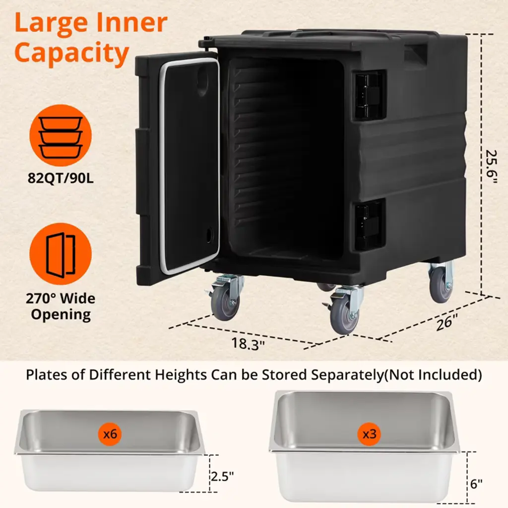 Portable Food Warmer, 82 Qt Hot Box, Large Inner Capacity, Universal Wheel, Compatible With 3/6" Or 6/2.5" Plates, (Universal Wheel), Black