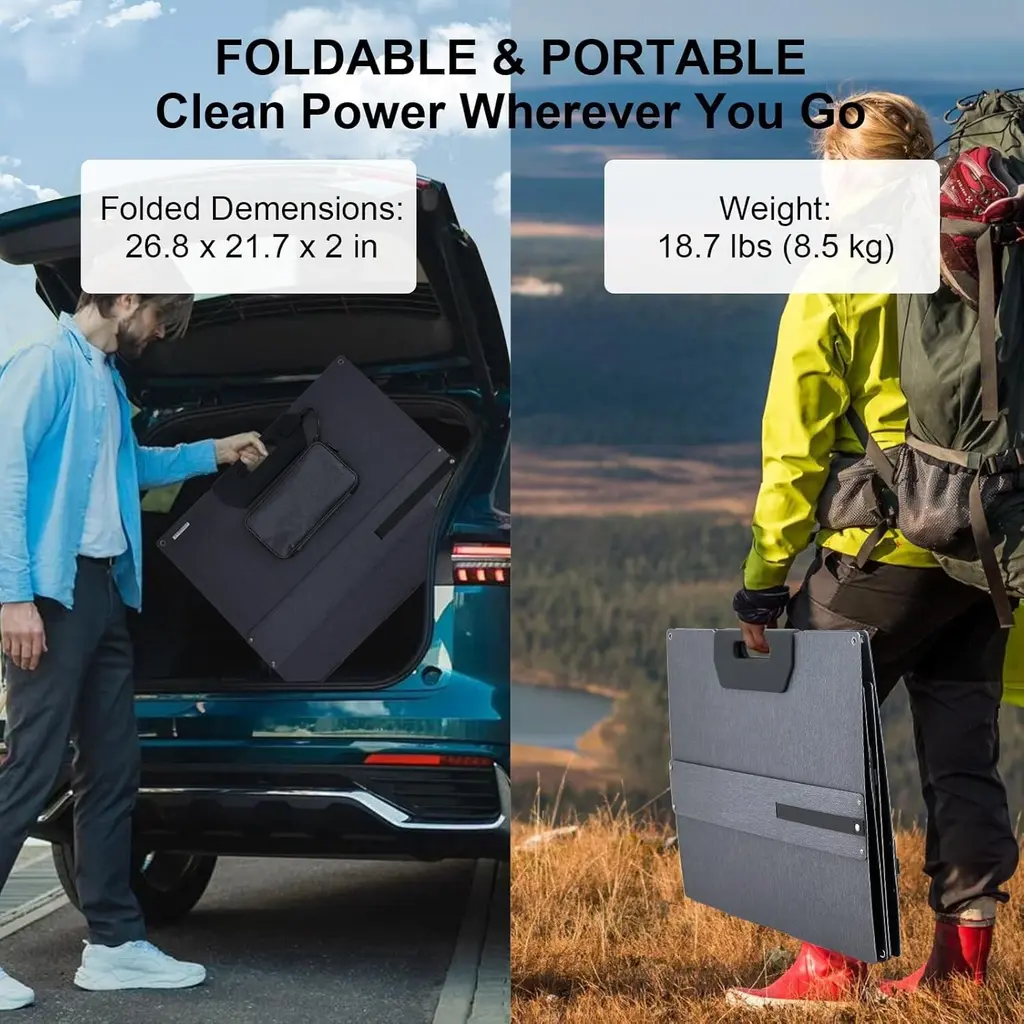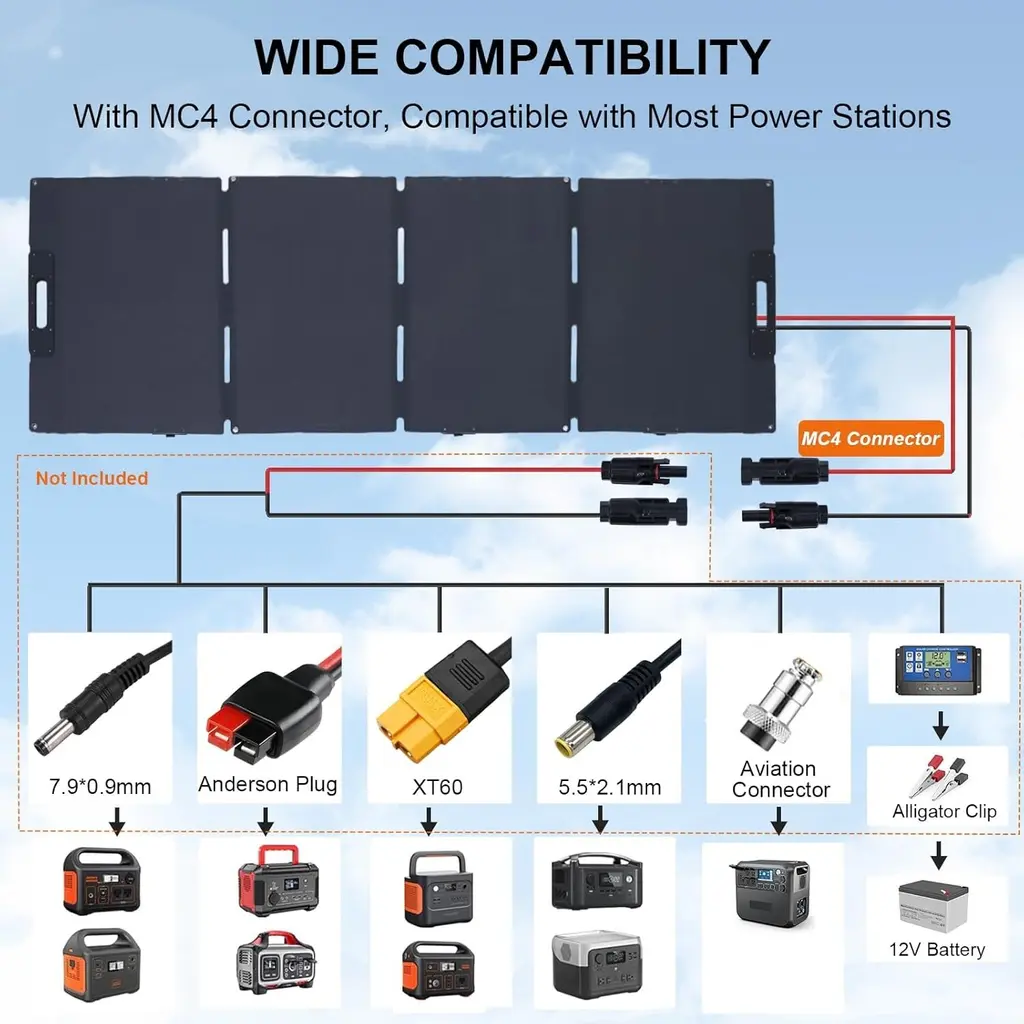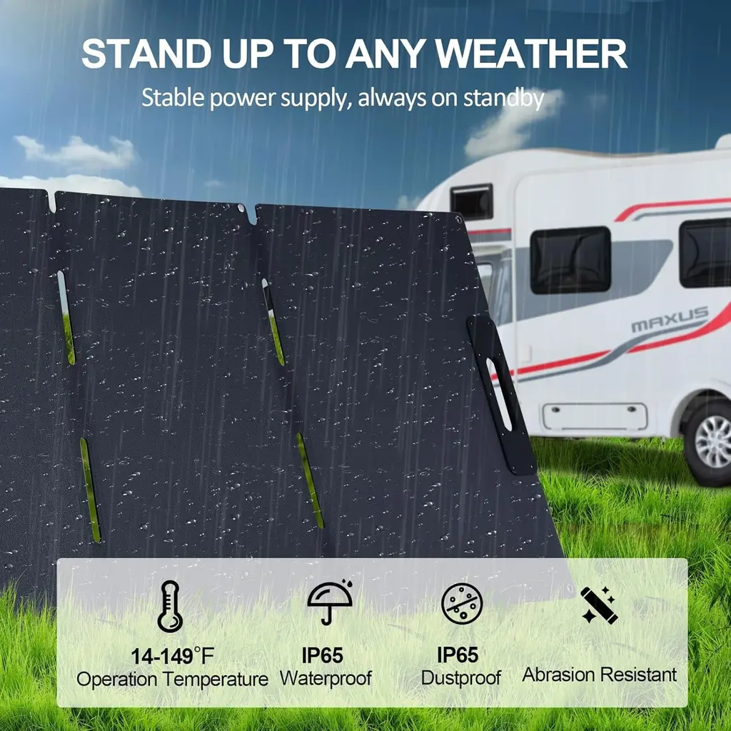【Output & Compatibility】The foldable solar panel features a controller with MC 4 outputs compatible with most phones and laptops, ensuring compatibility with most outdoor power stations.【Portable & Foldable】Designed for portability, the solar charger features a lightweight, four-fold design with a built-in zippered accessory pouch. Once unfolded, 3 kickstands allow for easy positioning on any flat surface, you can adjust its angle to maximize sunlight absorption. Reinforced grommets provide additional mounting capabilities, they can hang on your RV or tent. The magnetic handle design is convenient for easy folding and storage, it looks like a briefcase easy to transport. Note: This solar panel cannot store electricity.【Waterproof & Durable】With an IP65 rating for water and dust resistance, the foldable solar panel can withstand various weather conditions. The advanced multi-layered ETFE lamination extends the lifespan of this camping solar panel. (Please avoid soaking the control box in water.)【23.5% Efficiency & Safety Protection】Covered by high-efficiency monocrystalline silicon solar cells, this foldable solar panel achieves a maximum efficiency of 23.5%. The built-in smart chip intelligently identifies your device, maximizing charging speed while protecting against overcharging and overloading.【Please Note】Some mobile portable power stations have a maximum input power limit. Even when using our solar panels under optimal sunlight conditions, the power received will not exceed the maximum input power limit. However, this does not indicate that the output power of our portable solar panels is insufficient. Before placing an order, please double-check the model of your mobile power station and check whether it has a maximum input power limit.WHAT YOU GET: 1 x solar panel, 1 x user manual