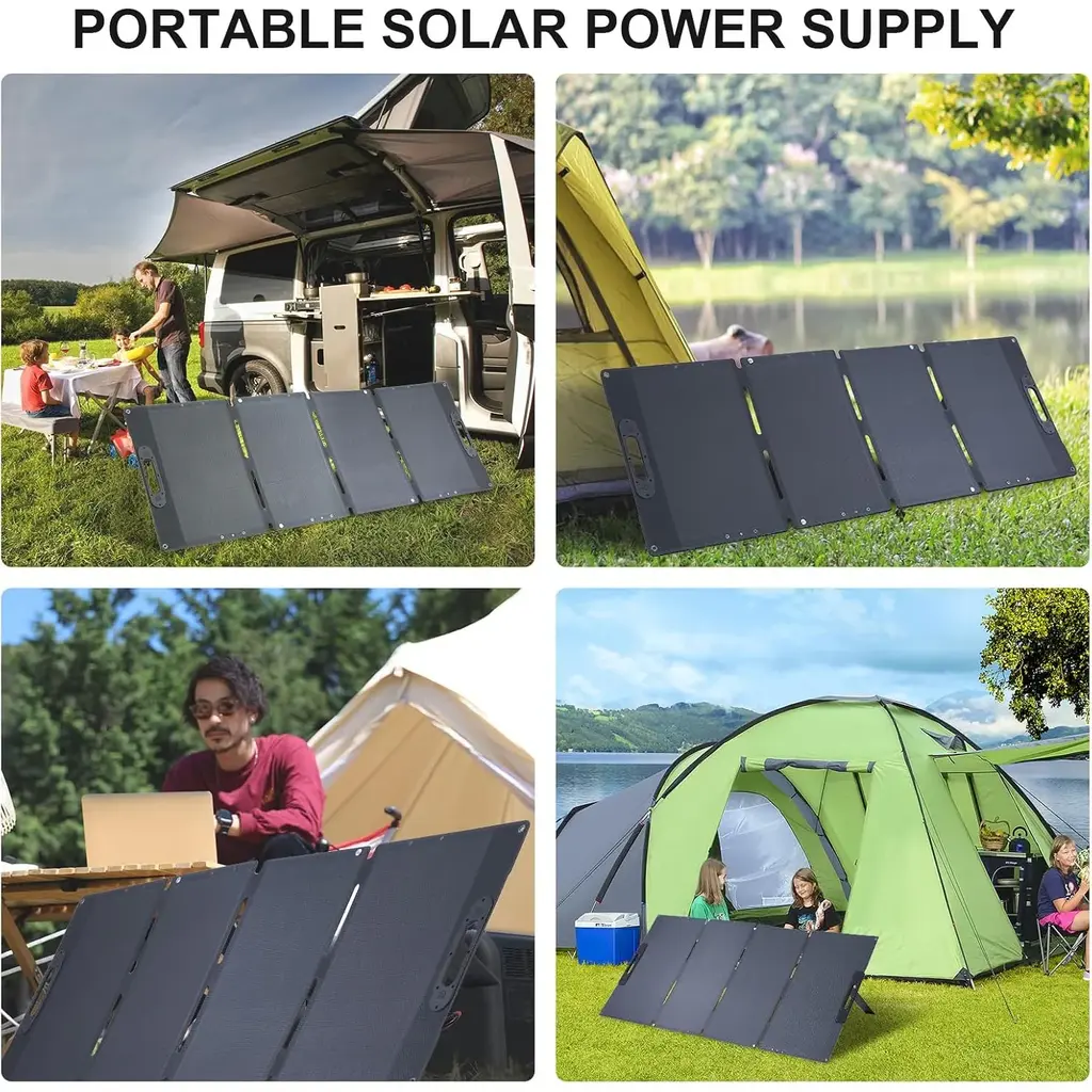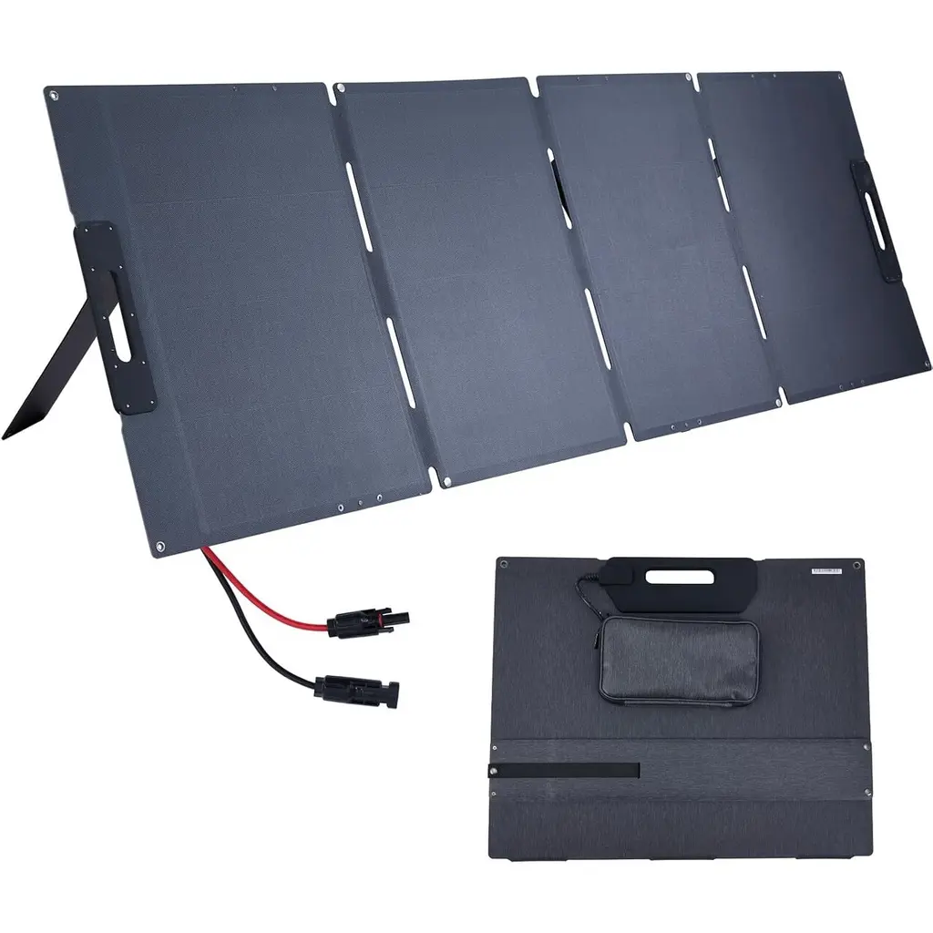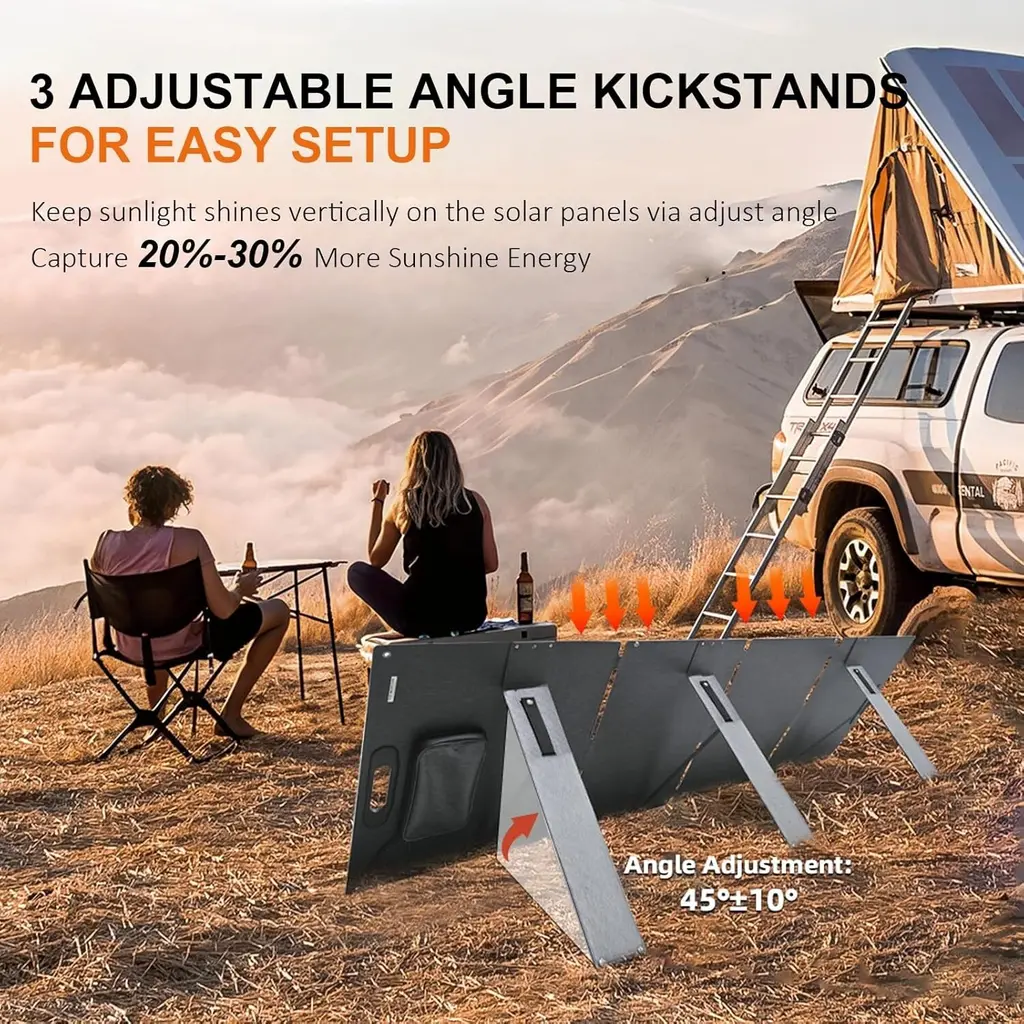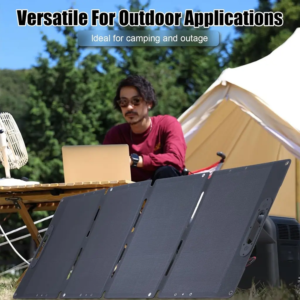 【Output & Compatibility】The foldable solar panel features a controller with MC 4 outputs compatible with most phones and laptops, ensuring compatibility with most outdoor power stations.【Portable & Foldable】Designed for portability, the solar charger features a lightweight, four-fold design with a built-in zippered accessory pouch. Once unfolded, 3 kickstands allow for easy positioning on any flat surface, you can adjust its angle to maximize sunlight absorption. Reinforced grommets provide additional mounting capabilities, they can hang on your RV or tent. The magnetic handle design is convenient for easy folding and storage, it looks like a briefcase easy to transport. Note: This solar panel cannot store electricity.【Waterproof & Durable】With an IP65 rating for water and dust resistance, the foldable solar panel can withstand various weather conditions. The advanced multi-layered ETFE lamination extends the lifespan of this camping solar panel. (Please avoid soaking the control box in water.)【23.5% Efficiency & Safety Protection】Covered by high-efficiency monocrystalline silicon solar cells, this foldable solar panel achieves a maximum efficiency of 23.5%. The built-in smart chip intelligently identifies your device, maximizing charging speed while protecting against overcharging and overloading.【Please Note】Some mobile portable power stations have a maximum input power limit. Even when using our solar panels under optimal sunlight conditions, the power received will not exceed the maximum input power limit. However, this does not indicate that the output power of our portable solar panels is insufficient. Before placing an order, please double-check the model of your mobile power station and check whether it has a maximum input power limit.WHAT YOU GET: 1 x solar panel, 1 x user manual