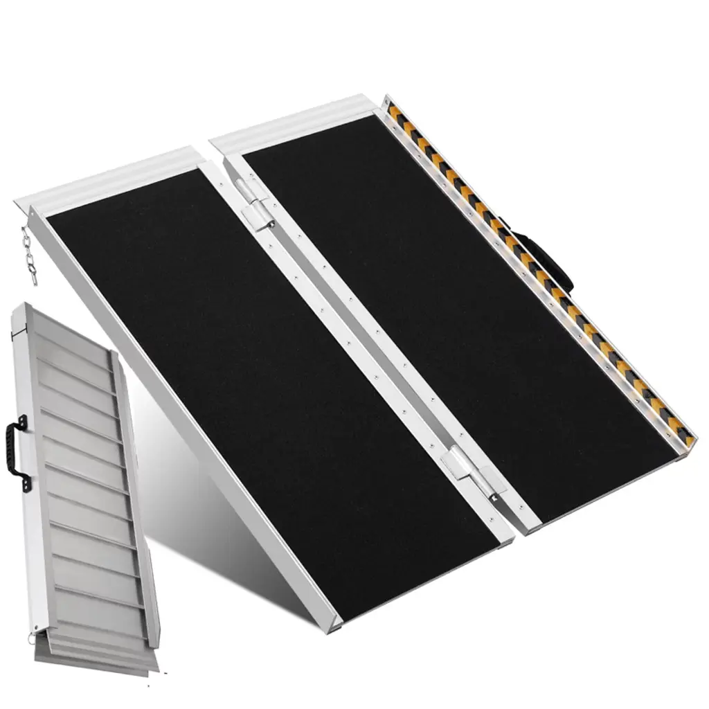 Lightweight & Portable Design: Constructed from high-quality aluminum, this foldable ramp offers the perfect combination of durability and lightweight convenience. Its updated comfortable handle enhances mobility, making transportation effortless while reducing the risk of hand injuries. Enhanced Non-Slip Design: The ramp features a dual non-skid protection system, including a textured aluminum surface and an additional non-slip layer, ensuring maximum grip and safety during use. It also includes screws for secure attachment to wooden platforms, providing added stability. Safety First Features: Prioritizing user safety, the ramp is equipped with corrosion-resistant stainless steel hinges and side baffles that prevent accidental slips or falls. Reflective warning stickers enhance visibility, while transition plates facilitate smoother entries and exits, minimizing the risk of accidents. High Weight Capacity: Engineered for robust performance, this portable aluminum ramp can safely support up to 800 lbs. Its strength makes it ideal for a variety of mobility aids, including scooters, wheelchairs, and walkers, ensuring a safe and reliable experience for a wide range of users. Multi-Use Application: This versatile ramp is designed to help users overcome obstacles around the home, including stairs, steps, curbs, and doorways. By improving accessibility, it empowers individuals with mobility challenges, offering greater independence and ease of movement in daily life.