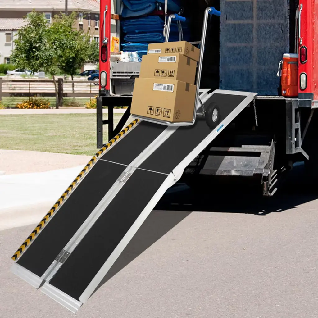 Portable Folding Wheelchair Ramp with Double Non-Slip Surface - 600lb CapacityProduct Description:Convenient Foldable Design with Carrying HandleThis portable wheelchair ramp features an innovative folding design that allows for compact storage and easy transportation. Equipped with a comfortable carrying handle, the ramp can be quickly installed, removed, and carried to different locations, making it ideal for both home use and travel.Dual Non-Slip Safety SurfaceDesigned with double safety protection featuring a black matte non-slip surface covering and additional anti-slip texture on the threshold boards. This dual safety system ensures superior traction and prevents slipping in all weather conditions, providing secure passage for users.Heavy-Duty Aluminum ConstructionBuilt from high-grade lightweight aluminum alloy with a remarkable 600lb weight capacity. The ramp incorporates reinforced structural design with safety flaps and reflective strips for enhanced visibility and accident prevention. The bottom transition plate ensures smooth passage without catching or jamming.Versatile Multi-Application UseSuitable for various indoor and outdoor applications including stairs, garage steps, door thresholds, curbs, and vehicle access. Ideal for wheelchairs, scooters, pushchairs, carts, and unloading trucks. Provides accessibility solutions for homes, vehicles, and public spaces.Smart Size Selection GuideFeatures comprehensive sizing guidance for optimal usability: 5-10 foot ramps are heavier for permanent home entrances, while 2-4 foot ramps are lighter for curbs and steps. Includes angle recommendations: 5¡ã for manual wheelchairs, 7¡ã for electric wheelchairs, 10¡ã for pushchairs, and 14¡ã for carts.Specifications:Material: Aircraft-grade Aluminum AlloyColor: BlackDimensions: 182L x 71W x 35H cm (when unfolded)Weight: 35.45 PoundsLoad Capacity: 600 lbsSpecial Features: Foldable, carrying handle, reflective stripsSafety Features: Double non-slip surface, safety flaps, transition plateApplications: Wheelchairs, scooters, pushchairs, carts, thresholdsNote: Minor temporary deflection during use is normal and quickly recovers