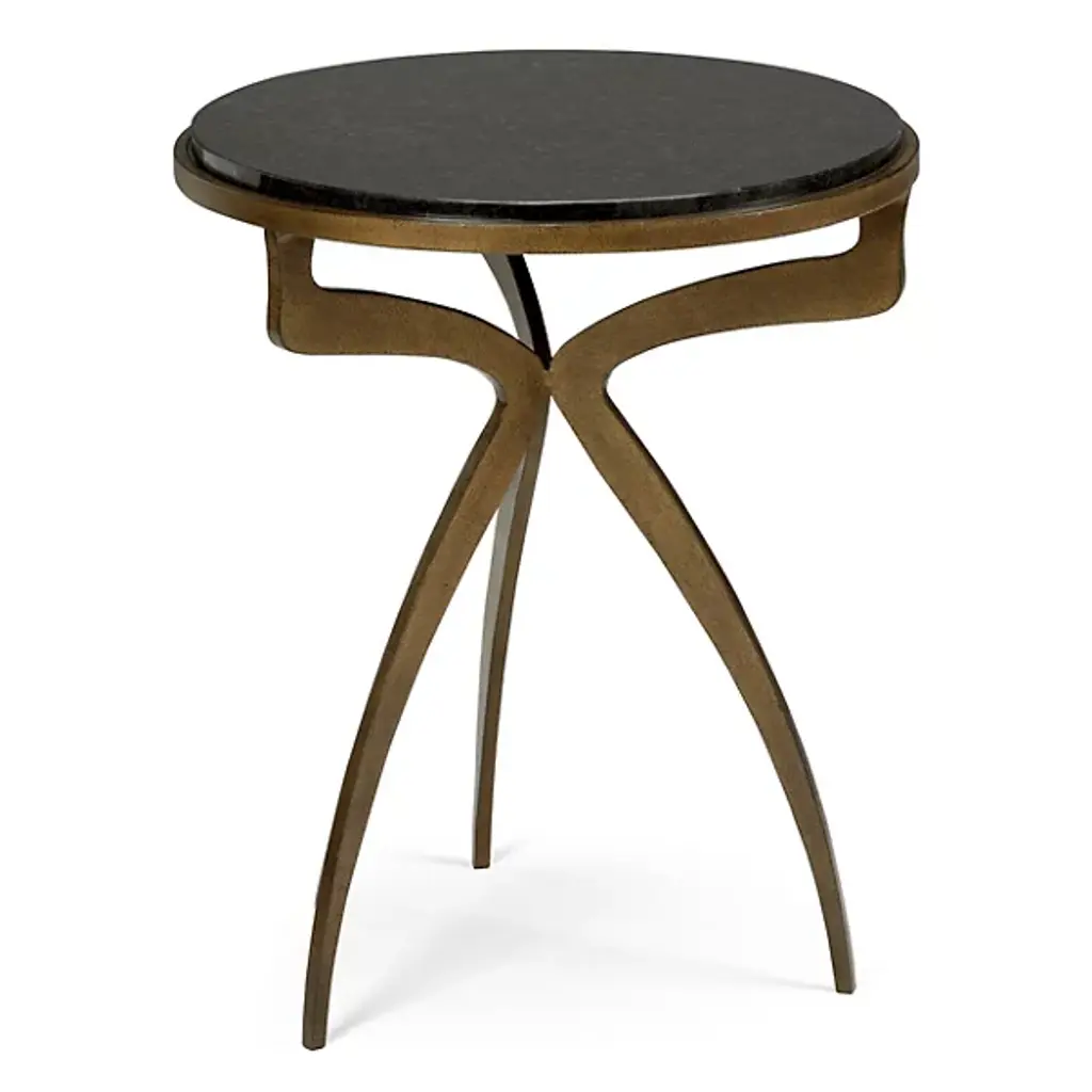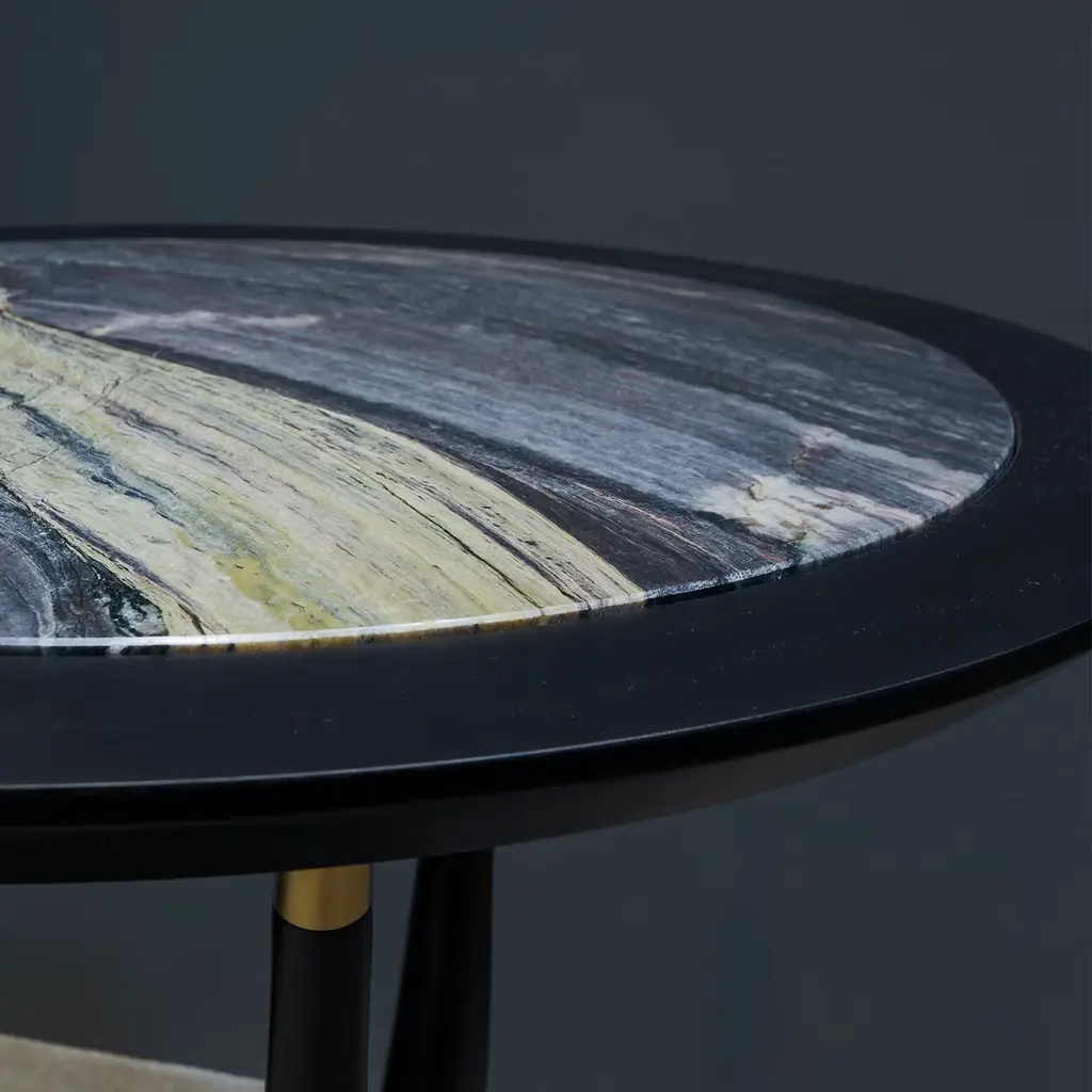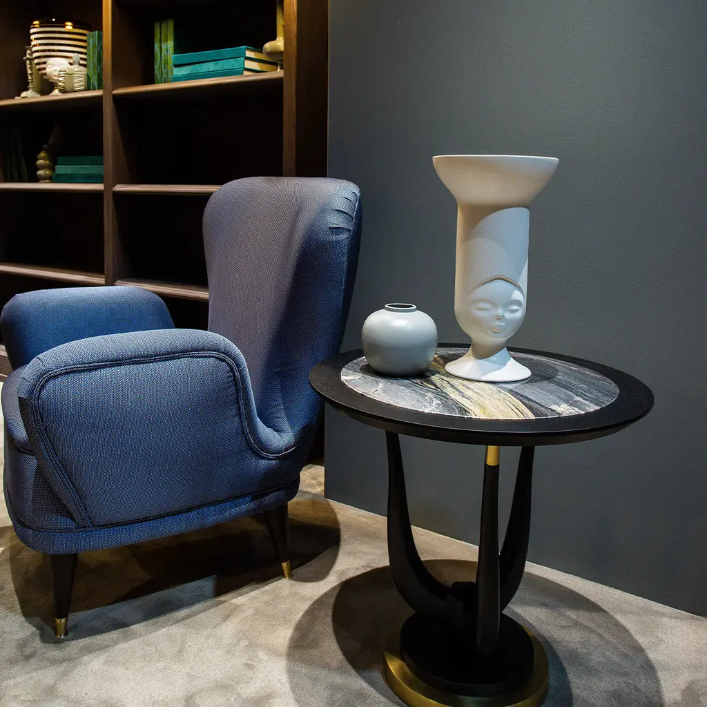 The small Poseidon table is composed of a base in satin brass, from which three sinuous legs in solid wood matt black lacquered branch out, supporting the Explosion Blu marble top like a trident. The thin profile of the legs gives the project an almost airy lightness, contrasting with the authoritative structure of the top and base.