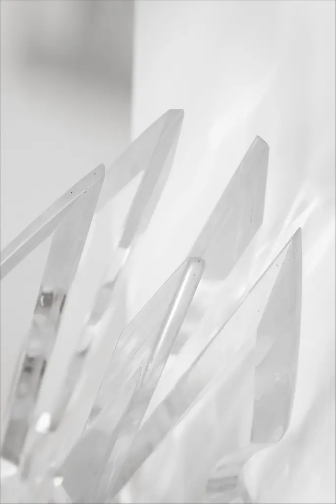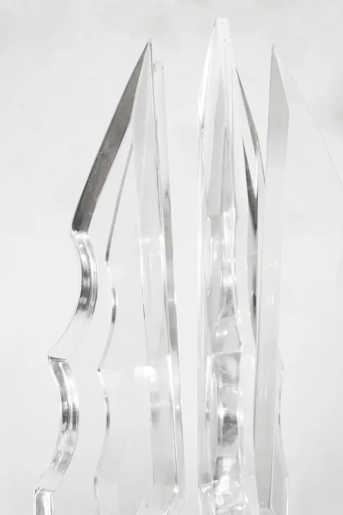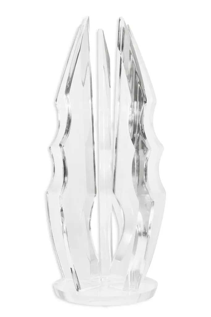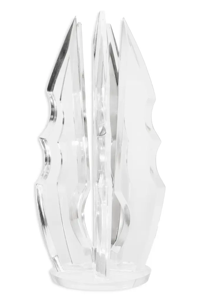 This is a post-modern lucite table sculpture in the style of Van Teal. The entire piece is crafted from lucite, including the base and the arms that extend from the top. The sculpture features a highly angular design with a sharp appearance. It is in excellent condition, measuring 21 inches tall with a base that is 8 by 8 inches.