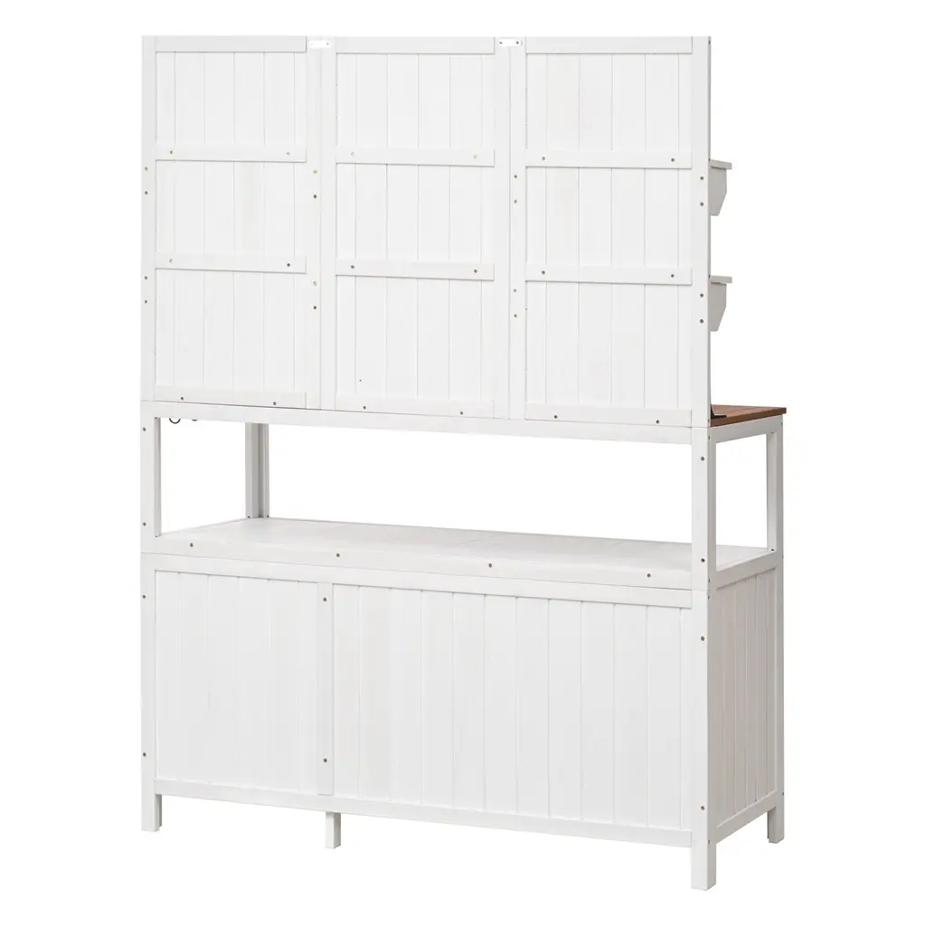 Potting Bench With Hutch, 50.2" Solid Fir Wood Garden Workstation, 2 Shelves, 2 Cabinets, 3 Side Hooks, Outdoor Planting Table - White