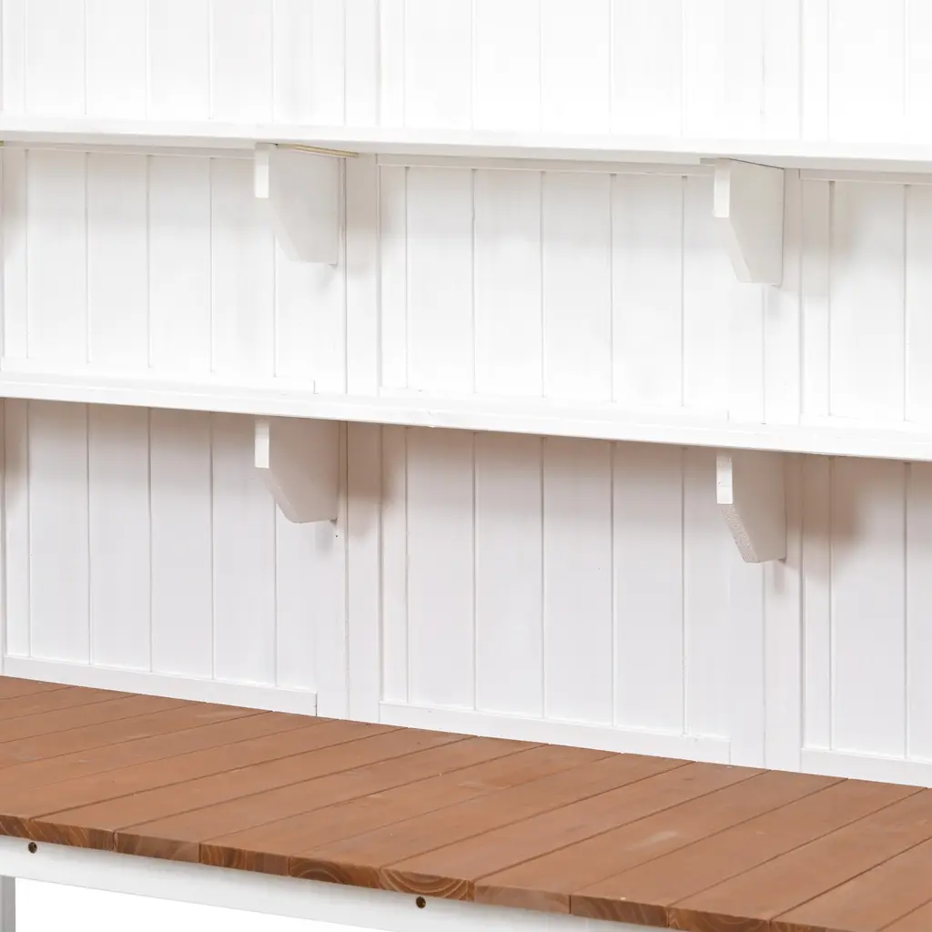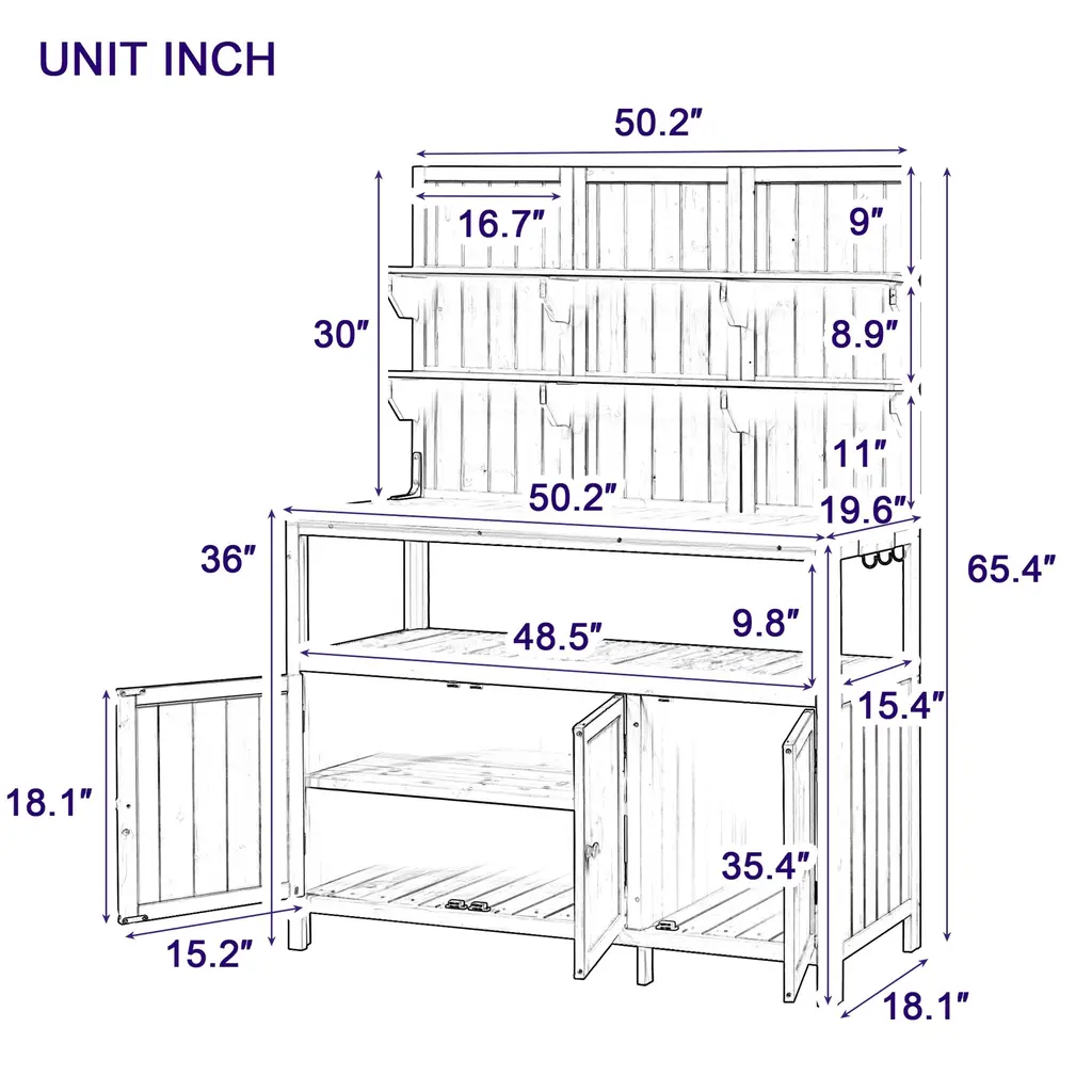 Product Features[Durable Fir Wood Construction] Crafted from 100% solid Fir wood, this potting bench ensures long-lasting durability and stability. Its robust frame withstands outdoor elements, making it a reliable garden workstation for all your planting and potting needs.[Ample Storage Space]Designed with 2 top shelves, 2 bottom cabinets ( with 1 adjustable shelf), and 3 side hooks, this bench provides plenty of room to store pots, tools, and gardening supplies.[Spacious 50.2-Inch Countertop] The large 50.2" x 19.6" countertop offers a generous workspace for potting plants, arranging flowers, or handling DIY projects. Its counter-height design ensures comfortable use, whether standing or sitting. Both the upper hutch and bottom cabinets add functionality while maintaining a sleek, modern look.[Dimension&Notice] Overall size:50.2x18.1x65.4inch(LXWXH); Tabletop size:50.2x19.6inch(LXW);Tabletop Weight Capacity: 110lbs; Each Shelf: 44lbs.