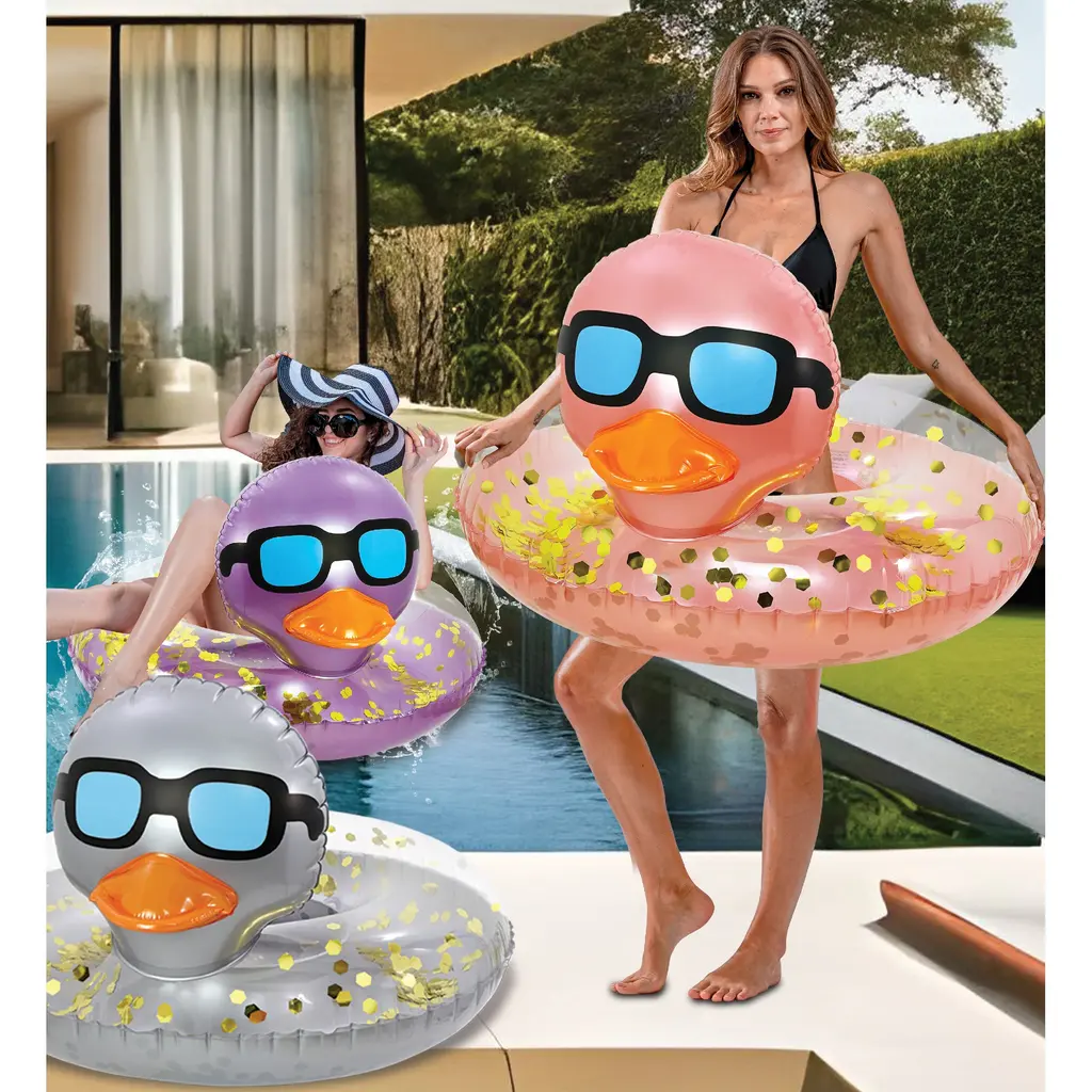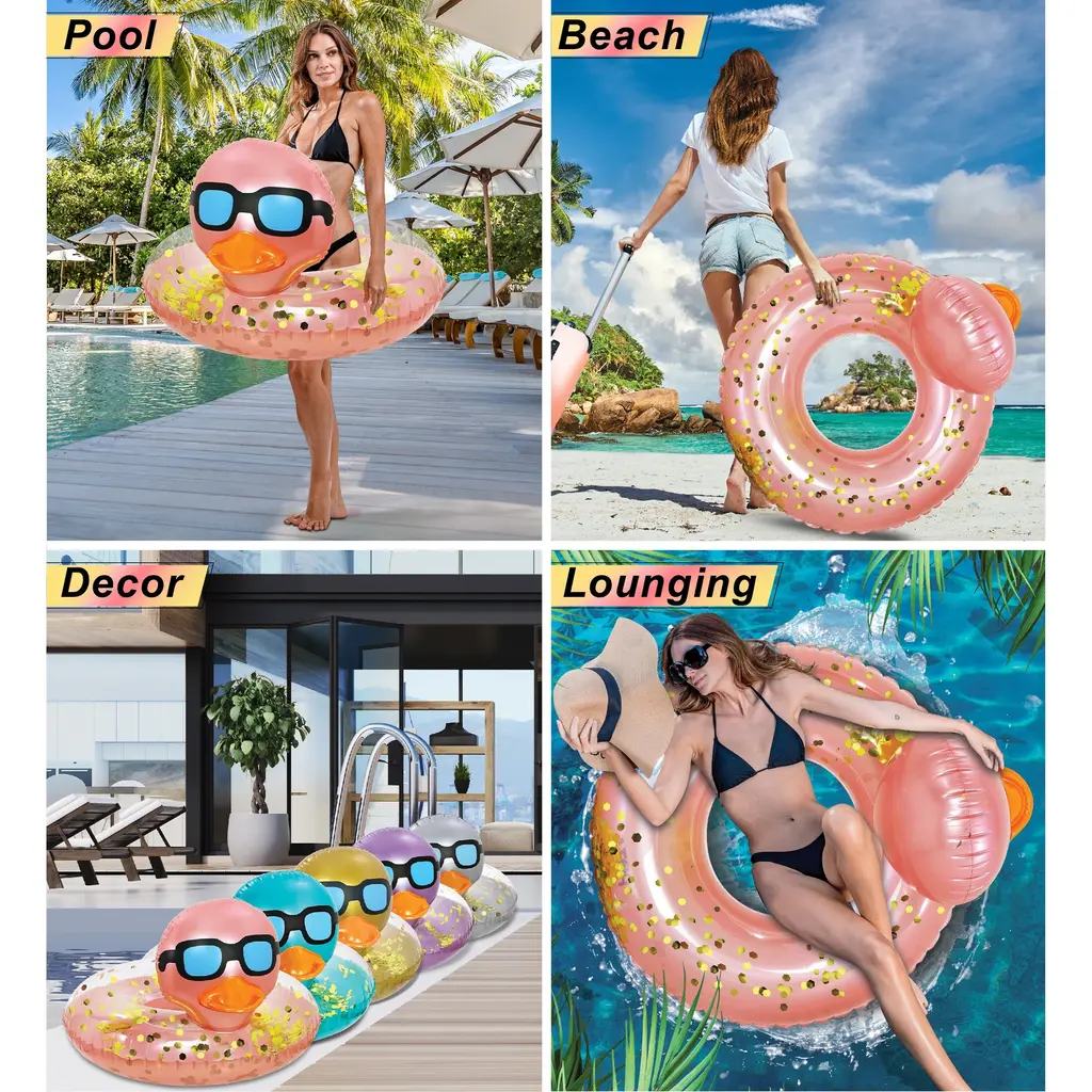 Whether it’s for a fun day at the beach or a relaxing afternoon in the backyard pool, this duck adult and kids inflatable pool floats will be your perfect swimming accessory that combines fun and functionality. Embrace the fun of water play with this inflatable animals ring water floats for kids, a cool addition to any collection of kids pool floats. Great for kids who love playful designs. The kids swim floaties the ideal companion for happy summer days. Whether you’re lounging at the beach, or sunbathing at the pool, this duck round tube pool float will be your perfect kids pool floaties. This Duck inflatable pool rings offer fun farm animal pool floats for adults and kids. The inflatable swim rings feature a cute rose gold duck with gold confetti inside. Use this duck pool floats animal ring as a lounger to hang out with family and friends while enjoying fun times at the beach, pool, or lake. When it comes to choosing kids floaties for pool, quality and safety are important. The swim float rings are constructed from high-quality PVC vinyl. Designed with UV and tear resistance to ensure the kids float ring from color fading or cracking. It’s the perfect swim tube ring for on-the-go families. Includes 1 POZA Rose and Gold Confetti Inflatable Kids Duck Floatie. It features a cool duck in sunglasses and an orange bill. Use an electric air pump with our advanced quick air valve system to easily inflate or deflate the kids pool tube duck ring. The kids floaty duck pool rings measure about 36 inches and include a repair patch. These luxurious duck pool rings for kids are recommended for children age 4 and up.