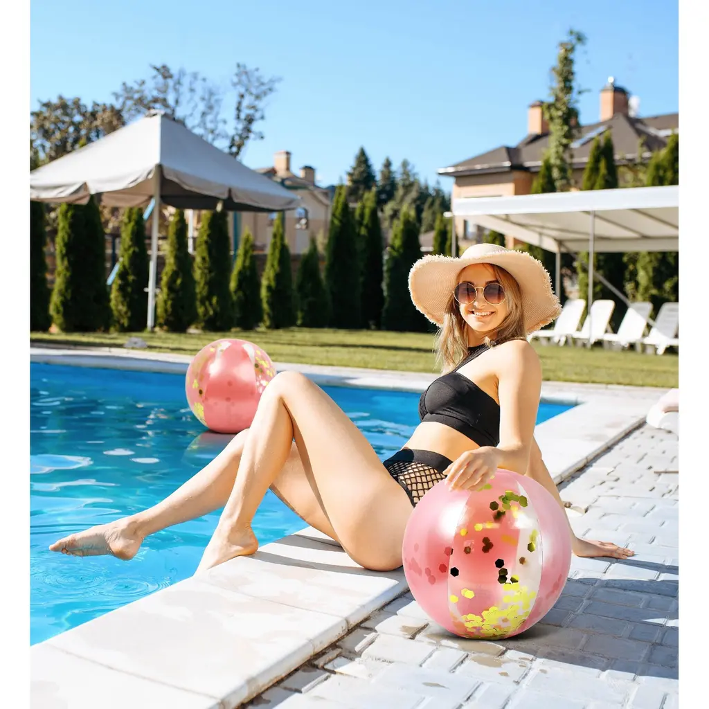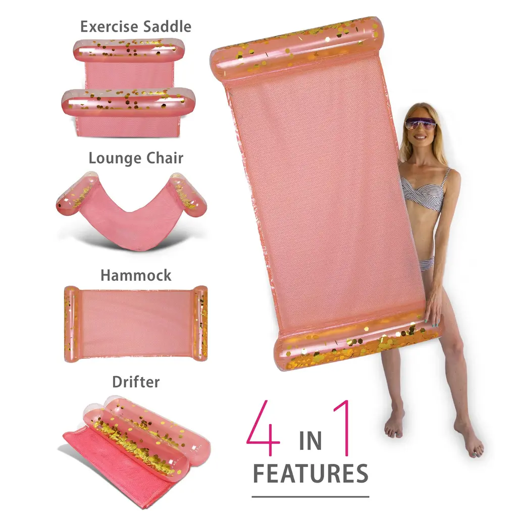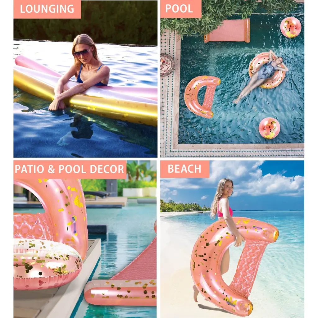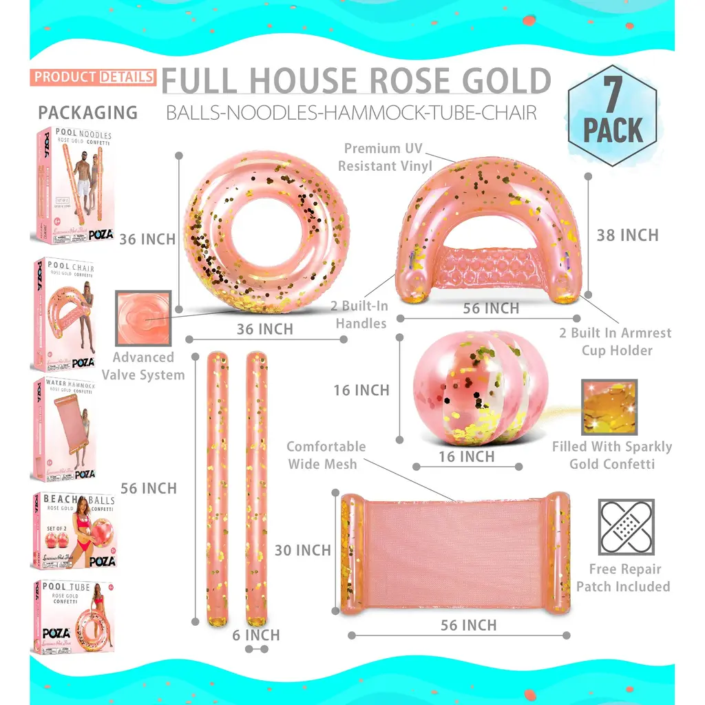 THE FULL HOUSE BOUNDLE OF ROSE GOLD INFLATABLE POOL FLOATS COMES WITH UNIQUE DESIGN YOU WILL LOVE - A Set of Rose Gold Pool Float Loungers filled with Sparkly Confetti will definitely add a touch of summer fun! The inflatable rose gold pool accessories come with a lightweight design that makes them the perfect summer article for any gathering at the beach or pool party. Use the inflatable pool accessories as loungers for a relaxing day in the water and enjoy your favorite drinks. These inflatable pool items will turn every pool party into an exciting and memorable gathering. The fashionable pool loungers are a must-have summer party essential. Cool rose gold pool floats filled with confetti make a fun time under the sun. It's the perfect pool summer gift for kids & adults who want to take a dive in the pool, lake, river, water park, ocean, or beach. POZA Full House Bundle Includes 1 Rose Gold Inflatable Pool Float Tube size 36" inches, 2 Rose Gold Inflatable Beach Balls size 16"x16" each, 2 Giant Rose Gold Pool Noodles size 74"x6"x6" each, 1 Rose Gold Inflatable Pool Chair with Built-In Armrests and handles for easy maneuvering size 48"x 38"x12" inches, and 1 Rose Gold Inflatable 4-in-1 use Water Hammock size 56"x30"x5" designed with a wide, comfortable mesh, and can be used as Exercise Saddle, Lounge Chair, Hammock, & Drifter. The stylish inflatable pool floats comes filled with sparkly gold confetti are heavy-duty pool loungers made with premium quality PVC vinyl materials. They come crafted with UV and tear resistance to keep the pool floats from color fading or cracking.