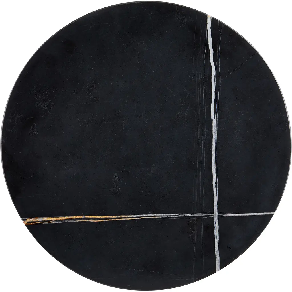 A true masterpiece of Mother Nature's doing, the Prado Drinks Table gleans its personality from the Nero Saint Laurent marble, imported from Italy, that forms its base and top. The striations of color on the blocky piece and the round disc, connected by a metal stem in a black finish, are artfully beautiful.