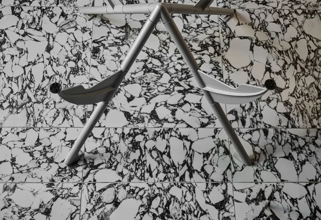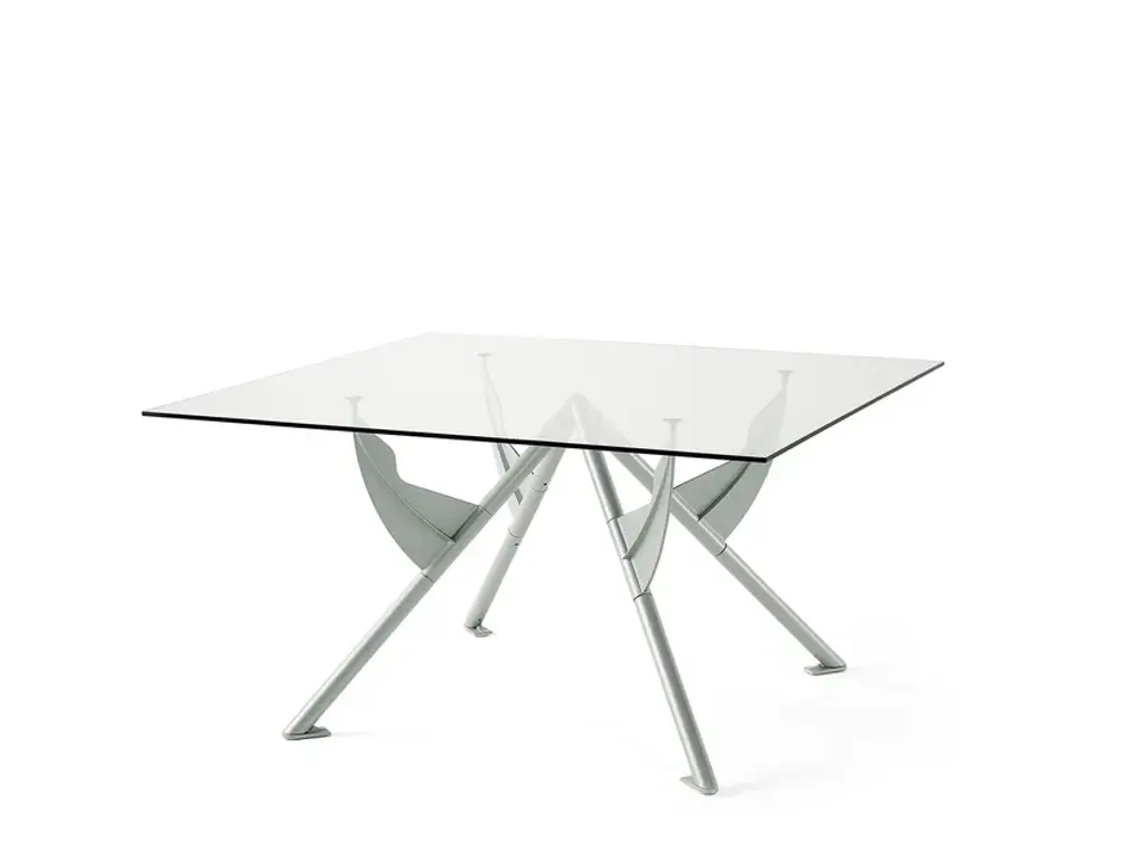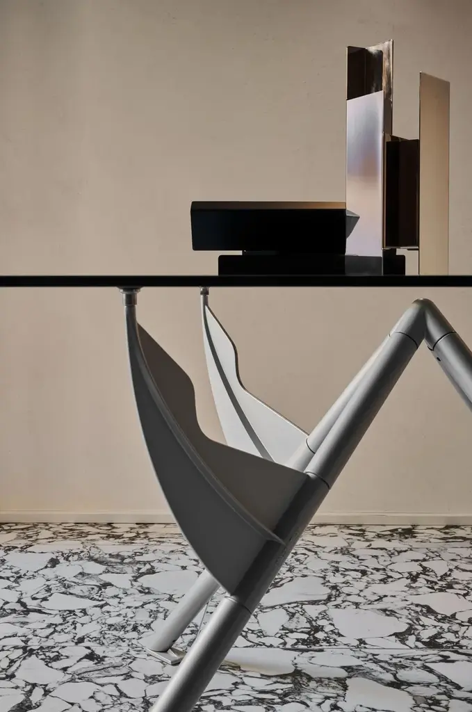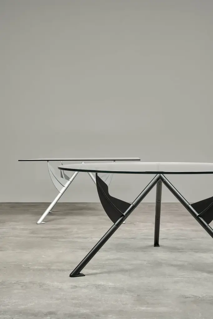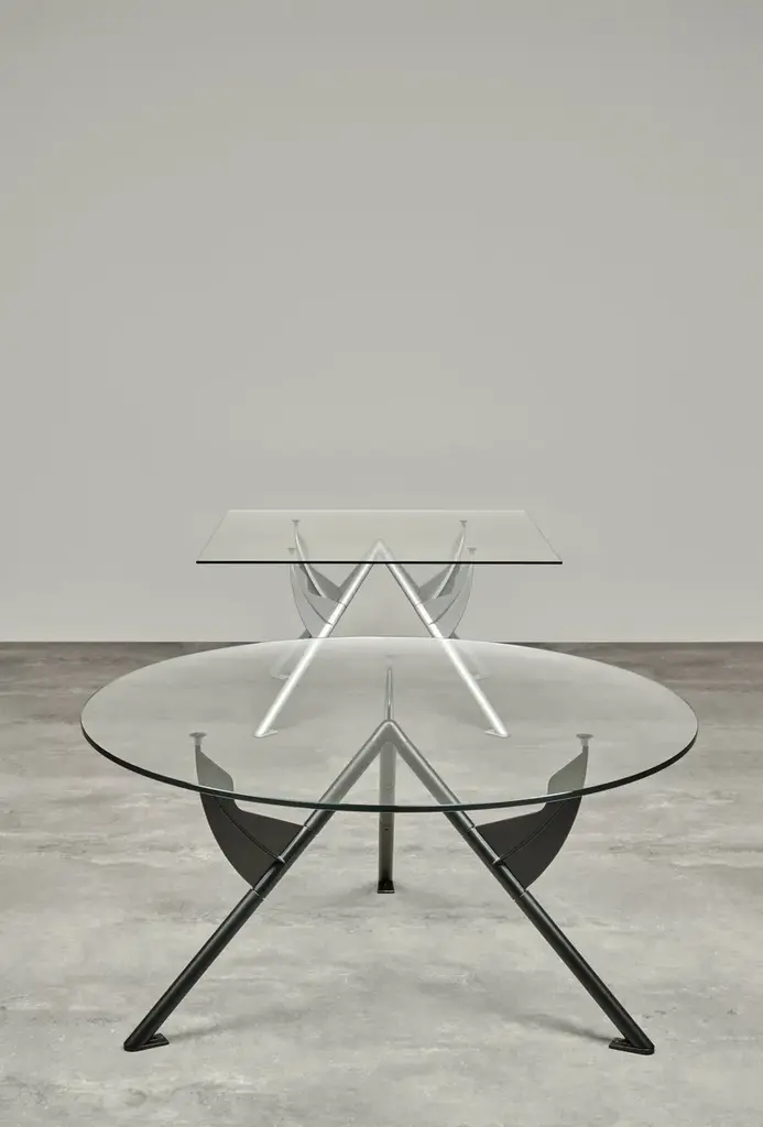Président M is the table designed for François Mitterrand’s private study at the Elysée Palace. Created to the minimum, it is composed of only 3 structural parts and can be completely dismantled. The tubular legs are a secondary structure, providing the base for the fins or wings on which the transparent glass tabletop is resting. These biomorphic silhouettes are so visually striking and so ideally suited to their function that the tabletop seems to be floating on thin air.Table with collapsible structure with three legs in steel tubing and cast aluminium painted with epoxy powders in metallic silver or matt black RAL 9005. Round top in tempered transparent clear 15 mm thick crystal.