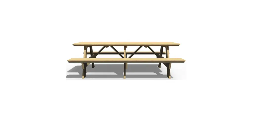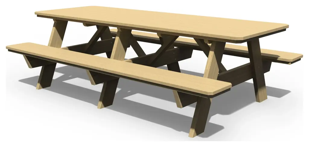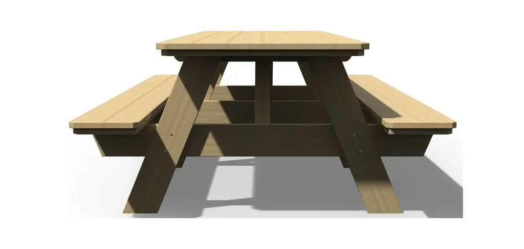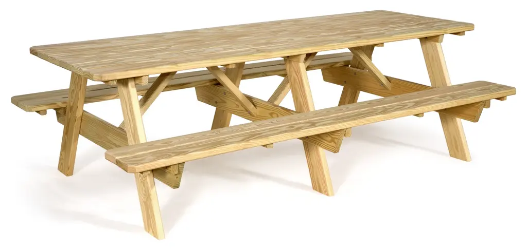 Our wood picnic table is constructed of pressure-treated pine. This picnic table with benches attached is great for parks, schools, churches, and to gather your family on the patio.Wood is a natural, earth-friendly product. Known as one of the most robust, versatile wood species, Southern Yellow Pine is the wood used to manufacture our Outdoor Furniture. The quality and availability of Southern Yellow Pine are virtually unmatched.Amish made in the USAOur treated wood uses non-arsenic based, environmentally safe preservatives.If ordering unfinished with plans to stain or paint, for best results this should be done within 30 days of receiving your product.If ordering painted or stained, your product should be resealed every 2 years with a quality water sealer of your choice.Digital colors may vary slightly from actual product colors