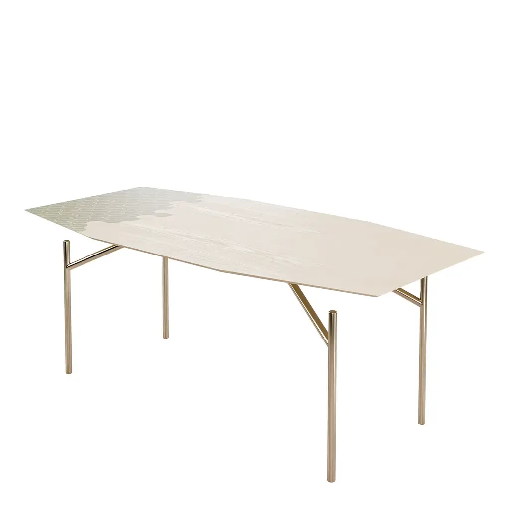 Primavera is the result of a deep research into textures and shapes derived from the plant world. A research for a new balance between man and nature, as human beings live in a state that is increasingly far from their primordial condition and perceive the need to find new ways of being in contact with the natural world. This table is made of natural ash and green-painted ash with a base of vintage etched steel.