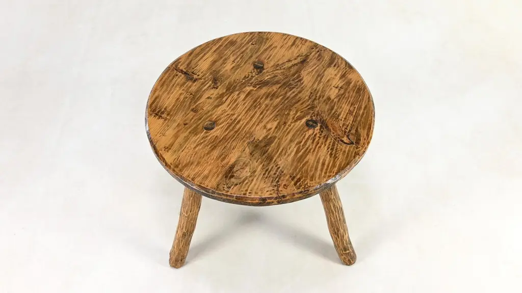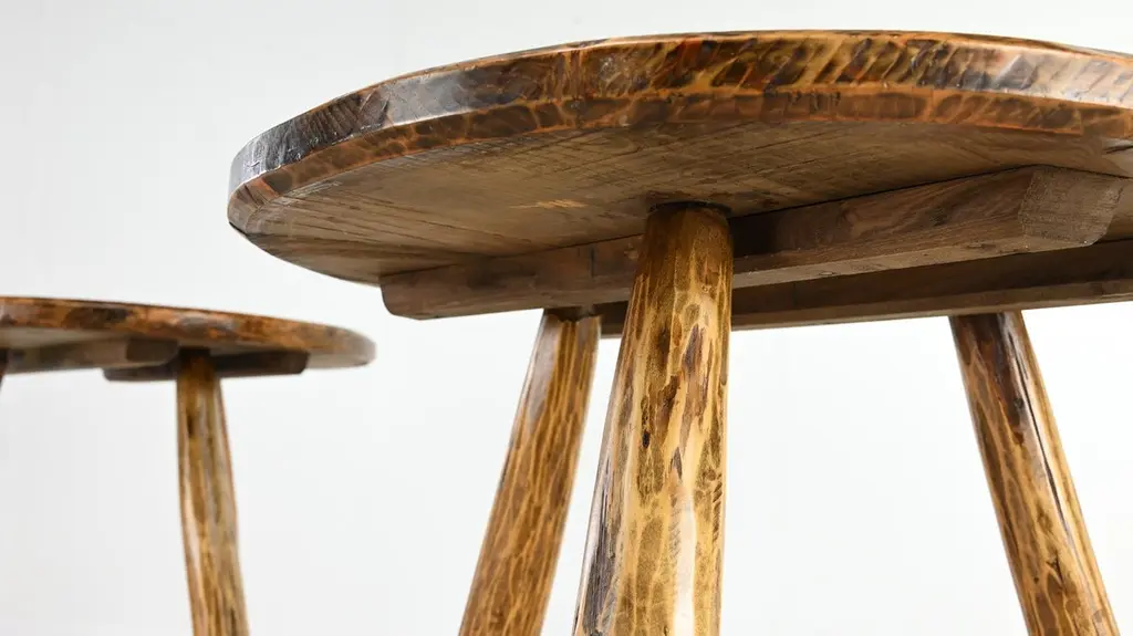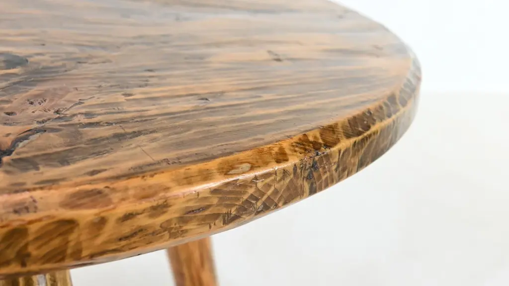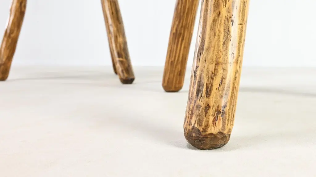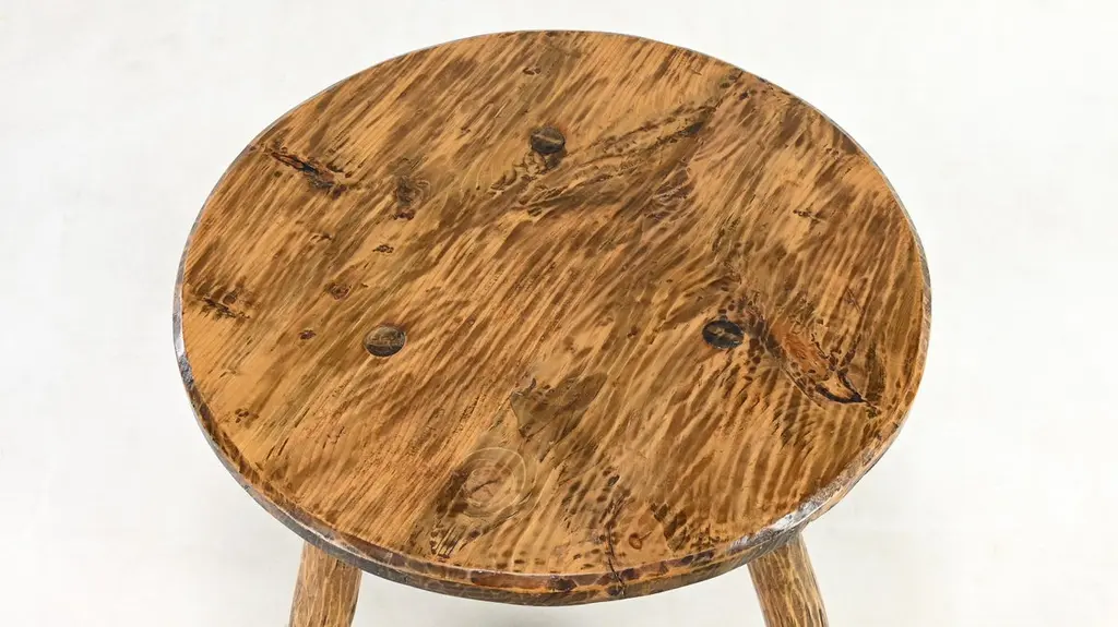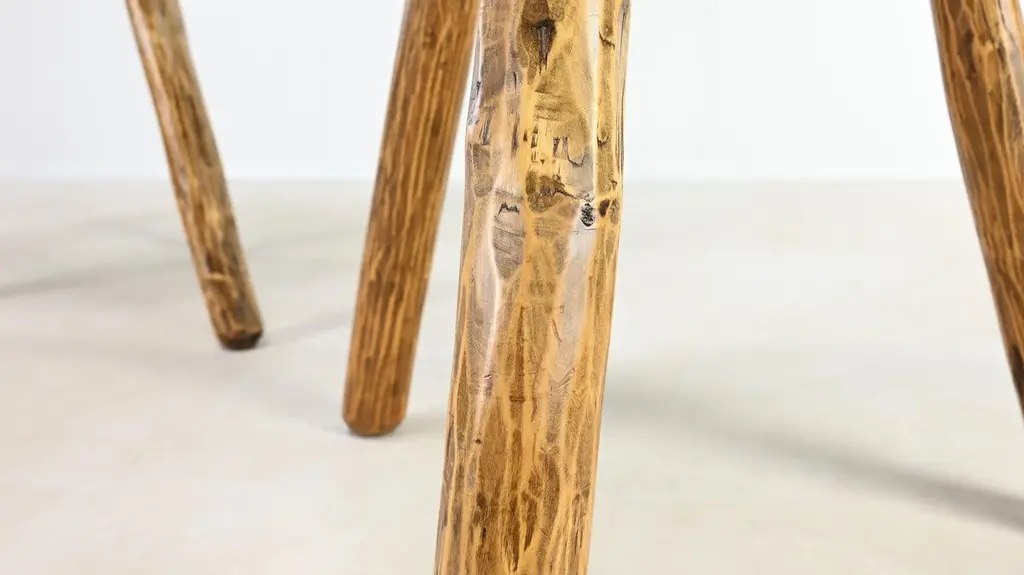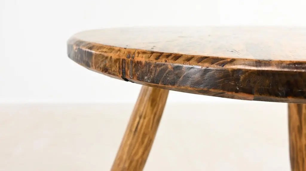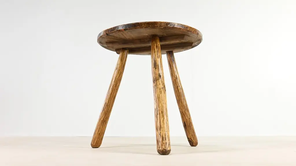Primitive tripod table. France, late 1940s.Sculptural and distinctive, these three-legged “cricket tables” — a form once commonly found in rural French and British homes — are crafted from solid chestnut and assembled using traditional joinery techniques typical of rustic craftsmanship.The circular top rests on three legs, each showing visible tool marks and irregular shaping, clear signs of manual work done with traditional tools such as a drawknife or adze.The wood’s natural patina, combined with its textured surface, makes this raw and authentic piece a perfect fit for Wabi-Sabi, Brutalist, primitive, or contemporary interiors.Wear and patina consistent with age and use. Very good structural and overall condition. Finished with original period varnish.Price per unit.