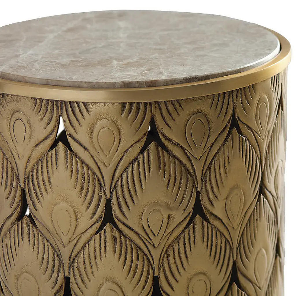 With the look of an acquired antique, an ogee-like pattern of peacock feathers cast from a handcrafted mold is topped with Light Emperador marble. Aluminum table is cast from a handcrafted mold Antiqued brass finish Light Emperador marble top Due to natural variations in marble, each piece is inherently unique For indoor and outdoor use A Frontgate exclusive. At Frontgate, our primary focus is quality. We guarantee that every product we sell will stand up to the supreme test – our customers' satisfaction. To learn more about our policies, visit our Shipping & Processing, Returns & Exchanges and Warranty & Price Guarantee pages. With the look of an acquired antique, an ogee-like pattern of peacock feathers cast from a handcrafted mold is topped with Light Emperador marble. Aluminum table is cast from a handcrafted mold Antiqued brass finish Light Emperador marble top Due to natural variations in marble, each piece is inherently unique For indoor and outdoor use A Frontgate exclusive. At Frontgate, our primary focus is quality. We guarantee that every product we sell will stand up to the supreme test – our customers' satisfaction. To learn more about our policies, visit our Shipping & Processing, Returns & Exchanges and Warranty & Price Guarantee pages.