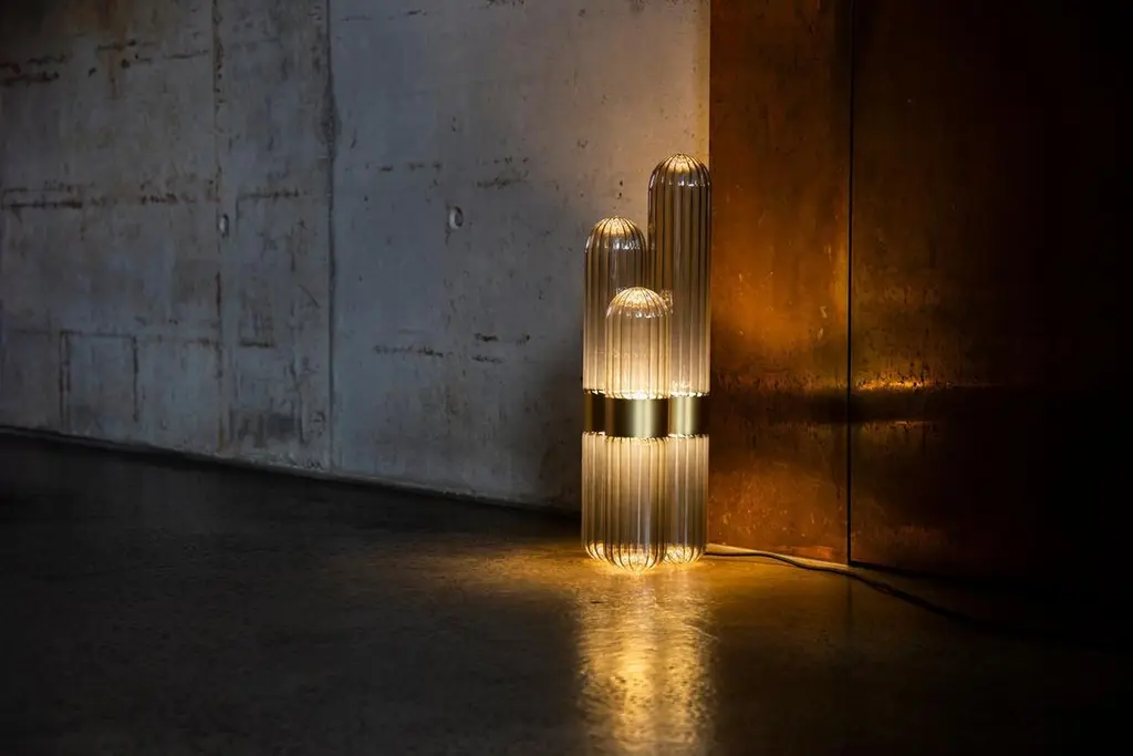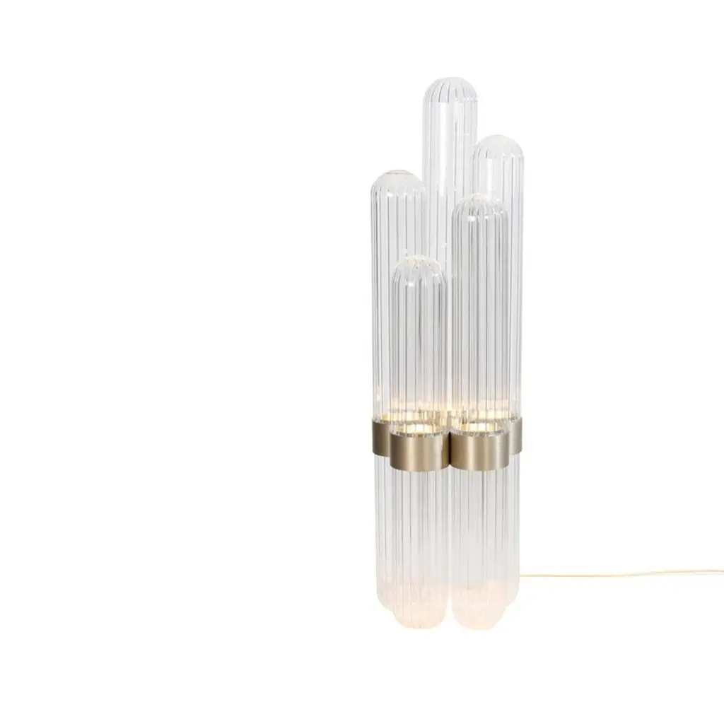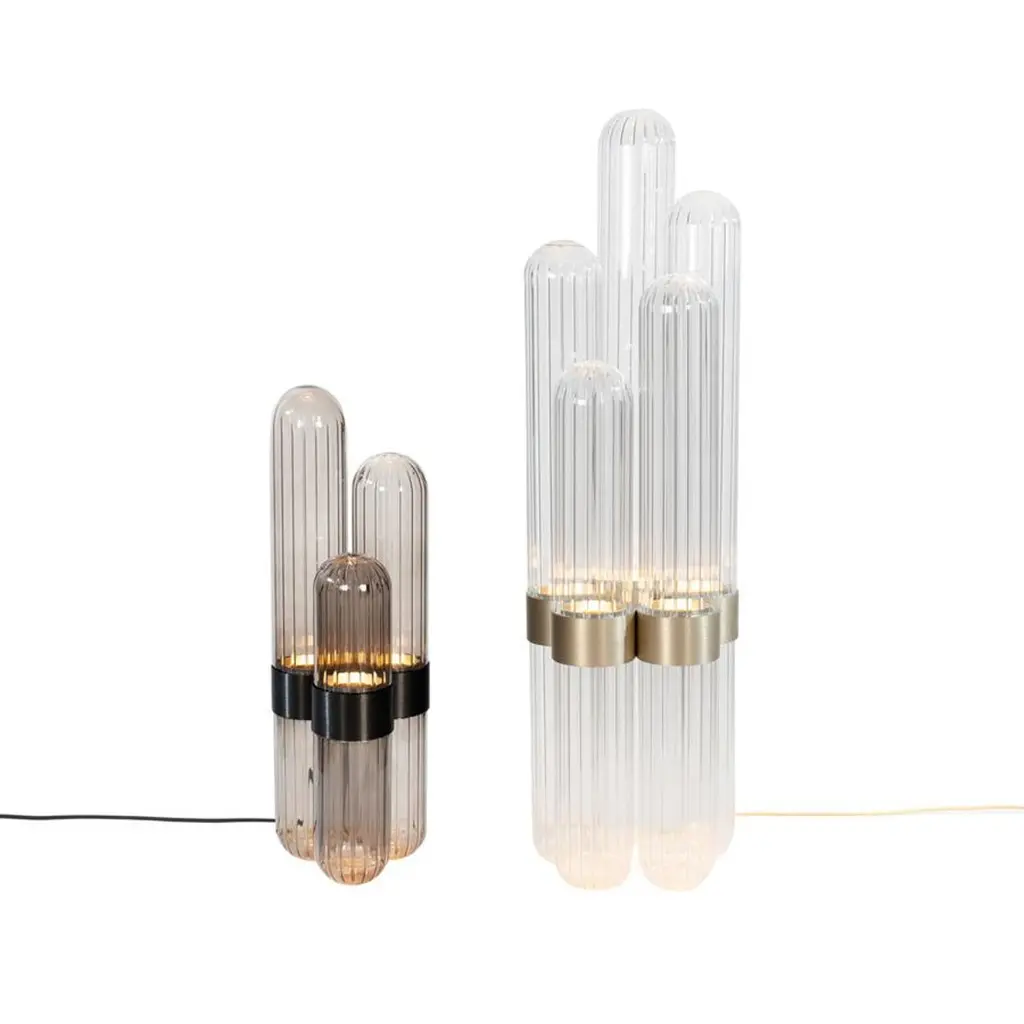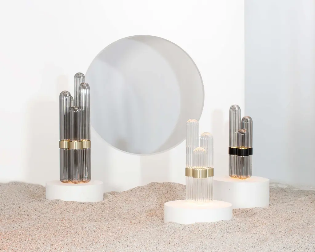 The symmetry of tall grown, succulent ensembles inspired French designer Mickaël Koska to form an illuminating sculpture for living spaces. His work with cactus underlines what he calls „to give life to surprising natural creations“, preferring simple lines and focus to the essential.Material: borosilicate glass + steelAdditional informationDimensions300 × 1000 mmSizesmall, bigColour glass shadesmoky grey, transparentColour centrepieceblack, brass, brass polished