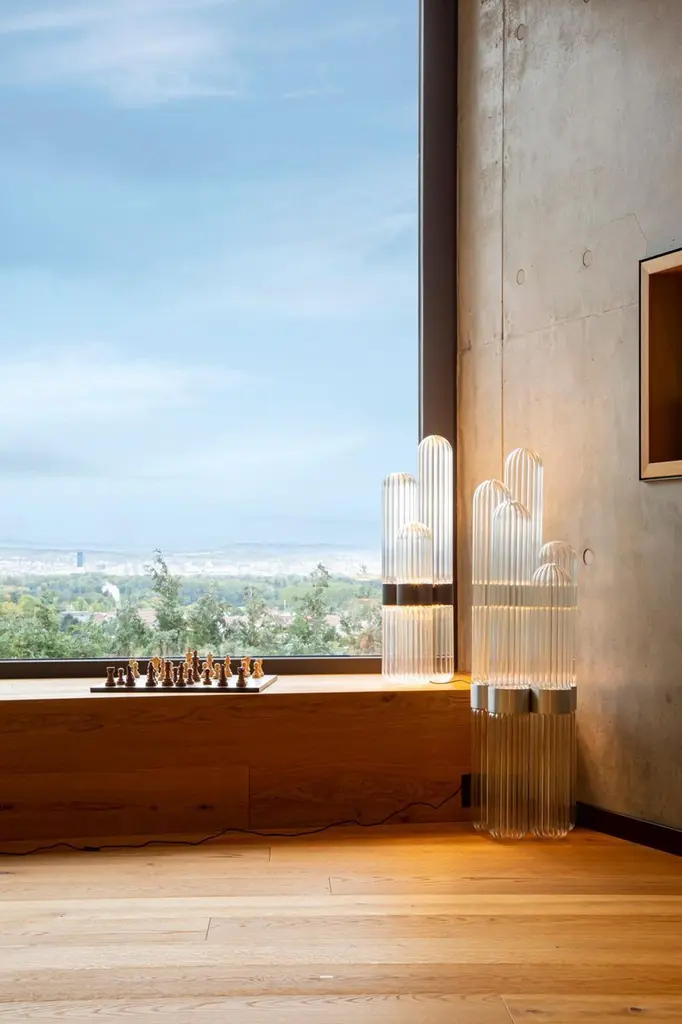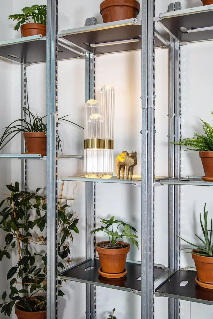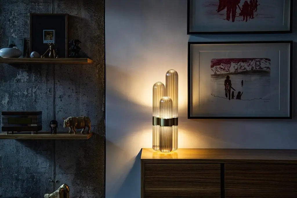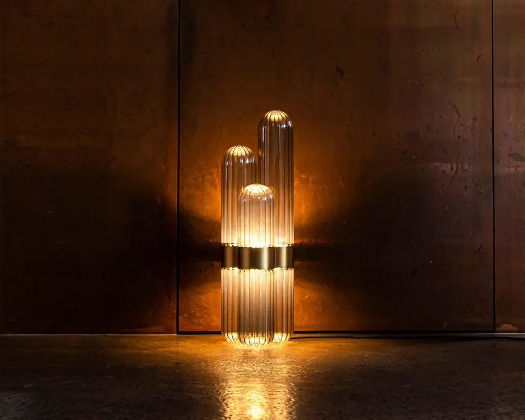 The symmetry of tall grown, succulent ensembles inspired French designer Mickaël Koska to form an illuminating sculpture for living spaces. His work with cactus underlines what he calls „to give life to surprising natural creations“, preferring simple lines and focus to the essential.Material: borosilicate glass + steelAdditional informationDimensions300 × 1000 mmSizesmall, bigColour glass shadesmoky grey, transparentColour centrepieceblack, brass, brass polished