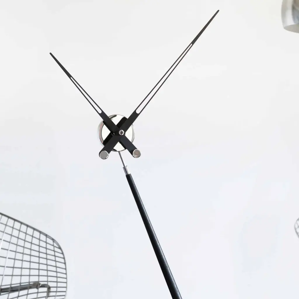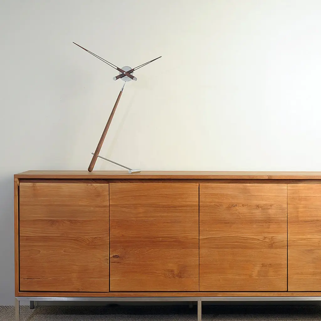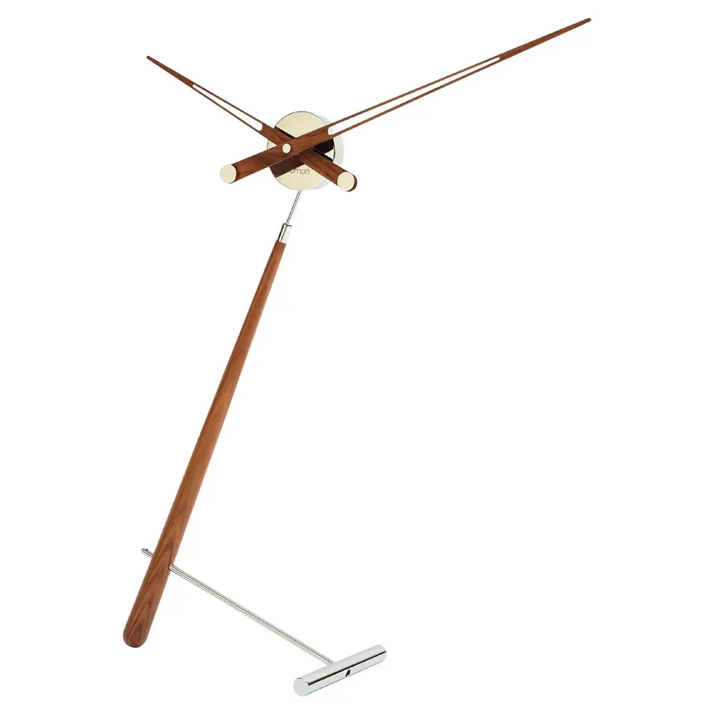 Puntero tips the balance with an asymmetrical tilted design that is both a captivating room accent and a state-of-the-art timekeeper, powered by a German-origin quartz movement. Handmade in Spain by specialty brand Nomon, the hands and body come in a choice of lacquered woodgrain walnut or bold solid tones.