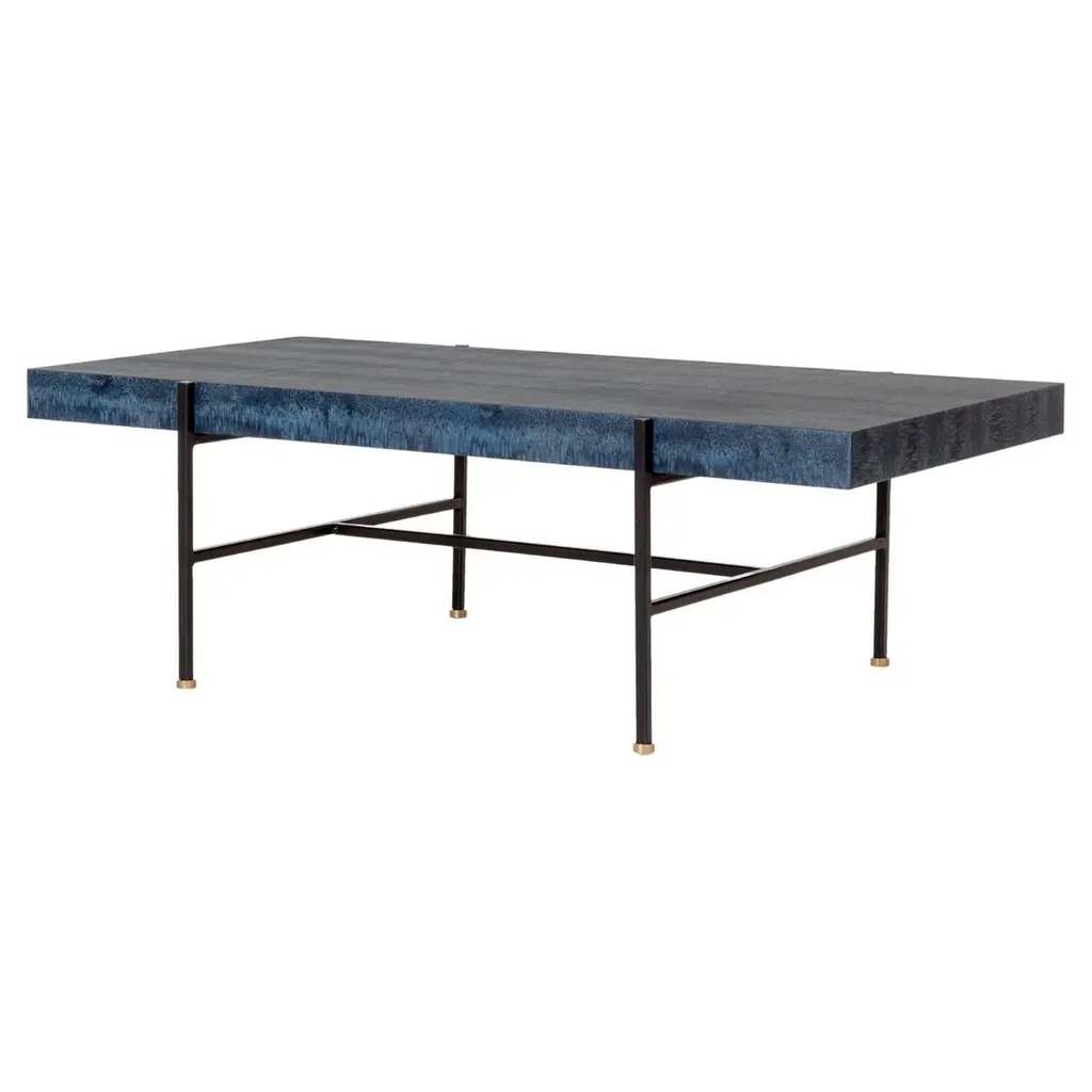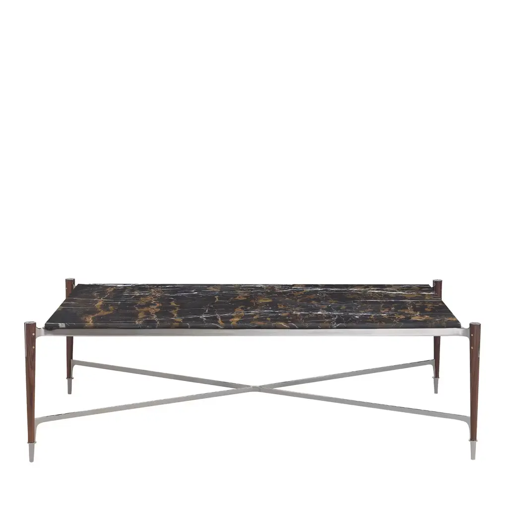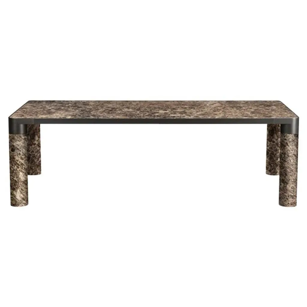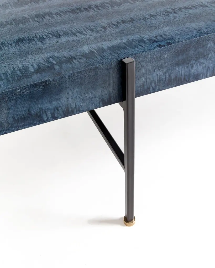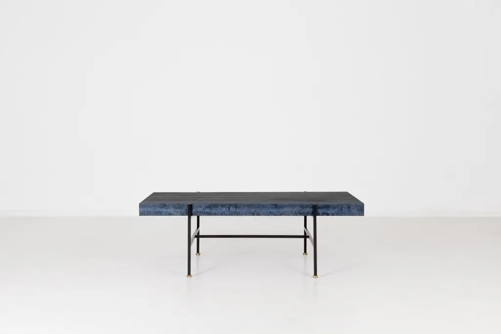Purple Osis Bensimon low table by Llot LlovDimensions: H 40 x L 160 x W 80 cmMaterials: birch wood laquered / powder coated steelAlso available in blue.For Gallery Bensimon, studio llot llov exclusively designed a furniture collection based on a blue striped pattern. The tabletop is enclosed to the fine metal frame. Elegant but solid it stands on cylindrical brass feet.The surface finish OSIS is an innovation developed by llot llov and is 100% handmade in Berlin. Behind the LLOT LLOV brand is the studio for product and interior design as well as the producer of furniture, objects, lighting and surfaces. Since their foundation in 2006 by Ania Bauer and Jacob Brinck, the two Berlin based author designers have established themselves internationally. One of their recognizable features is the reinterpretation of traditional arts and crafts brought into a contemporary design context.An example of this is OSIS, an innovative surface finish using salt crystals and colour pigments on wood, with which they won the German Materials Prize, among other awards. They use OSIS as well as the terrazzo GLACIER, which was introduced in 2018 and is made of nail polish bottles, for their own designs, but they also supply interior designers worldwide. For GLACIER, as for other designs, they upcycle high-quality materials, for example from the cosmetics industry. Their objects are manufactured in Europe, often in social workshops, and distributed directly by LLOT LLOV.LLOT LLOV produce exclusive furniture and objects for private or corporate clients and also manage interior design projects such as hotels or offices. In addition, the duo has been running a shop for fashion and accessories in Berlin-Mitte with BAERCK since 2007.