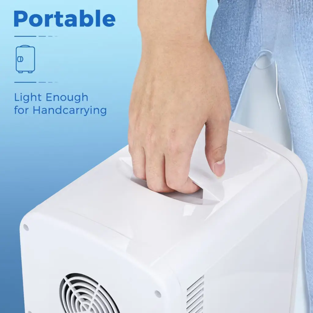 It offers a large capacity, comfortably storing up to 6 cans (12 oz) with dimensions of 9.65" x 7.09" x 10.24". Its detachable shelf enhances flexibility for storing various items such as breast milk, skincare products, cosmetics, or snacks. Engineered with an eco-friendly, freon-free semiconductor refrigeration chip, it operates quietly at just 25dB, ensuring a peaceful environment. Its compact design makes it perfect for a range of settings including bedrooms, offices, dorms, travel, boating, and camping. Additionally, it features a dimmable LED light mirror for easy makeup application. The fridge provides efficient cooling, reducing temperatures up to 32F (18C) below ambient temperature and offers versatile AC/DC supply options, allowing connection to either a 100-120V home outlet or a 12V car power supply.