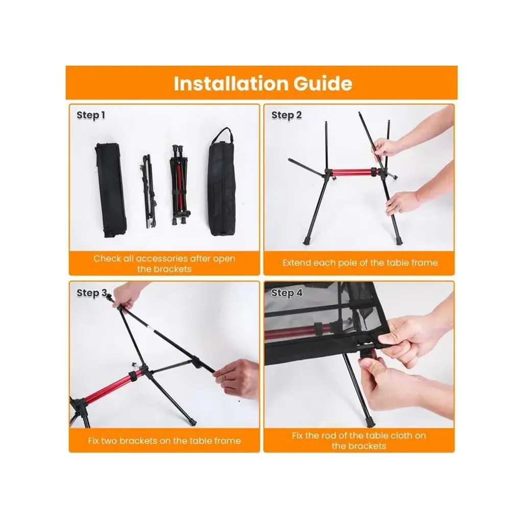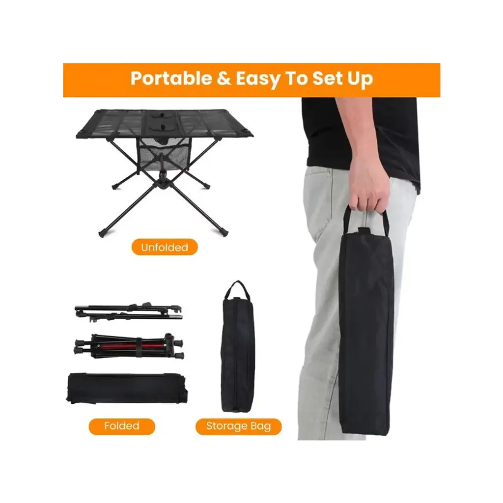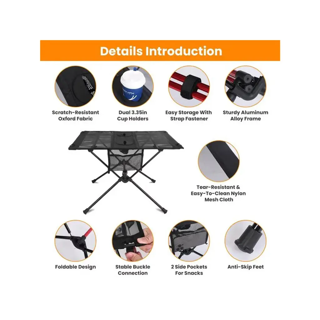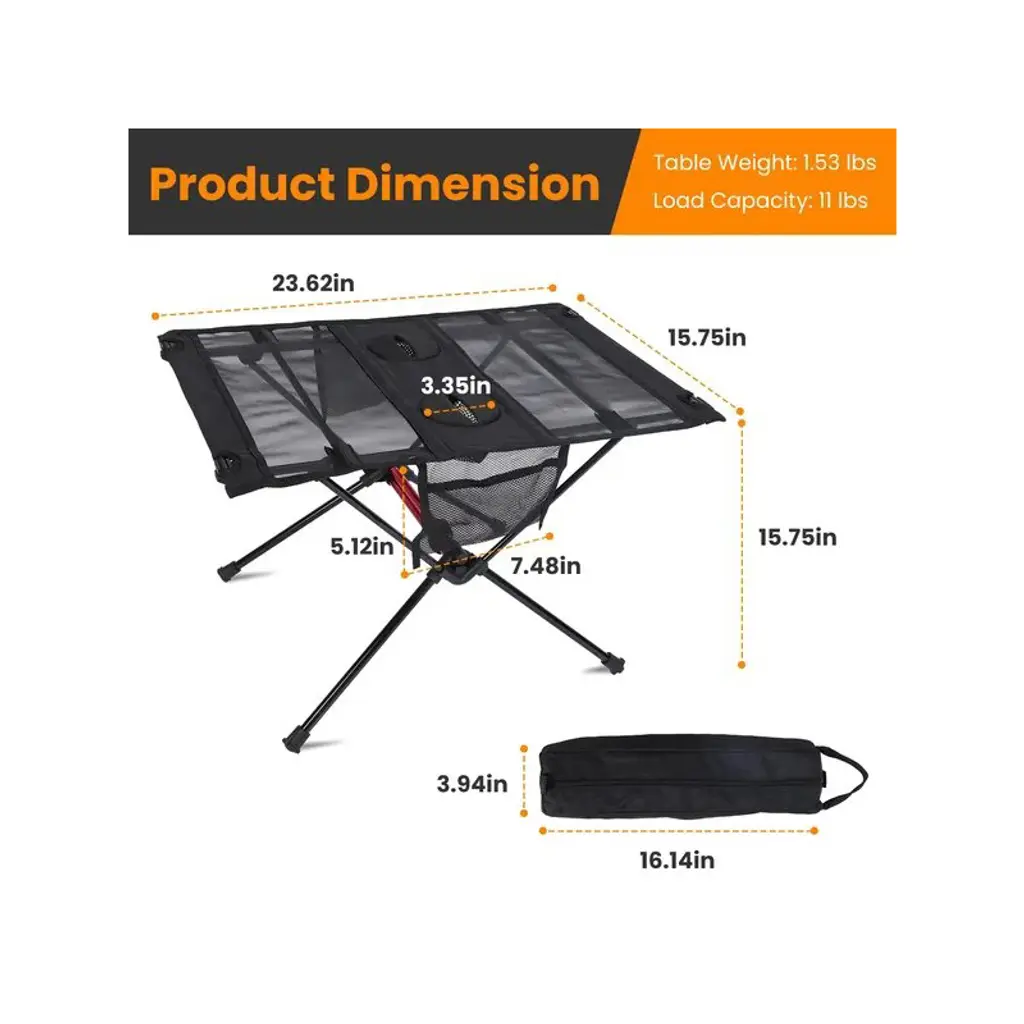 *Specifications*: Brand: LakeForest Product Type: Foldable Camping Table Color: Black Material: Aluminum Alloy Tube, Nylon Mesh Table Cloth Max Load: 5kg/11lbs Bottle Pocket Size: Diameter: 8.5cm/3.35in; Depth: 8cm/3.15in Side Pocket Size: 19x13cm/; Inner Size: 17x11cm/6.69x4.33in Camping Table Size(Unfolded): 60x40x40cm/23.62x15.75x15.75in Camping Table Weight: 695g/1.53lbs Storage Bag Size(With Table): 41x10x10cm/16.14x3.94x3.94in Storage Bag Weight(With Table): 766g/1.69lbs Package Size: 44*16*9cm/17.32*6.29*3.54in Package Weight: 784g/1.72lbs