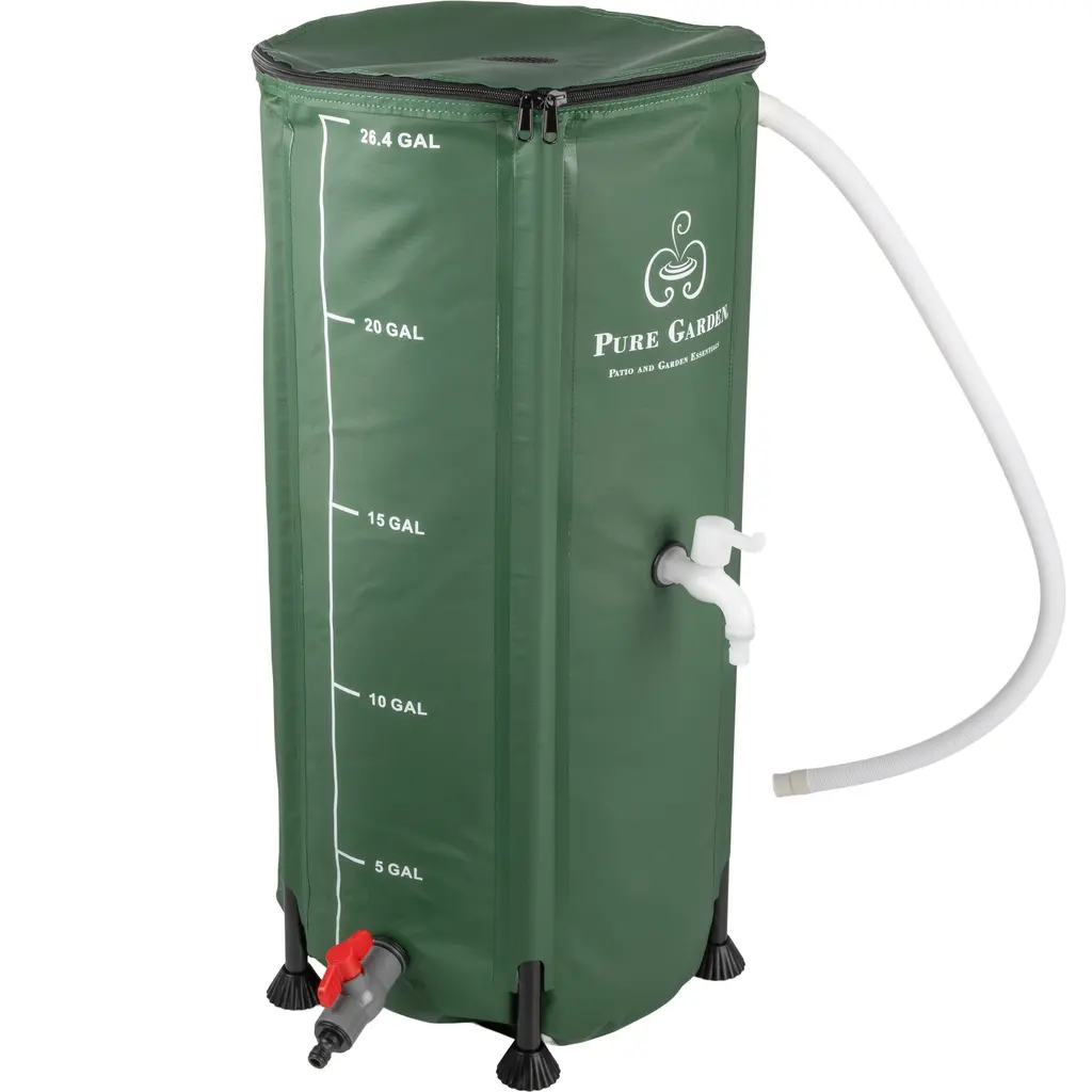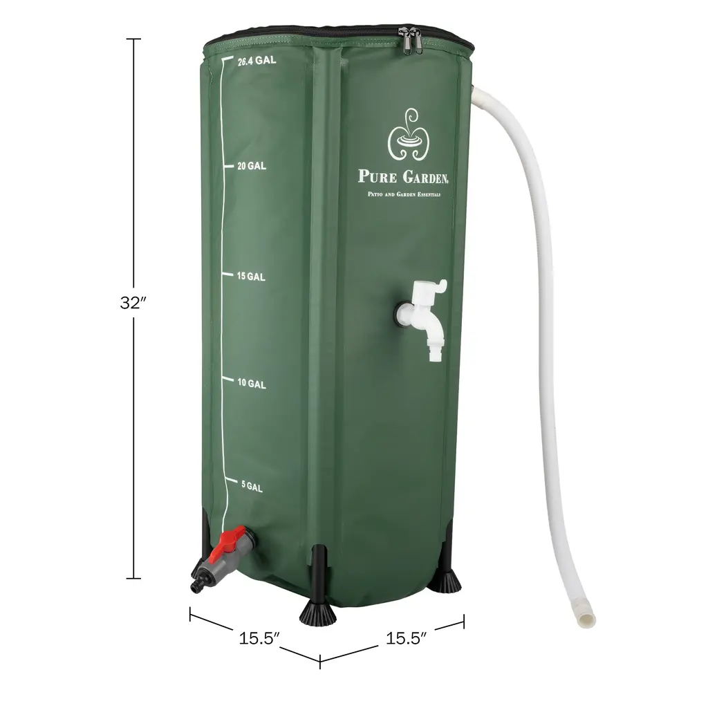 Ensure your plants have the water they need while cutting down on your water bill with the Rain Barrels to Collect Rainwater from Gutter by Pure Garden. This rainwater collection system comes with a large capacity rain barrel that collapses down for portability and compact storage when not in use as well as a water outflow spigot for easy access to your collected rainwater. The rain barrel is made of durable PVC with an anti-corrosion mesh fabric for long-lasting use, even in the winter months. Not only is collecting rainwater better for the environment and your wallet, but it's also better for your plants as it doesn't have any added minerals, salts, and chemicals that tap water contains. These water storage containers make a great gift for the avid gardener or homesteader in your life.WATER BARREL - Water your plants without any of the added minerals, salts, and chemicals found in tap water with this rain barrel. This eco-friendly water storage product collects rainwater to use for gardening while saving money on your water bill.LARGE CAPACITY - The water storage tank holds rainwater and is easy to use — simply put it under a downspout and let the water run through the mesh top. It features gallon markings as well as an outflow valve for overflowing.DURABLE CONSTRUCTION - Made of PVC with an anti-UV and tear-resistant cover, this rain catcher is designed for long-lasting use. The anti-corrosion PVC mesh intake filter at the top of the barrel helps keep leaves, debris, and insects out for clean water.COLLAPSIBLE DESIGN - The collapsible design of the rain water collection barrel makes it simple to move around as needed or store it in your shed, garage, or basement for compact storage. Reassembling the barrel is easy for use year after year.PRODUCT DETAILS - Materials: PVC Frame and Cover with Outlet Valve. Color: Green.