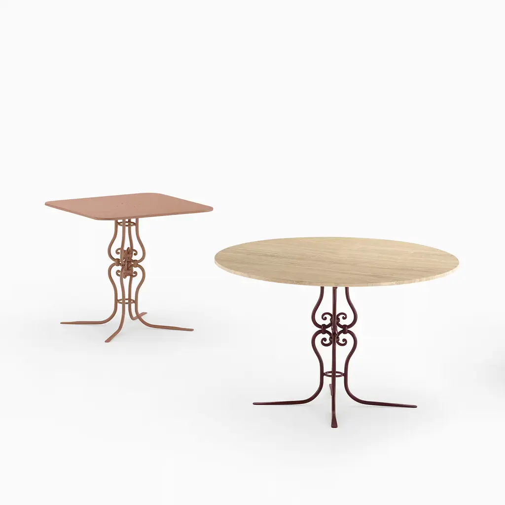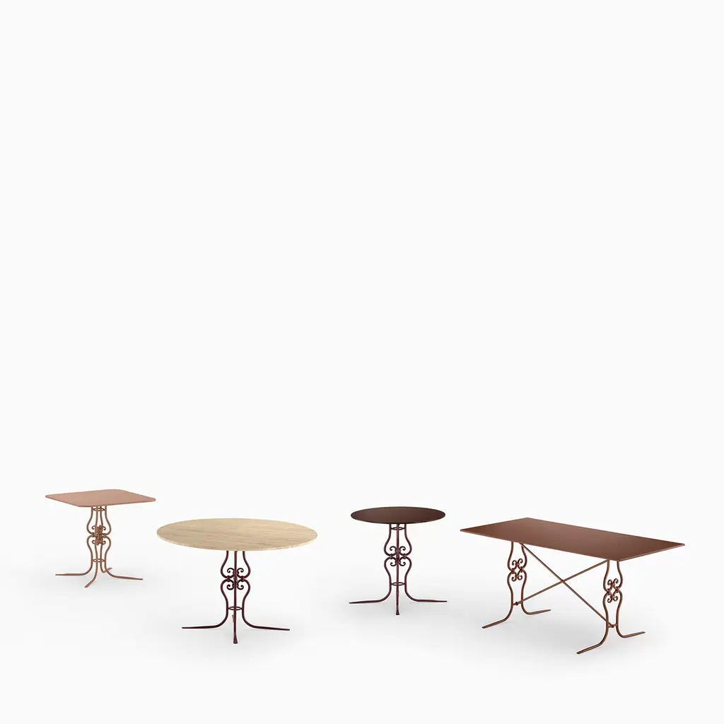 A triumph of curls and sinuous profiles characterize this outdoor table as a design of intriguing femininity. Entirely powder-coated in a delicate brown hue for a statement of elegant contemporary flair, the galvanized metal structure comes complete with a top whose square design results softened by rounded corners. Please contact the Concierge to explore available color variants.