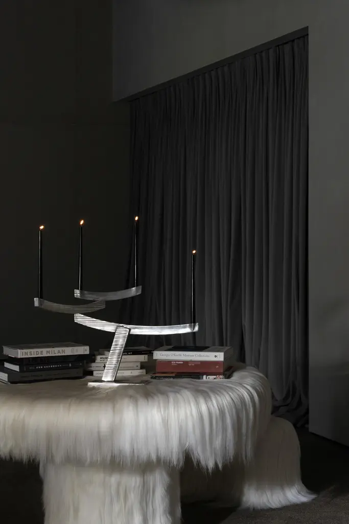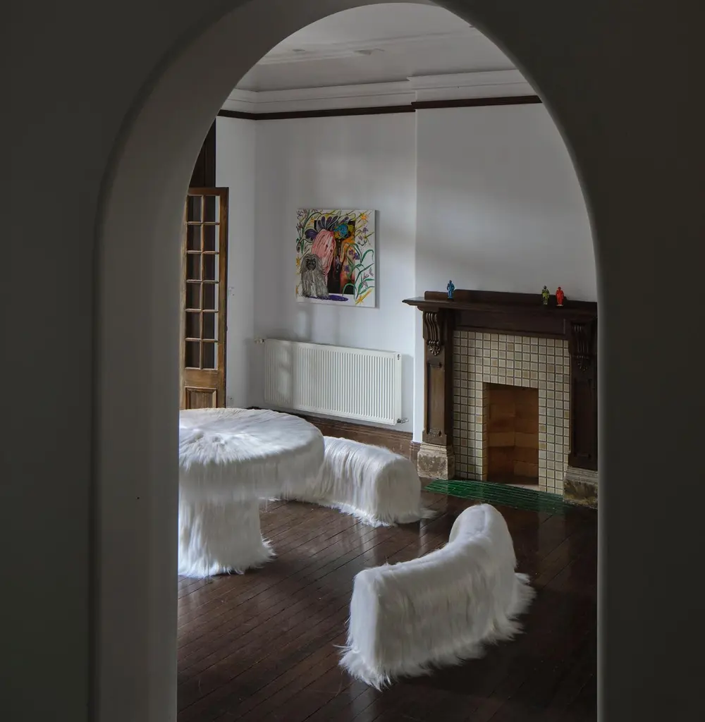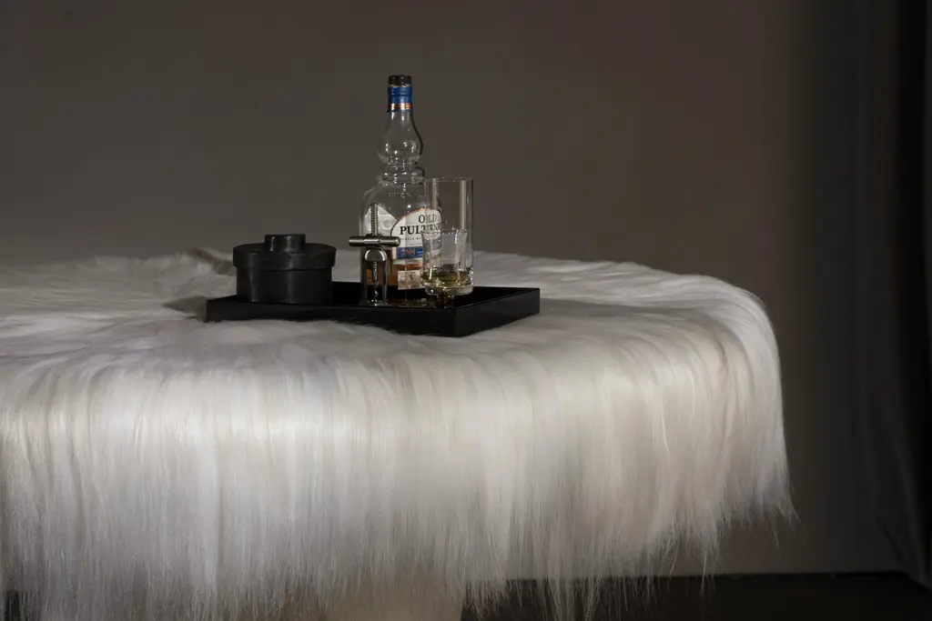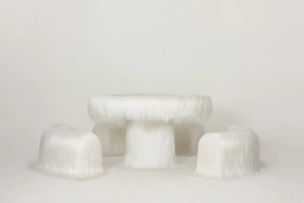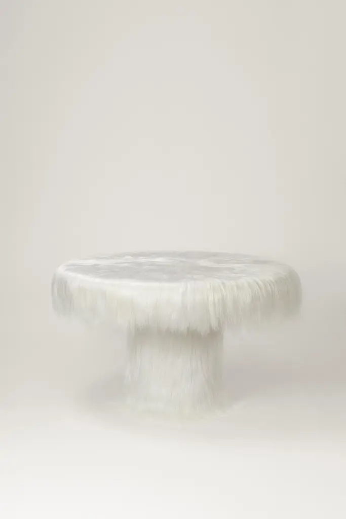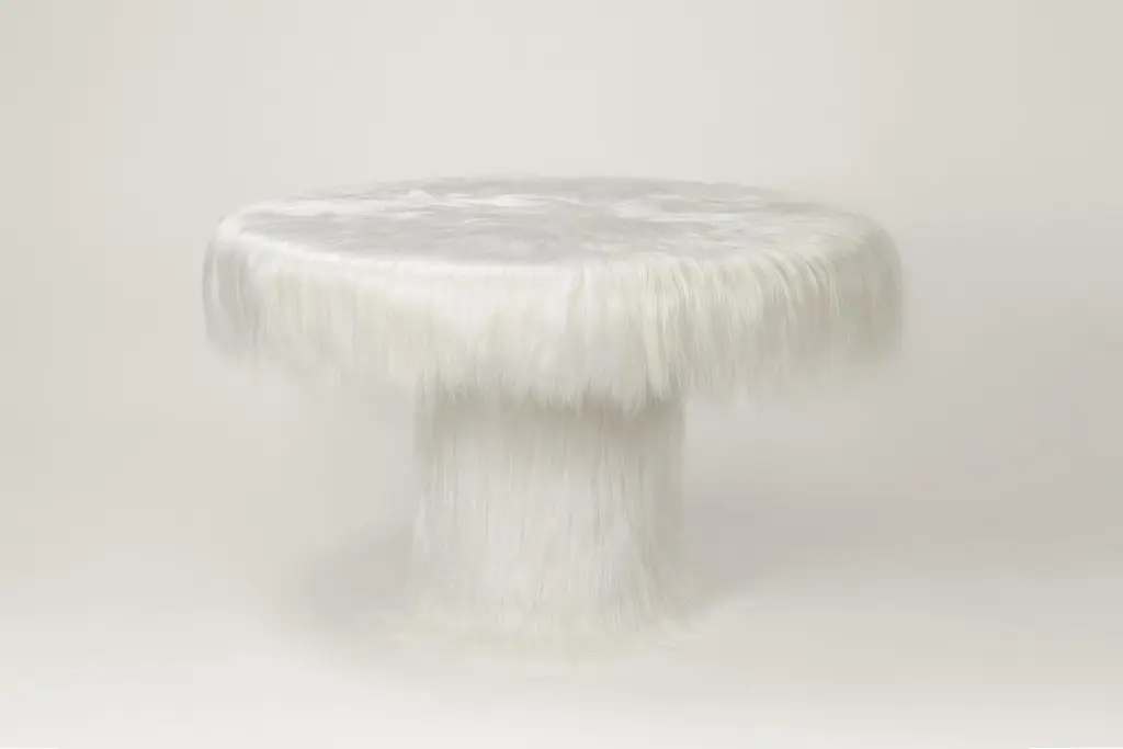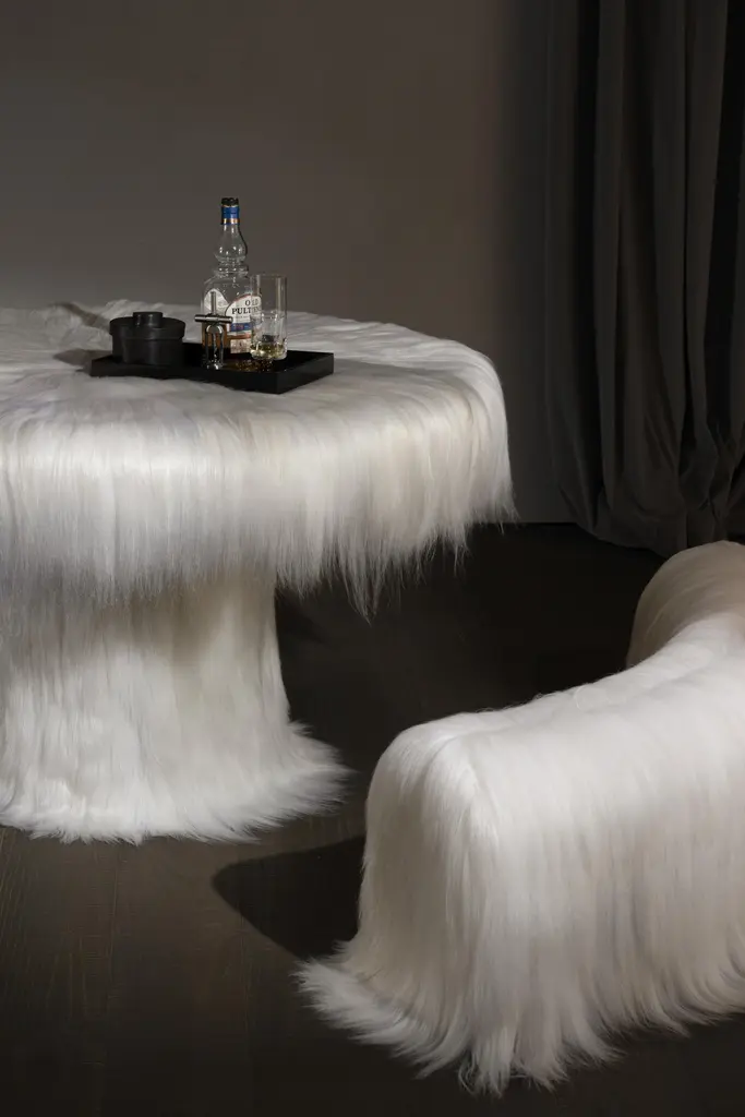 Raw Table by Atelier V&FLimited Edition Of 5+2AP Pieces.Dimensions: Ø 130 x H 76 cm.Materials: Goatskin offcutsInspired by the earth goddess Gaia,「Revelation of Gaia」aims to explore the mighty but soft inner power and to praise the mysterious nature. With this collection, we try to break the boundary between artistic sculpture and practical furniture and explore different materials. It is an artistic scene made up of furniture. The soft and tender fur covering the tough structures, touching the ground, reflects the power of the all-encompassing earth. The hair flutters with the flow of air, like the quietly rhythmical breathing of living creatures. Grand and delicate, strong and soft, it pictures the female spiritual profile and represents the strength and tenderness of female quality.In the collection, the table and two benches create the core as the scene of primitive worship. Like a silently divine beast, the bulky rectangular body of the cabinet is supported by two reliable feet that strongly grip the ground, with long hair of the fur drapes and soften it. Inside the cabinet is a hot and passionate hue of red, contrasted with the neutral color on the outside, it is a metaphor for the mighty inner power and profound emotions of women. As a lovely variation in the collection, mirrors are regarded as the symbol of reason and self-awareness. We took on this to bring the calmness of reason and order into the collection by abstract method.Atelier V&F was co-founded by Chen Furong and Vega Zaishi Wang in Shenzhen. Chen Furong graduated from the Shanghai Institute of Visual Arts, majoring in comprehensive design. And he started the design studios WUU and CHEN FURONG Studio. Vega Zaishi Wang graduated from the London College of Fashion and Central Saint Martin and founded the designer brand VEGA ZAISHI WANG. The designers’ professional background and artistic upbringing become the intrinsic character of Atelier V&F. Their expertise, professional knowledge, and years of experience in the design field are the fertile ground for the development and exploration of Atelier V&F that enable it to break the divide of territories and cultures, and with an inclusive narrative to interpret aesthetics and functionality. The two designers’ poetics of life and living, their respect for different materials’ true nature, and their unceasing pursuit of exquisite craftsmanship instill vitality into Atelier V&F’s works from artistic sculptures, installments, and space to practical and utilitarian objects. Vega’s intuitive riding on fashion’s romantic urge and flow andFurong’s philosophical perspective on practical design is combined in one artistic expression, making their works both detailedly practical and ceremonial. As a married couple, the duo instills powerful emotional strength to the work of Atelier V&F, trying to interpret and represent the non-utilitarian and simple beauty in a coldly rational and precise world.