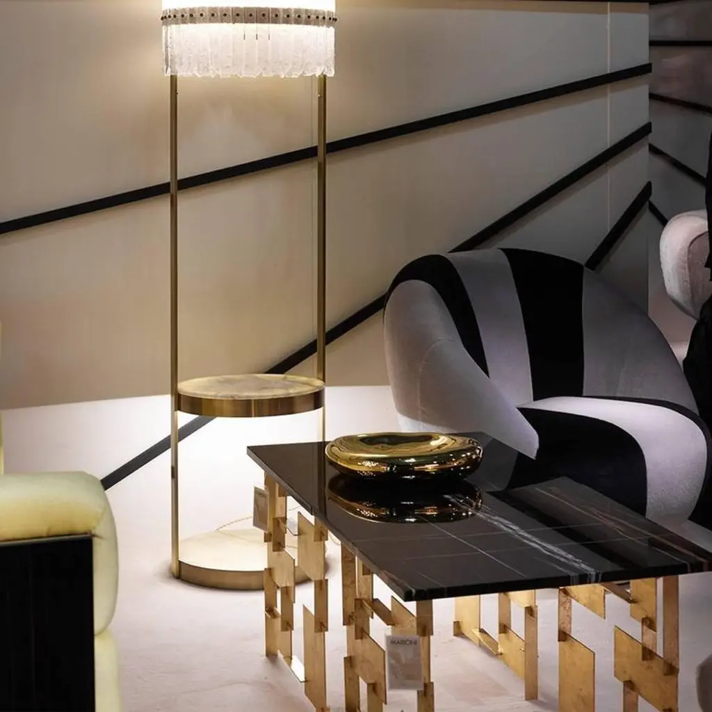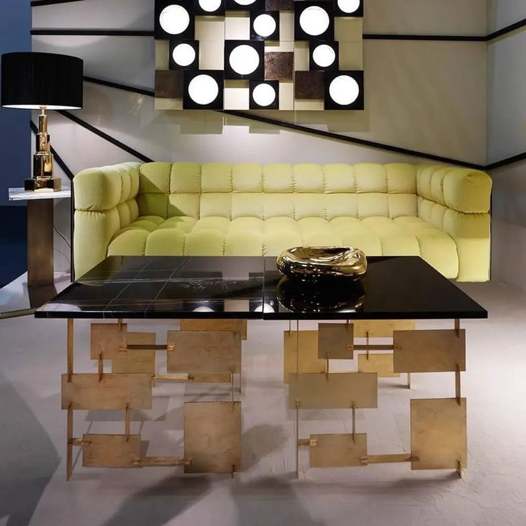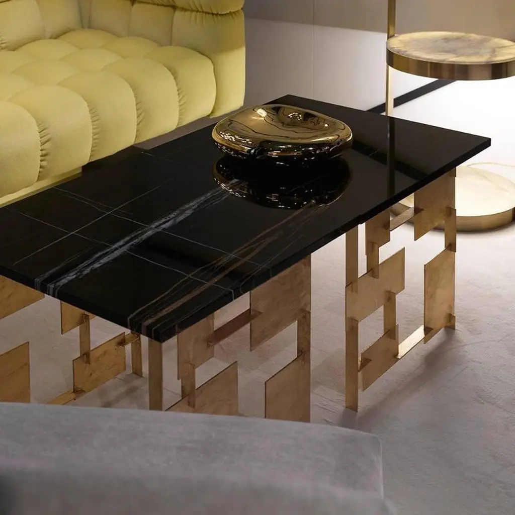Iron elements depict an abstract design decorated with metal sheets and with a black Marquinia marble top in this artistic furniture piece by Florentine designer Marioni.