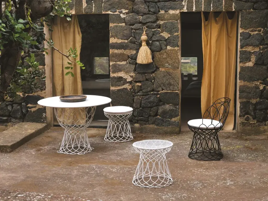 The Re-Trouvé collection originates in traditional forms rediscovered and reinterpreted with cleverness and originality by Patricia Urquiola. Re-Trouvé furniture conveys elegance and character in both classic contexts and contemporary settings. Geometric designs consisting of repeated diamond-shaped patterns create unusual and charming forms. Re-Trouvé blends naturally in every outdoor setting.