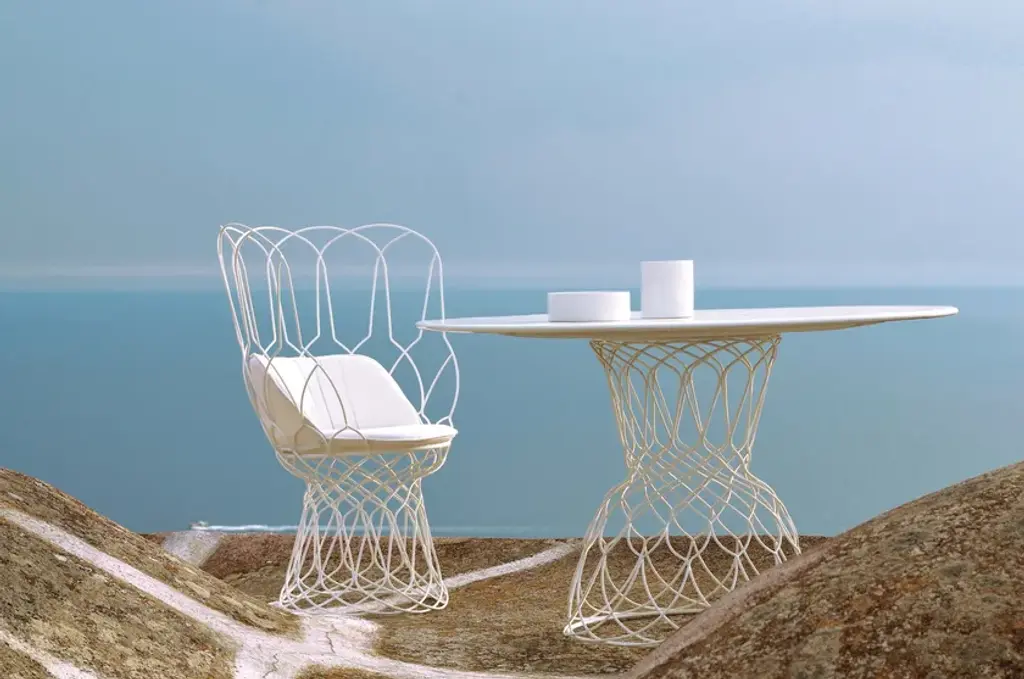 The Re-Trouvé collection originates in traditional forms rediscovered and reinterpreted with cleverness and originality by Patricia Urquiola. Re-Trouvé furniture conveys elegance and character in both classic contexts and contemporary settings. Geometric designs consisting of repeated diamond-shaped patterns create unusual and charming forms. Re-Trouvé blends naturally in every outdoor setting.
