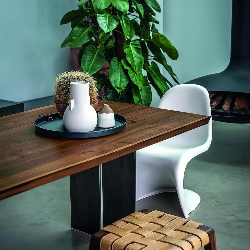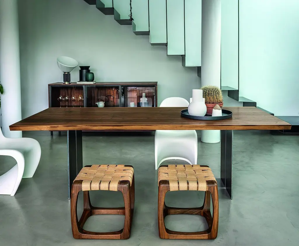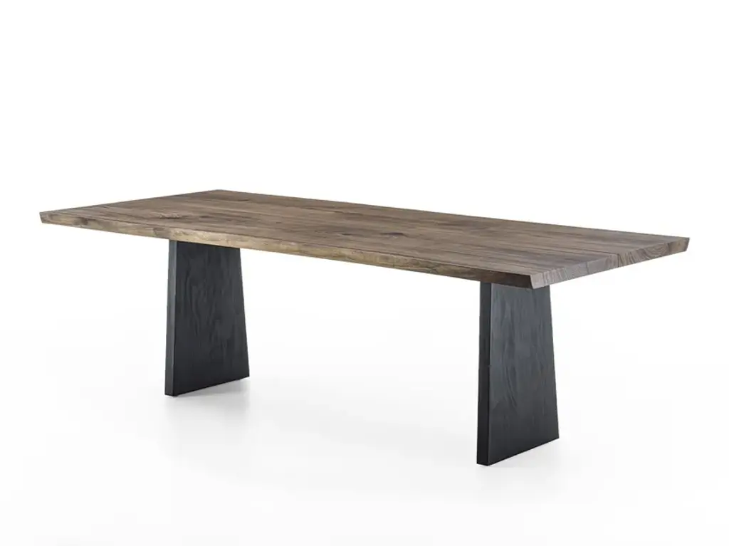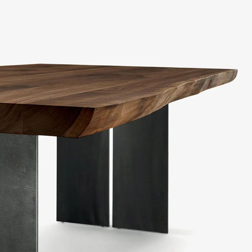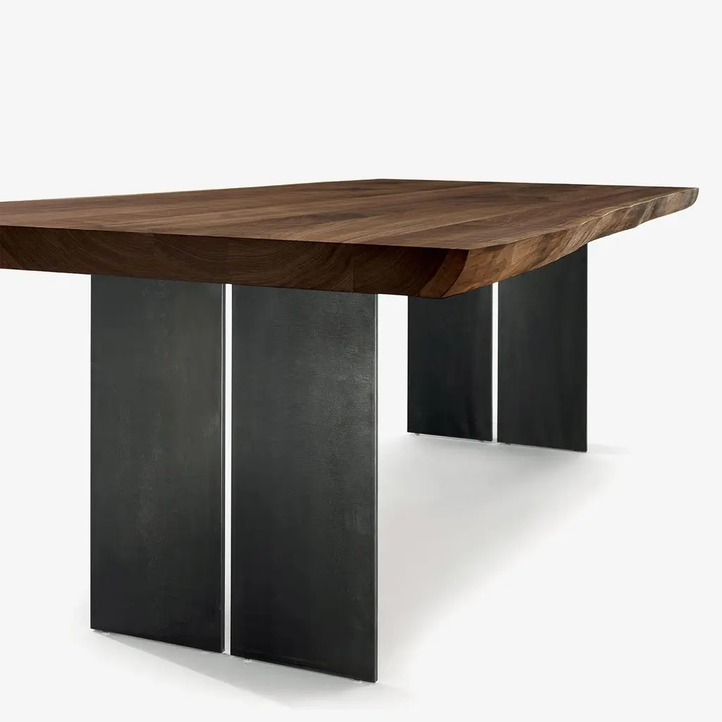 Table Real Edges and Steel with solid walnut top, 6.5 mm thickness and with real wood slats edges. With 2 steel feet which are both separatedby a small space.Feet in steel in oiled finish. Wood treated with natural pine wax.Available in: L 200 x D 100 x H 75cm, price: 8500,00€. L 220 x D 100 x H 75cm, price: 9200,00€. L 240 x D 100 x H 75cm, price: 9900,00€. L 260 x D 100 x H 75cm, price: 10700,00€. L 280 x D 100 x H 75cm, price: 11900,00€.