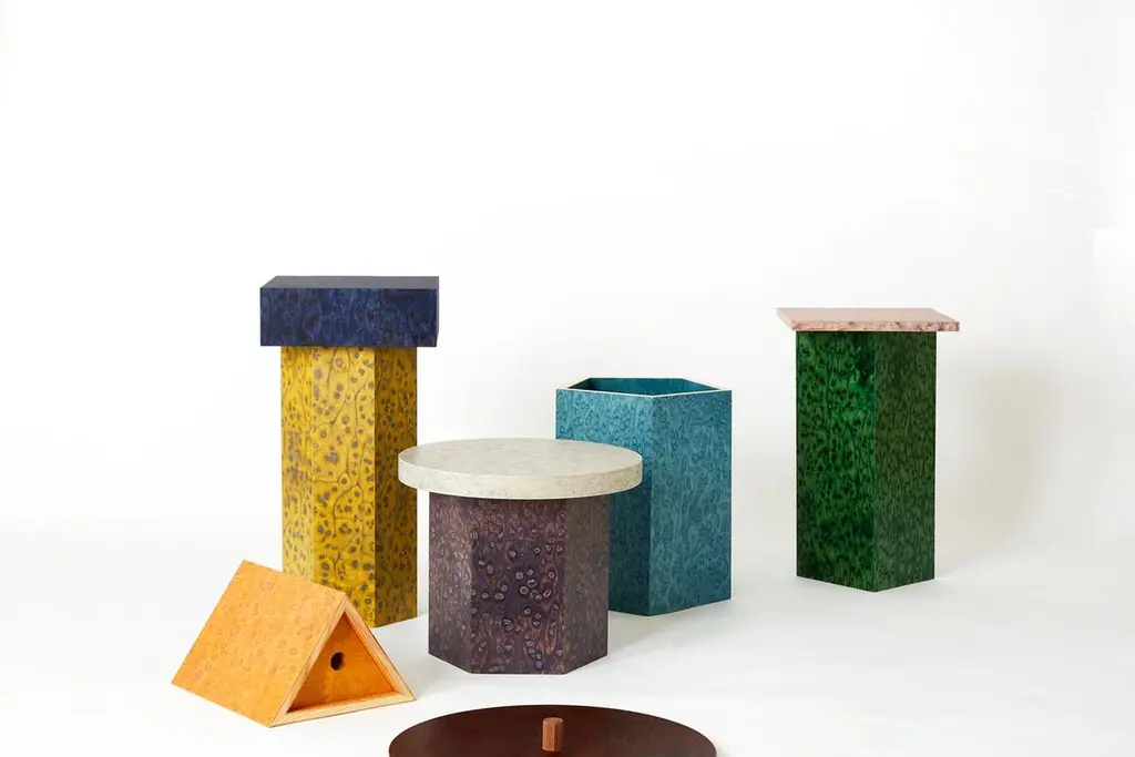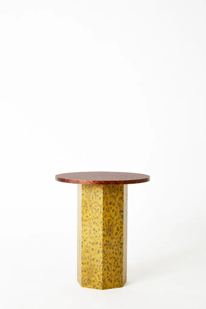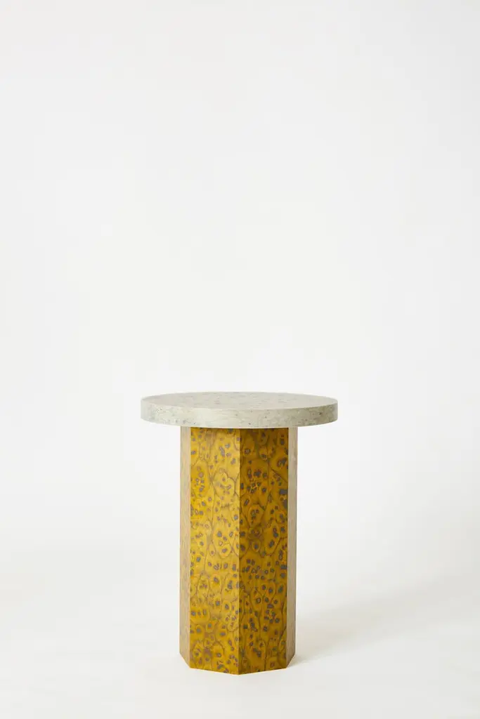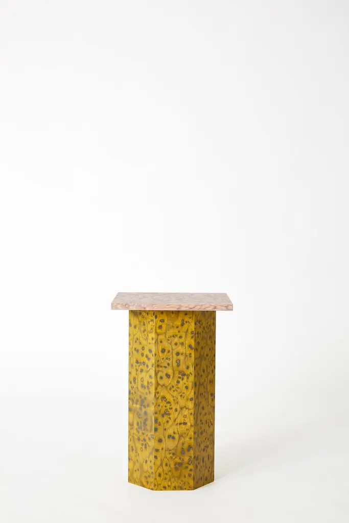 Rectangle Bold Osis Septagon Base Side Table by Llot LlovDimensions: 30 x 30 x H 60 cmMaterials: core board birchWith OSIS Edition 5, LLOT LLOV is deepening the understanding of the impact of salt and pigment. Colour and surface patterns dialogue with the shape of the modules. The tabletops can be exchanged with a hexagonal pin, allowing for variations of the harmonious color spectrum.The surface finish OSIS is an innovation developed by Llot Llov and is 100% handmade in Berlin.Behind the LLOT LLOV brand is the studio for product and interior design and the producer of furniture, objects, lighting, and surfaces. Since their foundation in 2006 by Ania Bauer and Jacob Brinck, the two Berlin-based author designers have established themselves internationally. One of their recognizable features is the reinterpretation of traditional arts and crafts brought into a contemporary design context.An example of this is OSIS, an innovative surface finish using salt crystals and color pigments on wood, with which they won the German Materials Prize, among other awards. They use OSIS and the terrazzo GLACIER, which was introduced in 2018 and is made of nail polish bottles, for their designs, but they also supply interior designers worldwide. Like other designs, GLACIER upcycles high-quality materials, such as those from the cosmetics industry. Their objects are manufactured in Europe, often in social workshops, and distributed directly by LLOT LLOV.LLOT LLOV produces exclusive furniture and objects for private or corporate clients and also manages interior design projects such as hotels or offices. In addition, the duo has been running a shop for fashion and accessories in Berlin-Mitte with BAERCK since 2007.