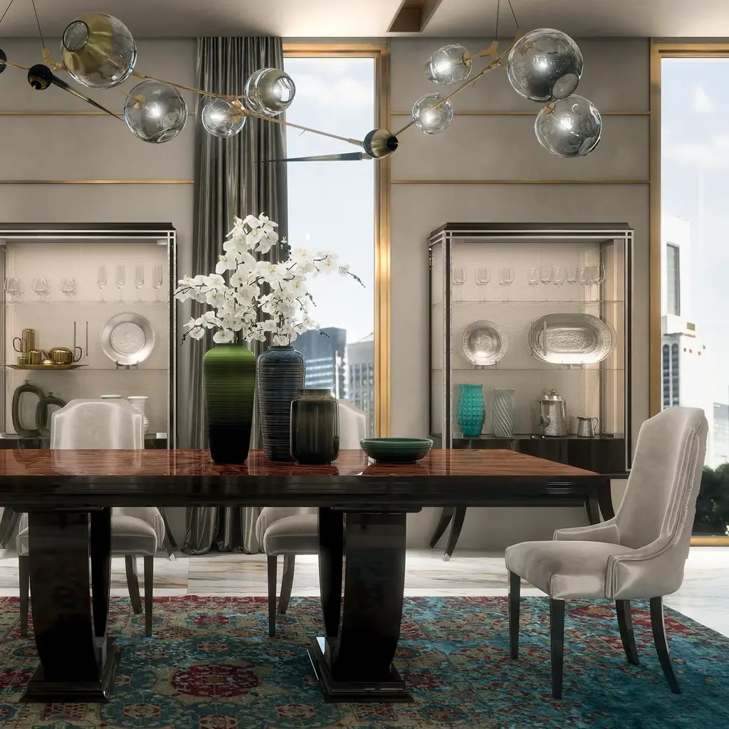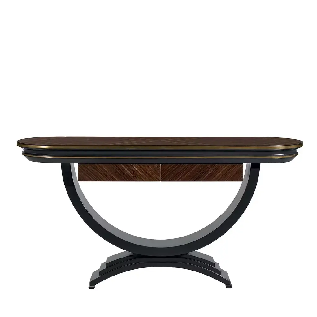 The attractive design of the new Oscar Collection adapts to settings with an exquisitely contemporary and cosmopolitan flavor. This Rectangular Table has a sturdy structure and features a splendid polished finish and silver leaf detail on the spectacular santos rosewood, resulting in a remarkable piece of refined taste, that expertly combines tradition and modernity.