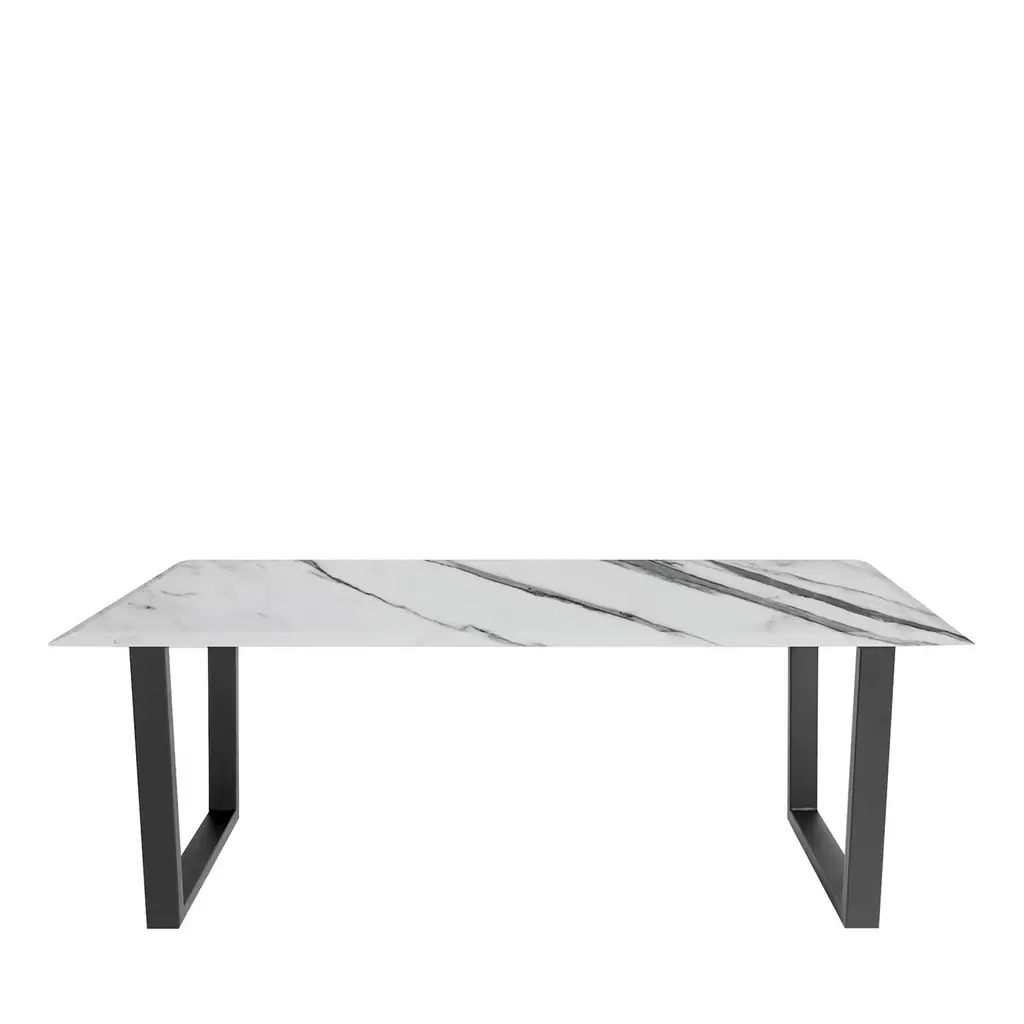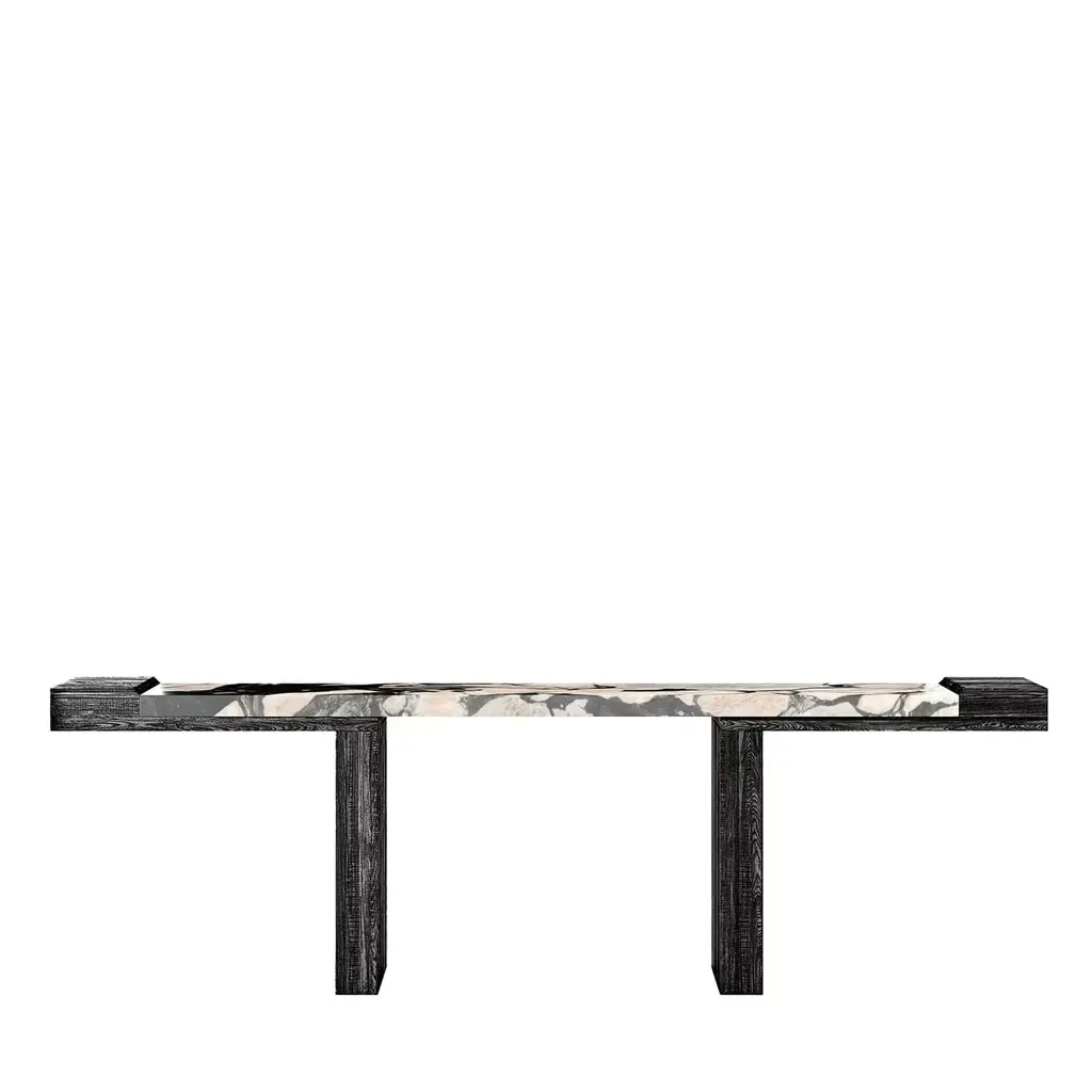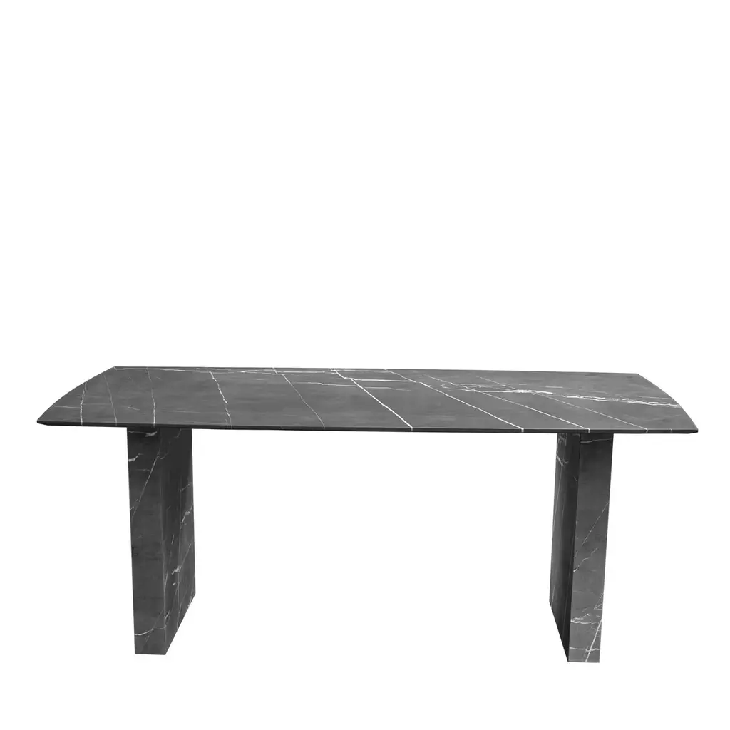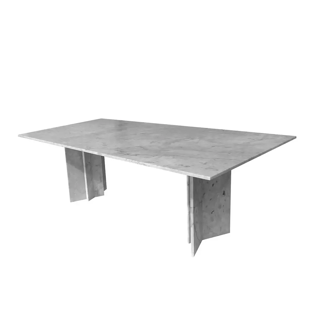 A majestic silhouette with a strong architectural flair defines this elegant table entirely crafted of white marble with a smooth, polished surface. The 2cm-thick rectangular top with beveled edges and unfinished underside stands on two sturdy, imposing angular legs. Please contact the Concierge for available customization in other colors and finish, and the possibility to extend the top (shown in 200x100 cm) up to 260x115 cm.