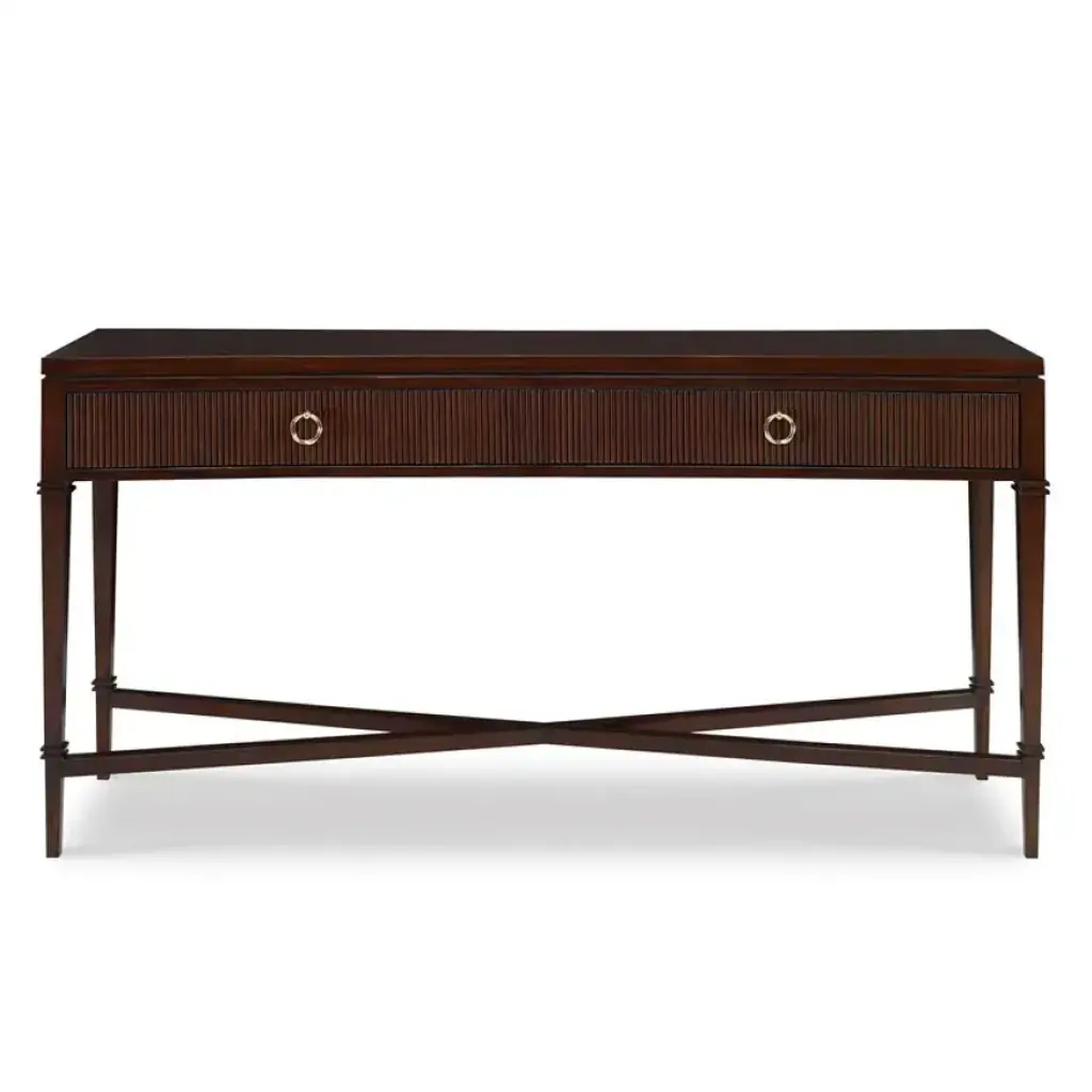 Crafted from Walnut, this concave console table features a reeded apron with two drawers. Tall tapering legs feature X stretchers. Brass hardware.