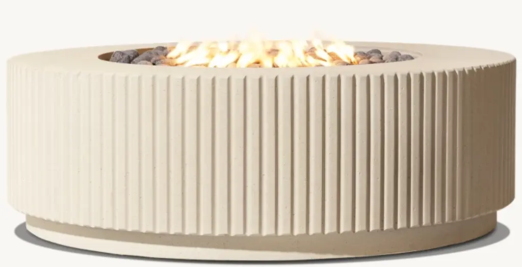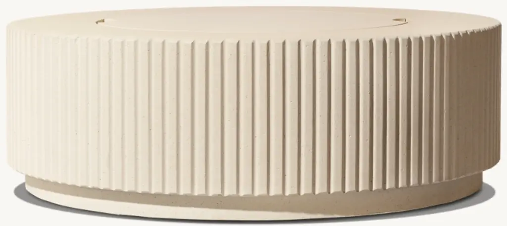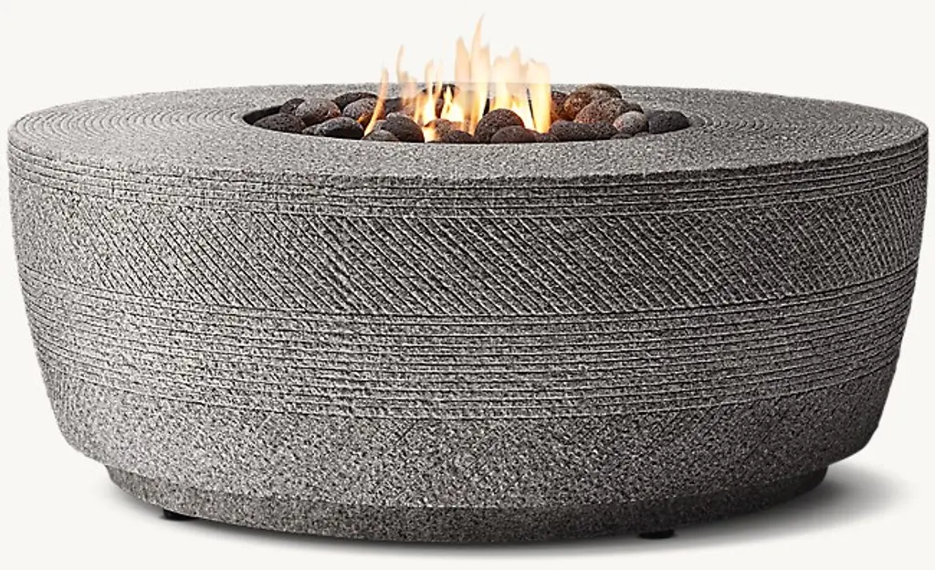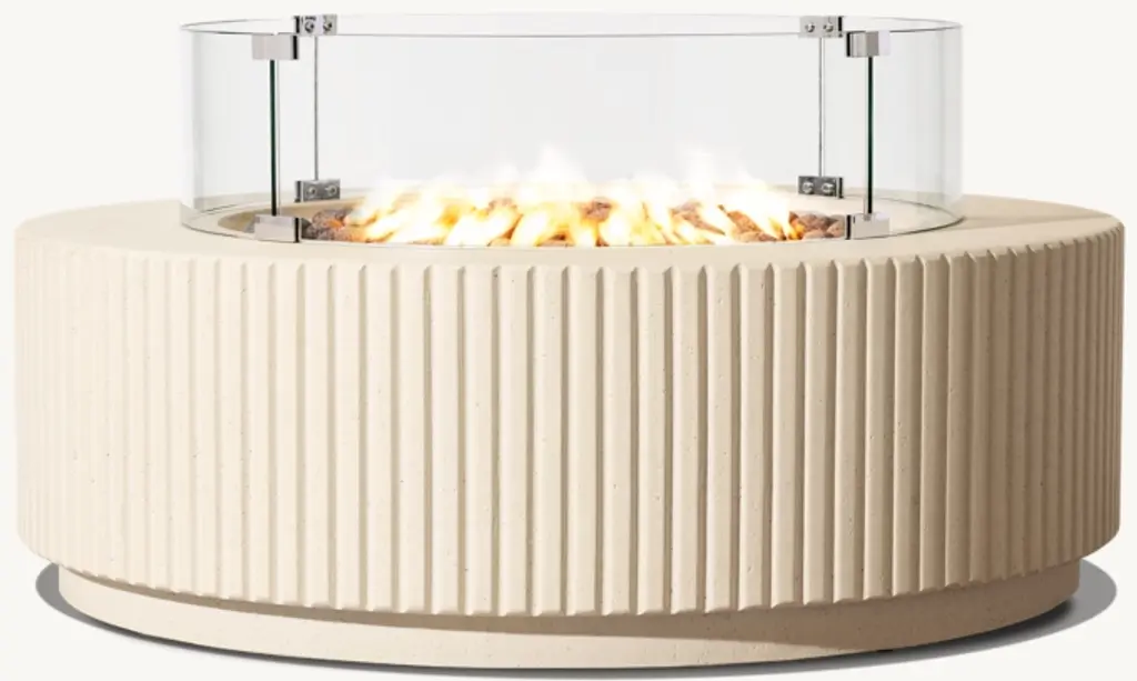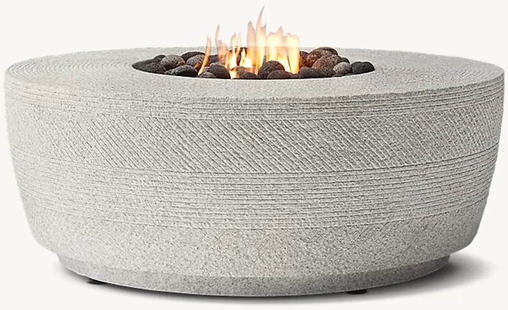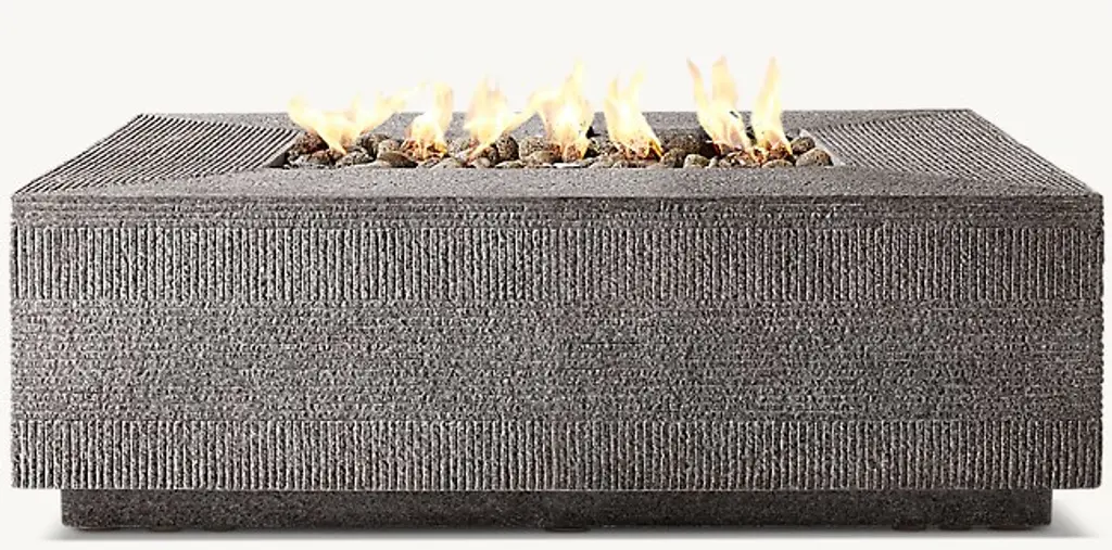 Rhythmic reeded detailing delivers textural dimension to our fire table's pared-down profile. Wrapped in radius curves for a fluid, organic feel, it's set on a plinth base that lightens the substantial silhouette. Handcrafted from weather-resistant composite concrete that offers a durable, lighter-weight alternative to stone or pure concrete.