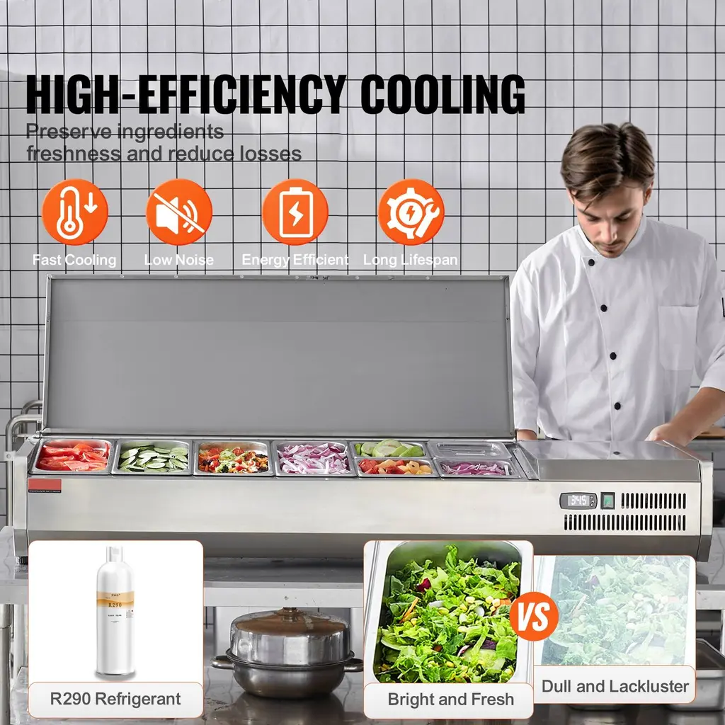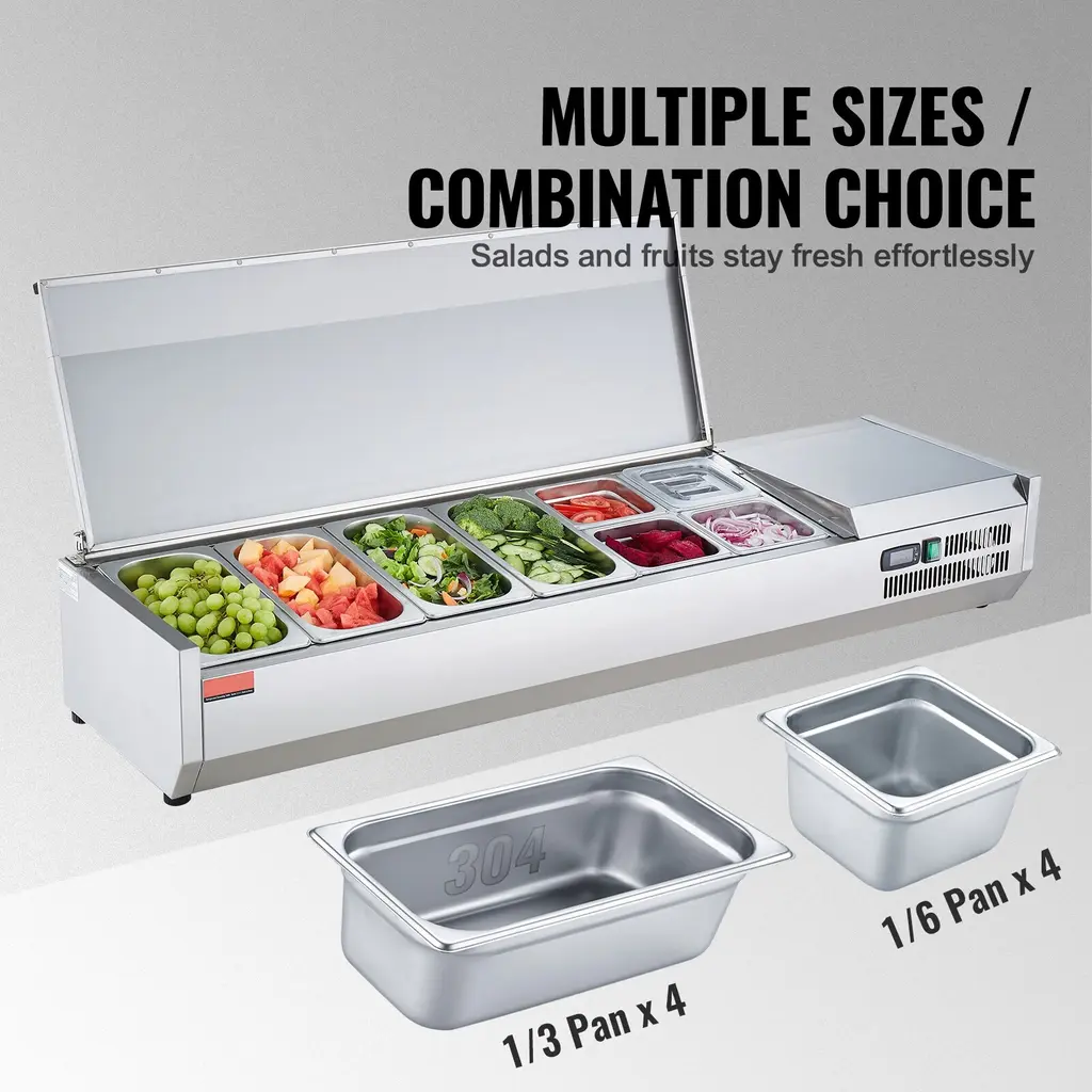 Efficient Cooling: Compressor ensures that condiments, sandwich toppings, and salad ingredients are kept at the proper temperature. Paired with R290 refrigerant, it offers reliable cooling effects, locks in the nutrients and moisture of the food, and operates quietly and efficiently. It is undoubtedly an ideal choice for commercial use. Please ensure the electrical environment is suitable—voltage frequency AC115V 60Hz, rated current 1.95A. Modular Tray System: Our refrigerated condiment station features 5 1/3 pans (160W option)/4 1/3 pans (150W option) /1 1/3 pan(130W option) and 4 1/6 pans, increasing capacity for flexible use. Removable dividers help you reasonably segregate the areas to prevent flavor crossover and keep ingredients fresher. Made from 304 stainless steel and includes PC material bins with sealing lids to prevent dust and insects. Safe and reliable, you can also choose different sized pans as needed to meet your diverse food storage & display requirements. One-Touch Defrost: The refrigerated condiment prep station has a real-time temperature display for more accurate control. The digital LED panel shows precise temperatures, which you can set between 35.6 ℉ and 46.4 ℉. Additionally, it features a one-touch defrost function to ensure smooth airflow in the water tank, eliminating the hassle of manual defrosting and reducing condensation. Stainless Steel Guard: Our refrigerated condiment station equipped with a removable stainless steel hinged lid for easy access, further preventing dust, dirt from entering, locking in the cold to keep food fresh and clean when not in use. Durable and Easy to Maintain: CE/ETL certified for quality assurance, The refrigerated condiment prep station featuring a 201 stainless steel base and frame that resists corrosion and rust. It also provides extra space for tools/utensils, secure heat dissipation. Please note it should be used during business hours to maintain the low temperature and freshness of pre-cooled food, and not for continuous or extended storage. Package Content 1 x Countertop Refrigerated Prep Station 1 x Instruction Manual