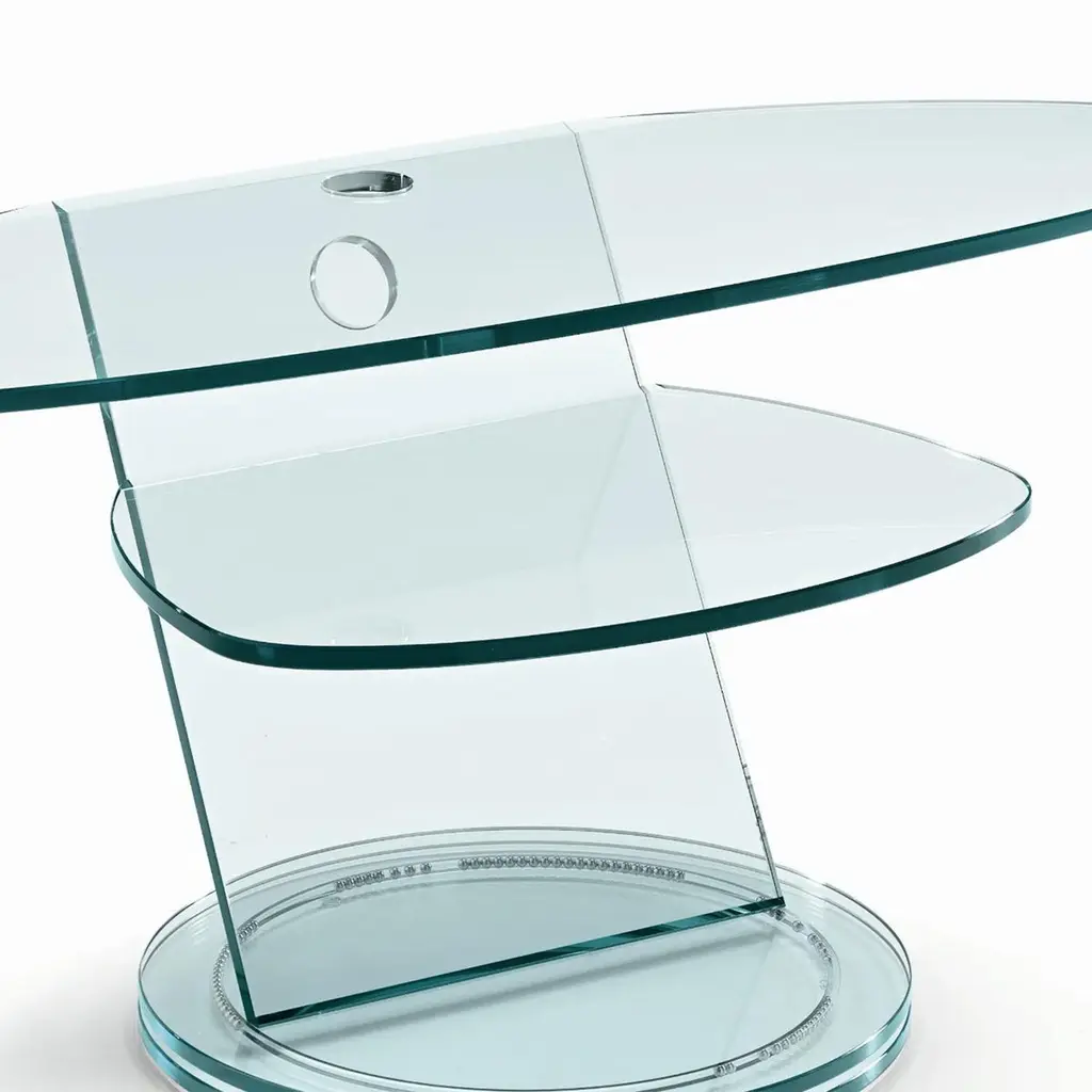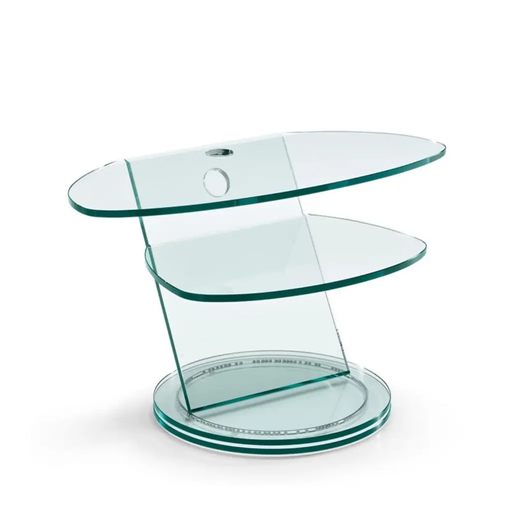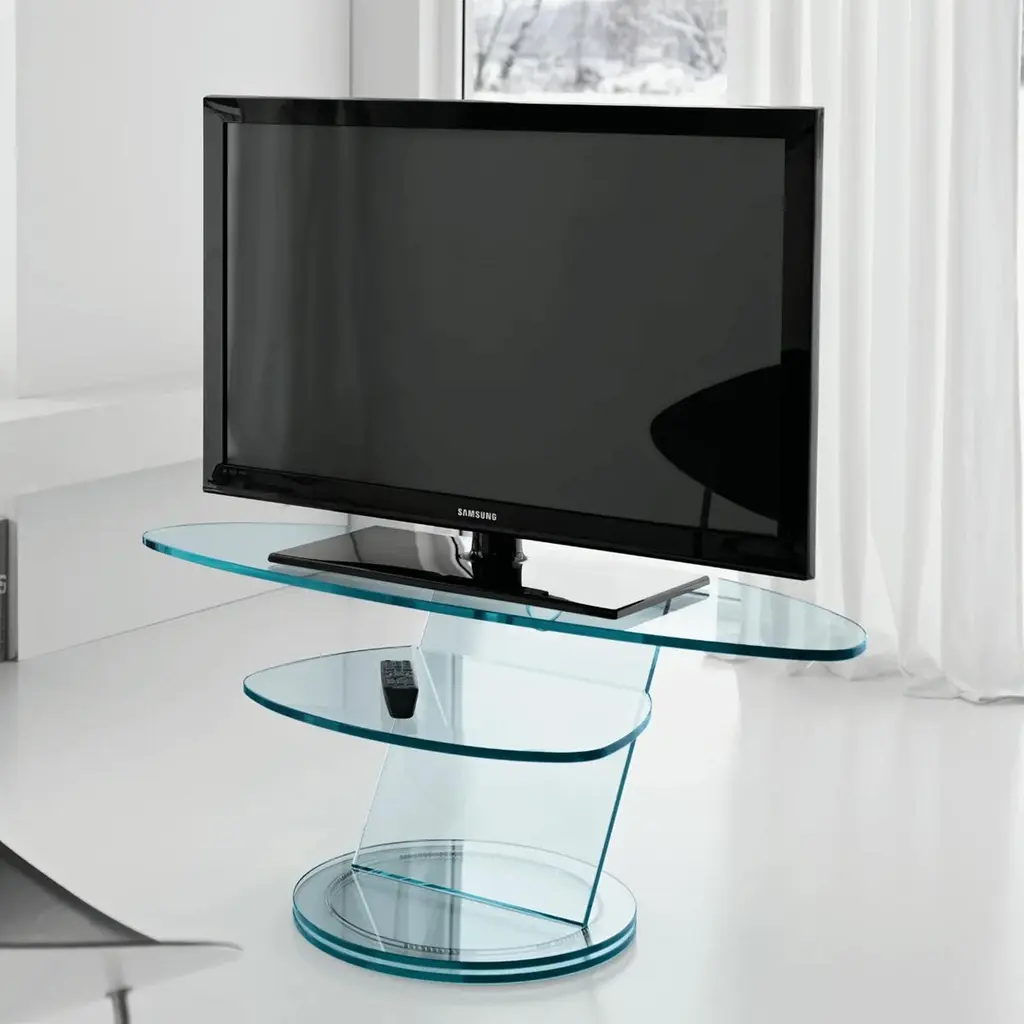 Table Stand Replay TV with all structure in transparent glasswith double top on a revolving base with ball bearing system.Also available on request in:L90xD52xH50cm, price: 3400,00€.