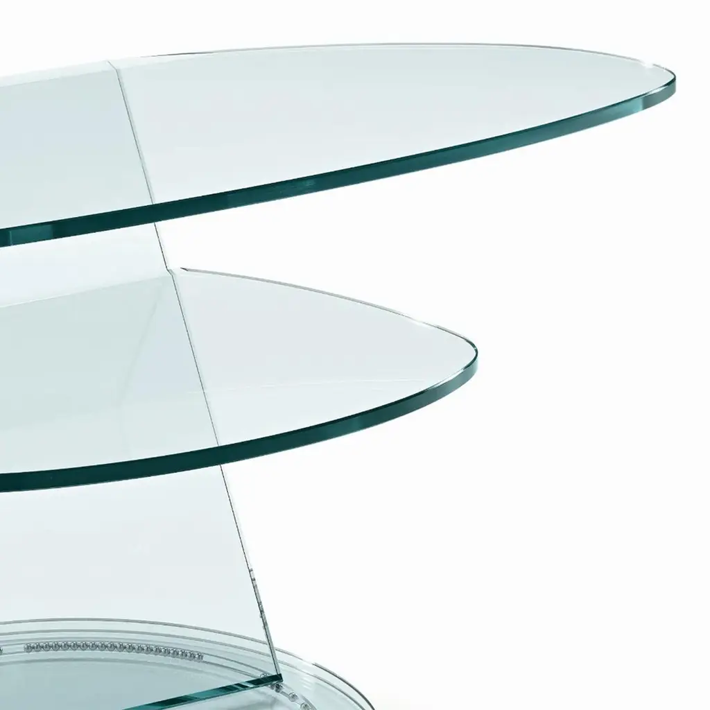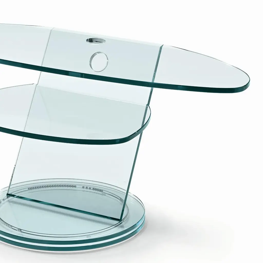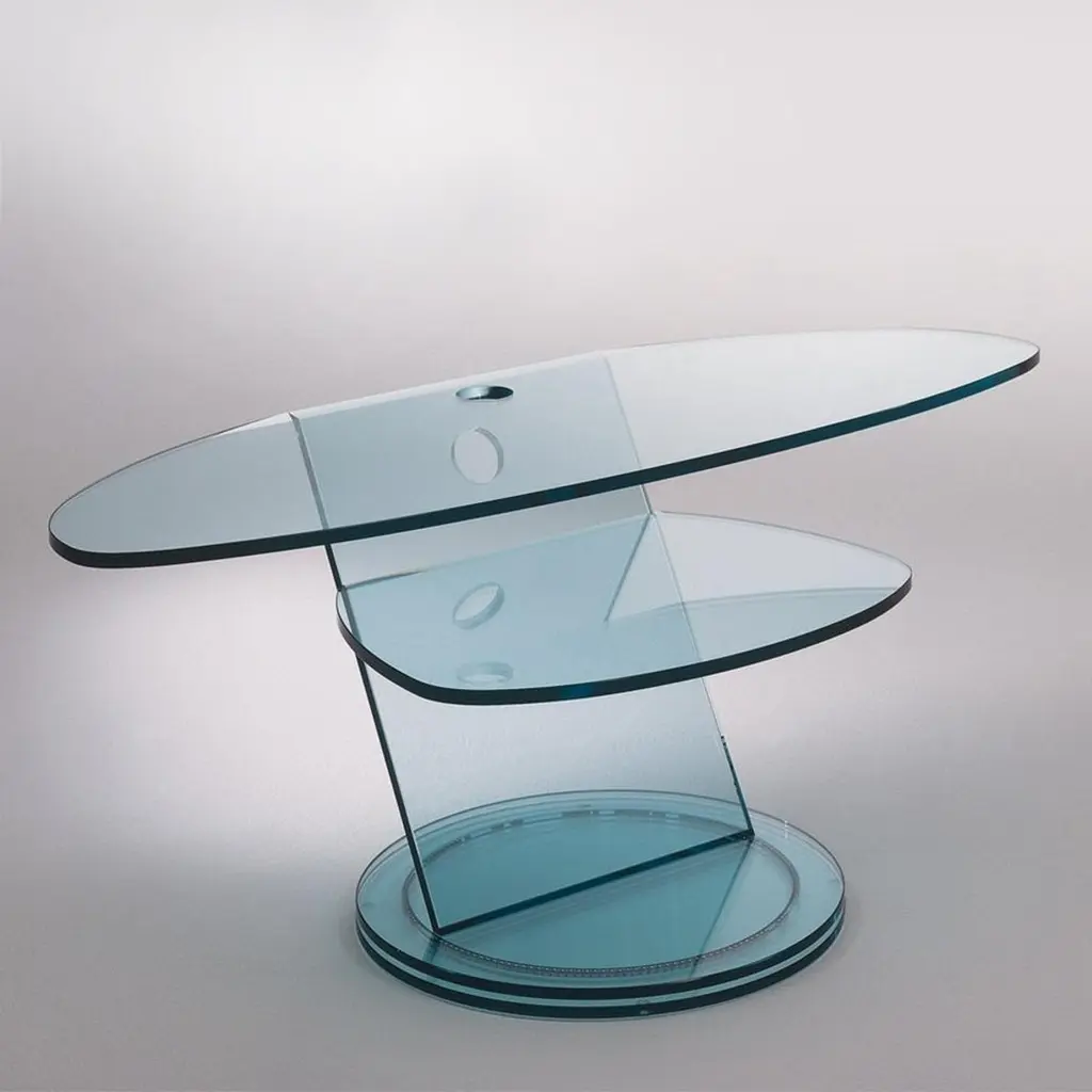 Table Stand Replay TV with all structure in transparent glasswith double top on a revolving base with ball bearing system.Also available on request in:L90xD52xH50cm, price: 3400,00€.