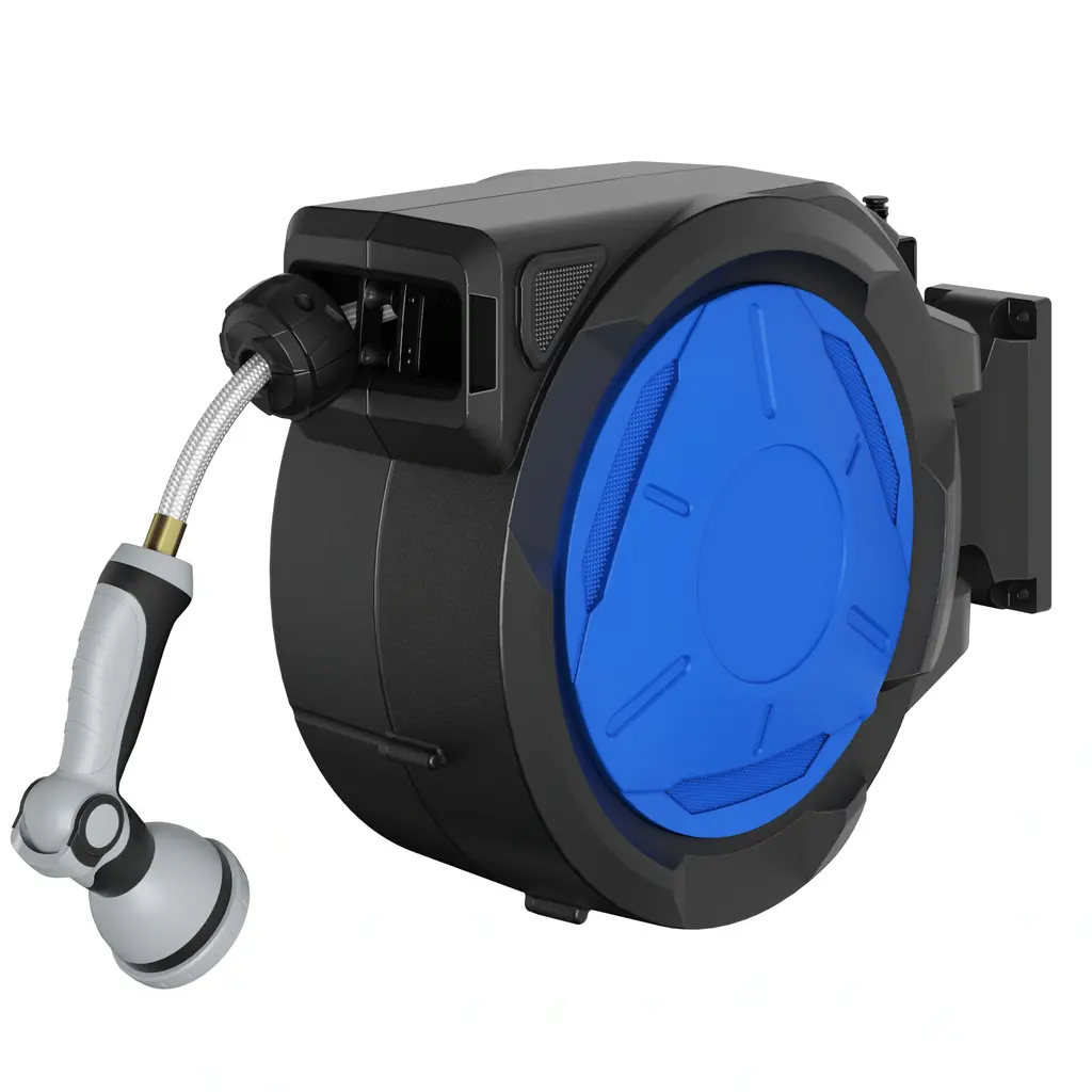 Wall Mounted Retractable Garden Hose Reel - 65ft with 9-Function Nozzle, 180¡ã Swivel & Slow Return SystemBrand: TROPOWHose Length: 100ft (1/2" diameter)Reel Dimensions: 20.67"L x 11.81"WWeight: 26.95 lbsMaterial: Heavy-duty ABS casing + metal swivel bracketIncluded Components: Hose reel, 9-pattern nozzle, wall mount kit, bolts, manualKey Features1. Smart Retraction System Auto-rewind mechanism with slow-return technology prevents hose slapping Any-length locking - stops at desired position with secure click-lock 2. Professional-Grade Nozzle 9 adjustable spray patterns:? Jet ? Shower ? Mist ? Flat ? Soaker? Cone ? Center ? Triangle ? Rinse 3. Enhanced Mobility 180¡ã swivel bracket provides full-range watering coverage Wall-mounted design saves patio/garden space 4. Kink-Free Performance Commercial-grade 1/2" hose resists tangles and abrasions Smooth retraction even when fully extended 5. Complete Installation Kit Includes all mounting hardware for quick setup Heavy-duty construction withstands outdoor elements Why Choose This Hose Reel?? No more hose tangles - automatic self-storage? Versatile watering - 9 precision spray options? Durable construction - weather-resistant materials? Full-range access - 180¡ã pivot reaches all areas