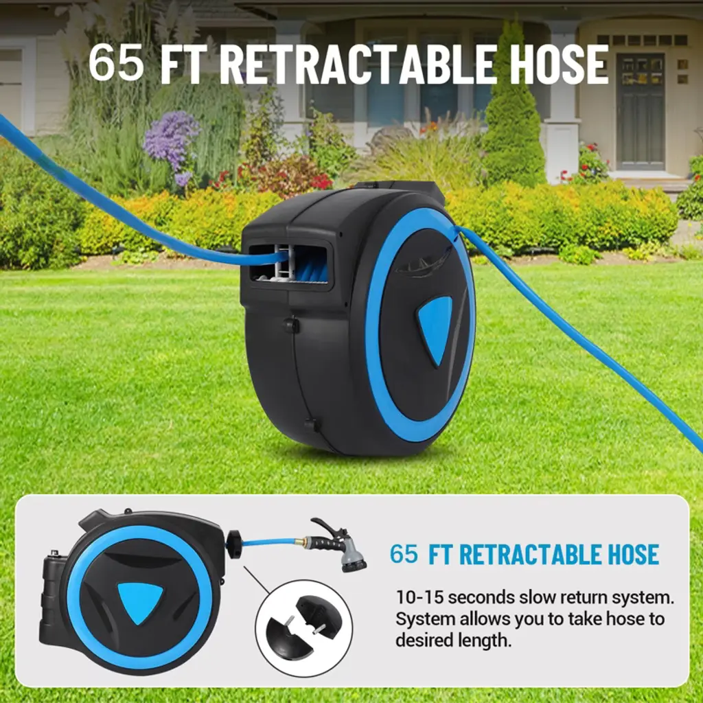 Retractable Garden Hose Reel - 1/2 In X 65 Ft Wall Mounted, 9-function Nozzle, Any Length Lock, Slow Return, 180â° Swivel Bracket
