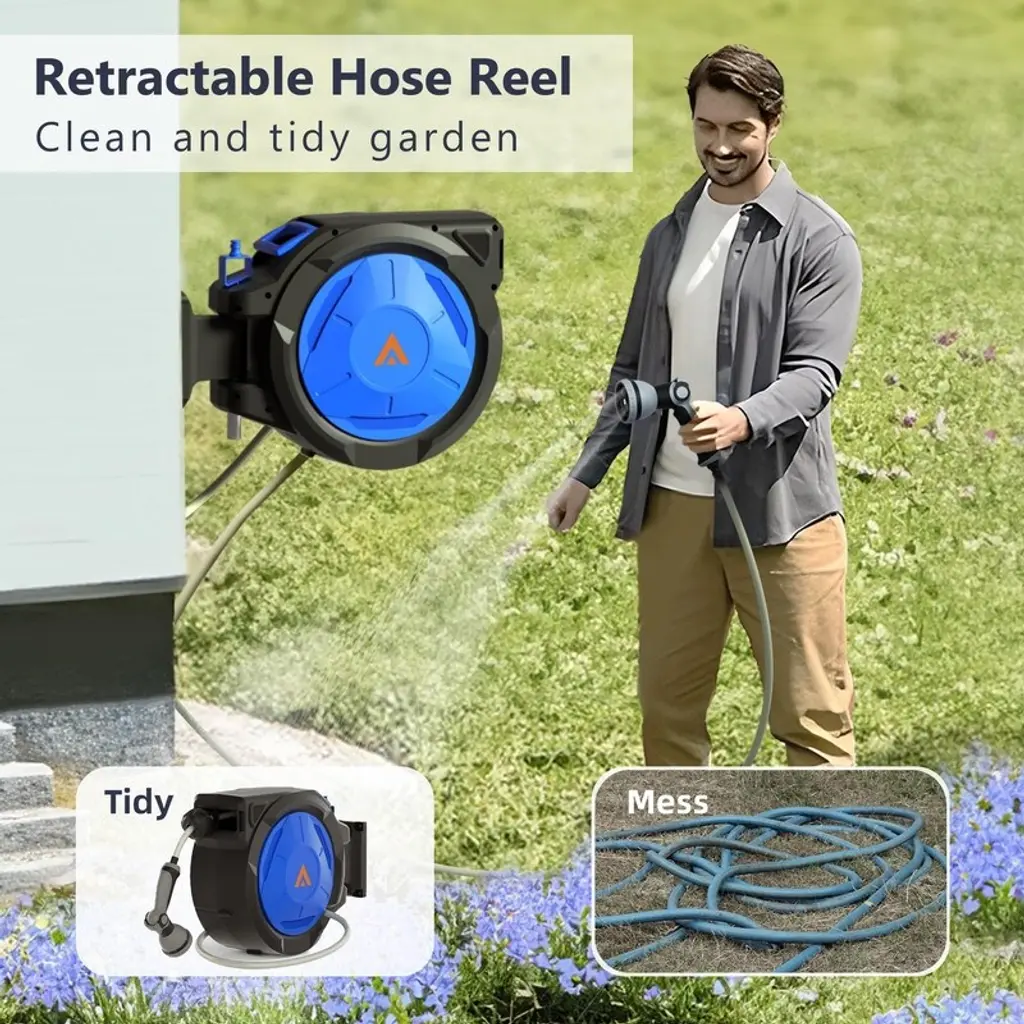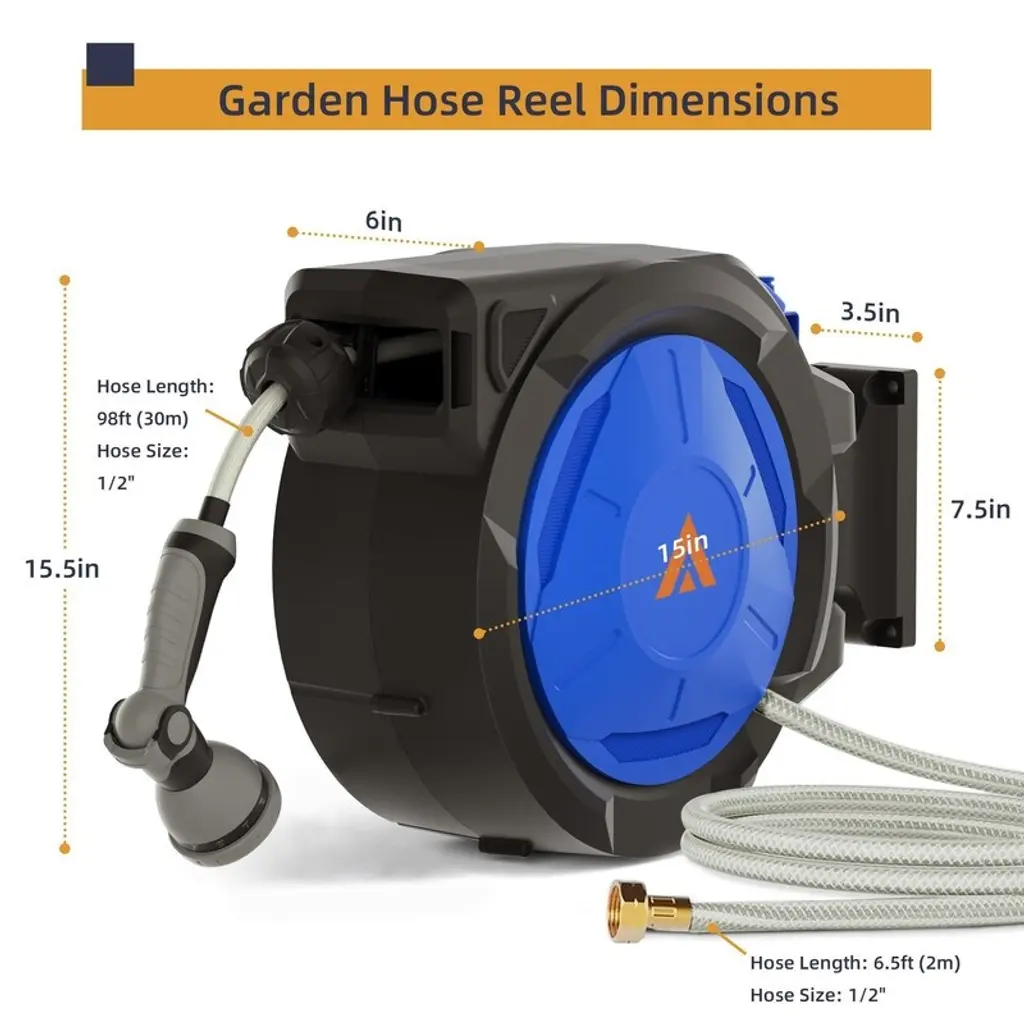 Retractable Garden Hose Reel, 1/2"x 112 Ft Hose Reel Wall Mounted 10 Pattern Nozzle, Any Length Lock, Slow-Rewind Return System - Blue - Plastic