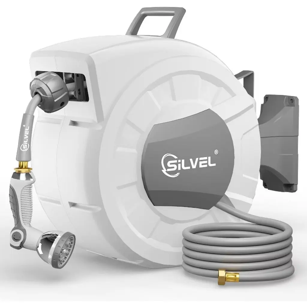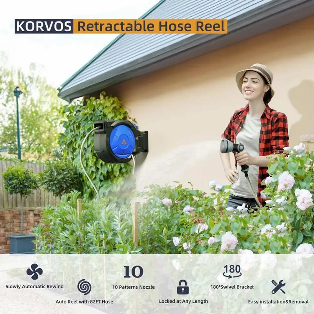 【Any Length Lock & Slow Retraction System】When using this retractable garden hose reel, you can pull the hose and stop at any position. After you are done using it, just pull the hose forward a little and it will slowly retract to the box, saving you time and trouble in tidying up, making your garden tidying up work easier! 【High-quality Hose & Sturdy Performance】The hose reel adopts an all-weather flexible, wear-resistant hybrid hose, which is durable and leak-proof. The shell is made of sturdy PP and is UV-resistant, which is very suitable for outside. Our 112-foot, 1/2-inch retractable hose reels for outside can well withstand up to 200 PSI water pressure. 【10 Pattern Nozzle】The nozzle of our retractable hose reel has 10 different patterns to meet your different needs, including garden watering, car washing, pet bathing. Just flip the rear lock and the handle will open continuously without long-term hand pressure. 【Easy to Install & 180° Rotating Bracket】Our hose reel wall mounted can be easily installed. Fix the bracket first, mark the screw position, and drill four holes (M12*60) on the wall. Use 4 self-adhesive screws to fix the bracket accordingly. Fix the reel to the mounting bracket. After installation, the retractable hose reel can be rotated 180° horizontally to cover a larger area. 【High-quality after-sales service】A full set of hardware support, including the wall mount brackets and expansion bolts required for installation, no need to purchase separately, we will also attach a detailed product installation manual to save your valuable time